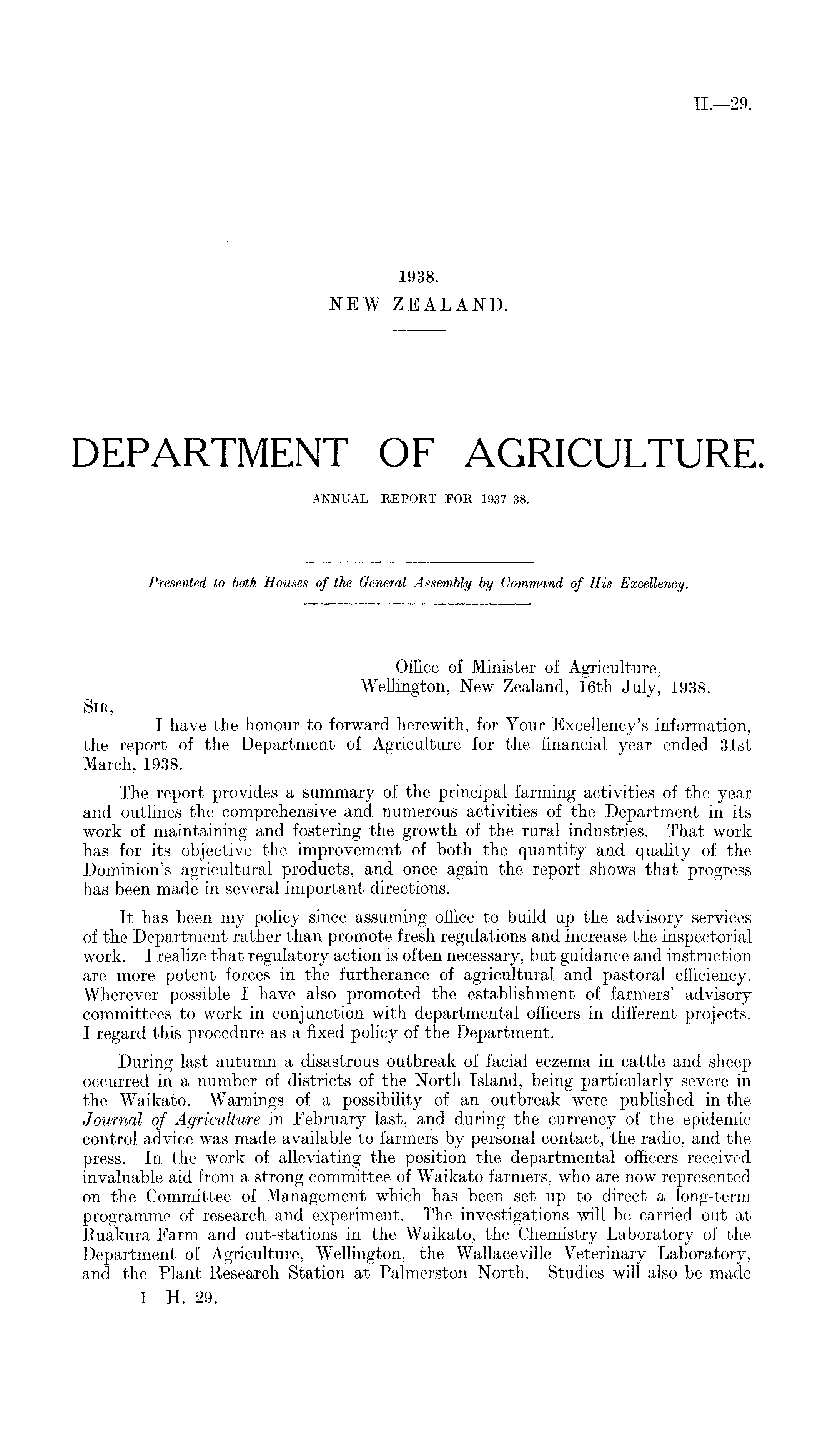 Office of Minister of Agriculture, Wellington, New Zealand, 16th July, 1938. Sir, — I have the honour to forward herewith, for Your Excellency's information, the report of the Department of Agriculture for the financial year ended 31st March, 1938. The report provides a summary of the principal farming activities of the year and outlines the comprehensive and numerous activities of the Department in its work of maintaining and fostering the growth of the rural industries. That work has for its objective the improvement of both the quantity and quality of the Dominion's agricultural products, and once again the report shows that progress has been made in several important directions. It has been my policy since assuming office to build up the advisory services of the Department rather than promote fresh regulations and increase the inspectorial work. I realize that regulatory action is often necessary, but guidance and instruction are more potent forces in the furtherance of agricultural and pastoral efficiency. Wherever possible I have also promoted the establishment of farmers' advisory committees to work in conjunction with departmental officers in different projects. I regard this procedure as a fixed policy of the Department. During last autumn a disastrous outbreak of facial eczema in cattle and sheep occurred in a number of districts of the North Island, being particularly severe in the Waikato. Warnings of a possibility of an outbreak were published in the Journal of Agriculture in February last, and during the currency of the epidemic control advice was made available to farmers by personal contact, the radio, and the press. In the work of alleviating the position the departmental officers received invaluable aid from a strong committee of Waikato farmers, who are now represented on the Committee of Management which has been set up to direct a long-term programme of research and experiment. The investigations will be carried out at Ruakura Farm and out-stations in the Waikato, the Chemistry Laboratory of the Department of Agriculture, Wellington, the Wallaceville Veterinary Laboratory, and the Plant Research Station at Palmerston North. Studies will also be made