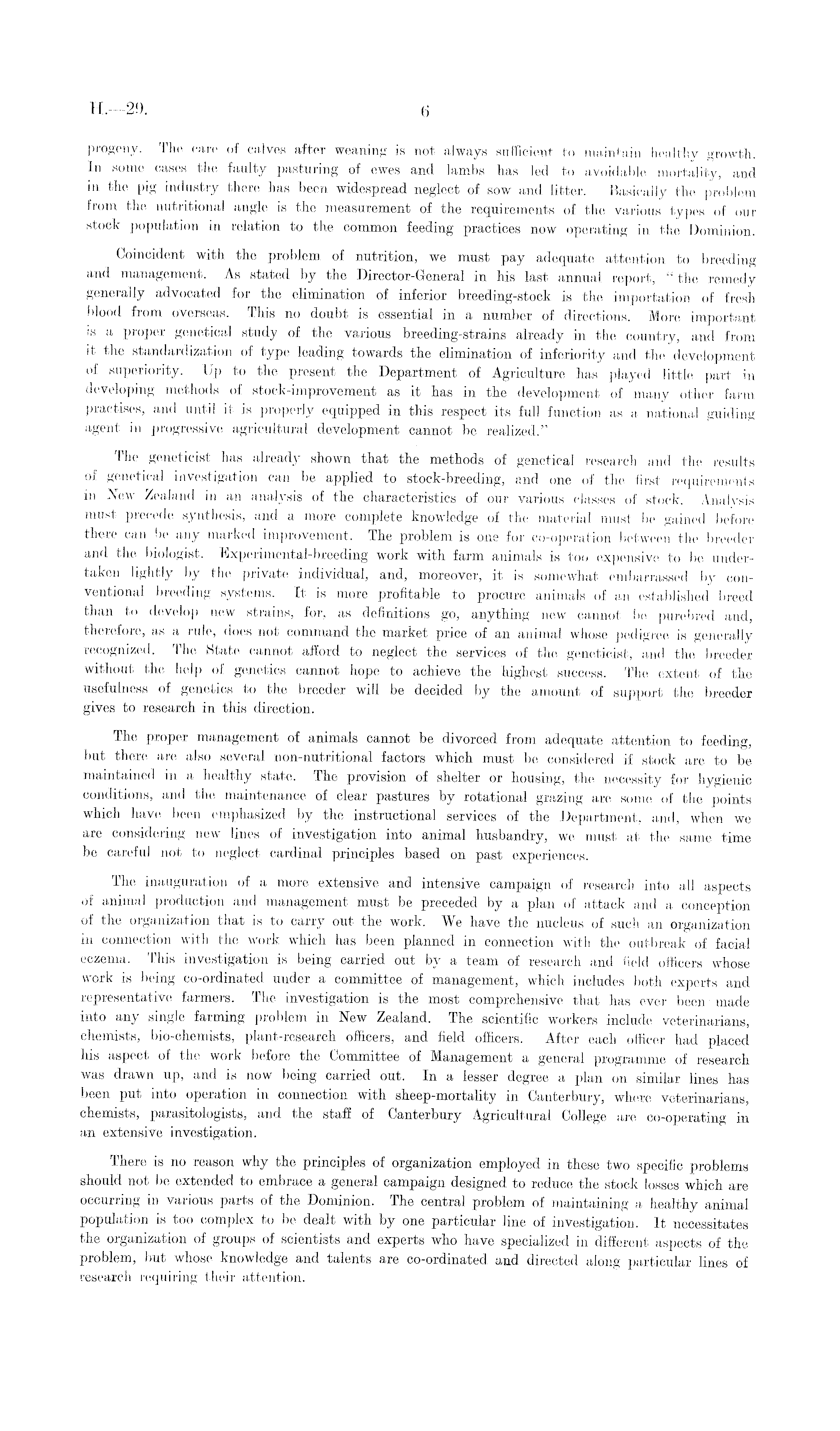 progeny. The care of calves after weaning is not always sufficient to maintain healthy growth. In. some cases the faulty pasturing of ewes and lambs has led to avoidable mortality, and in the pig industry there has been widespread neglect of sow and litter. Basically the problem from the nutritional angle is the measurement of the requirements of the various types of our stock population in relation to the common feeding practices now operating in the Dominion. Coincident with the problem of nutrition, we must pay adequate attention to breeding and management. As stated by the Director-General in his last annual report, " the remedy generally advocated for the elimination of inferior breeding-stock is the importation of fresh blood from overseas. This no doubt is essential in a number of directions. More important is a proper genetical study of the various breeding-strains already in the country, and from it the standardization of type leading towards the elimination of inferiority and the development of superiority. Up to the present the Department of Agriculture has played little part in developing methods of stock-improvement as it has in the development of many other farm practises, and until it is properly equipped in this respect its full function as a national guiding agent in progressive agricultural development cannot be realized." The geneticist has already shown that the methods of genetical research and the results of genetical investigation can be applied to stock-breeding, and one of the first requirements in New Zealand in an analysis of the characteristics of our various classes of stock. Analysis must precede synthesis, and a more complete knowledge of the material must be gained before there can be any marked improvement. The problem is one for co-operation between the breeder and the biologist. Experimental-breeding work with farm animals is too expensive to be undertaken lightly by the private individual, and, moreover, it is somewhat embarrassed by conventional breeding systems. It is more profitable to procure animals of an established breed than to develop new strains, for, as definitions go, anything new cannot be purebred and, therefore, as a rule, does not command the market price of an animal whose pedigree is generally recognized. The State cannot afford to neglect the services of the geneticist, and the breeder without the help of genetics cannot hope to achieve the highest success. The extent of the usefulness of genetics to the breeder will be decided by the amount of support the breeder gives to research in this direction. The proper management of animals cannot be divorced from adequate attention to feeding, but there are also several non-nutritional factors which must be considered if stock are to be maintained in a healthy state. The provision of shelter or housing, the necessity for hygienic conditions, and the maintenance of clear pastures by rotational grazing are some of the points which have been emphasized by the instructional services of the Department, and, when we are considering new lines of investigation into animal husbandry, we must at the same time be careful not to neglect cardinal principles based on past experiences. The inauguration of a more extensive and intensive campaign of research into all aspects of animal production and management must be preceded by a plan of attack and a conception of the organization that is to carry out the work. We have the nucleus of such an organization in connection with the work which has been planned in connection with the outbreak of facial eczema. This investigation is being carried out by a team of research and field officers whose work is being co-ordinated under a committee of management, which includes both experts and representative farmers. The investigation is the most comprehensive that has ever been made into any single farming problem in New Zealand. The scientific workers include veterinarians, chemists, bio-chemists, plant-research officers, and field officers. After each officer had placed his aspect of the work before the Committee of Management a general programme of research was drawn up, and is now being carried out. In a lesser degree a plan on similar lines has been put into operation in connection with sheep-mortality in Canterbury, where veterinarians, chemists, parasitologists, and the stafi of Canterbury Agricultural College are co-operating in an extensive investigation. There is no reason why the principles of organization employed in these two specific problems should not be extended to embrace a general campaign designed to reduce the stock losses which are occurring in various parts of the Dominion. The central problem of maintaining a healthy animal population is too complex to be dealt with by one particular line of investigation. It necessitates the organization of groups of scientists and experts who have specialized in different aspects of the problem, but whose knowledge and talents are co-ordinated, and directed along particular lines of research requiring their attention.