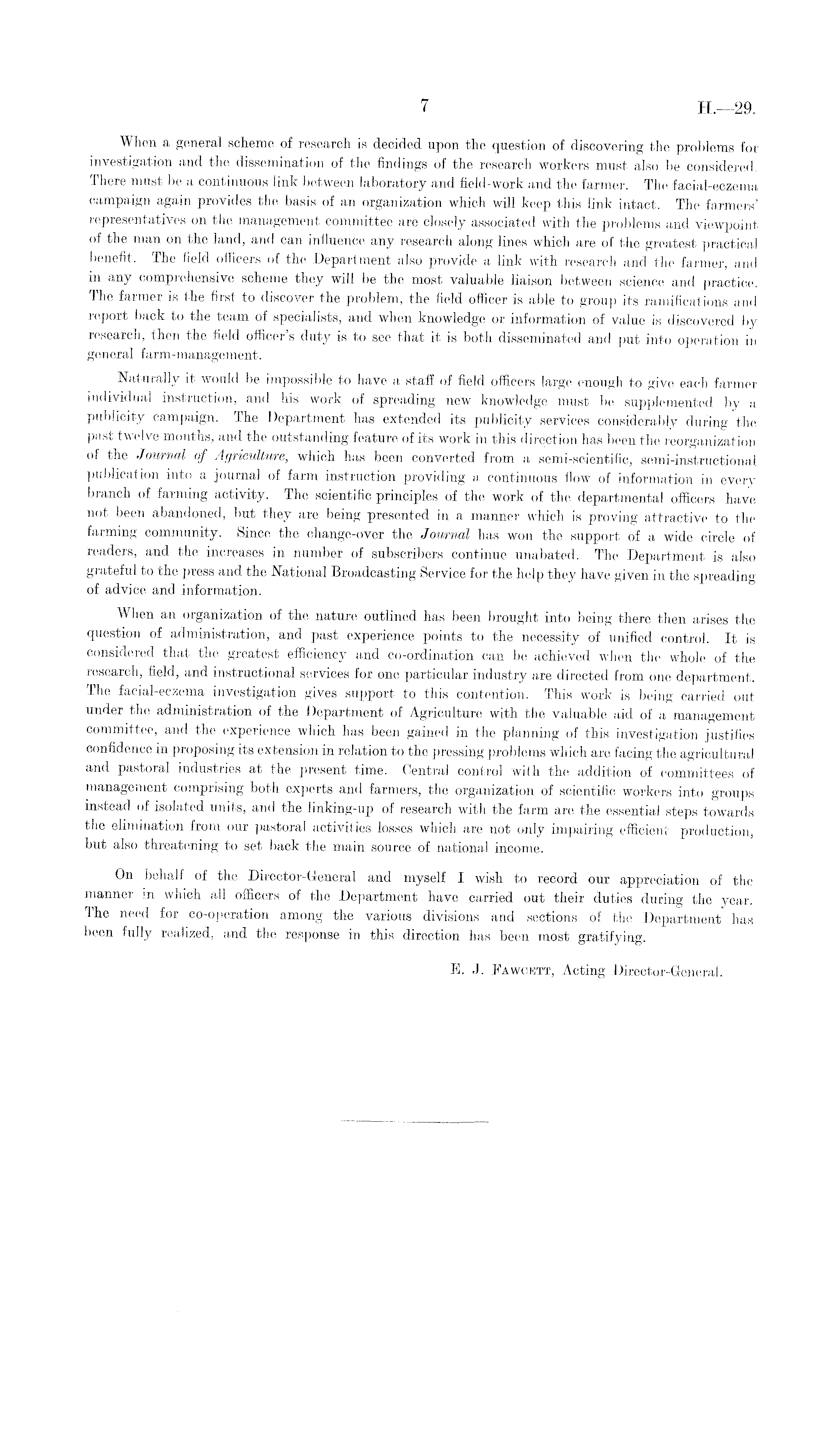 When a general scheme of research is decided upon the question of discovering the problems for investigation and the dissemination of the findings of the research workers must also be considered. There must be a continuous link between laboratory and field-work and the farmer. The facial-eczema campaign again provides the basis of an organization which will keep this link intact. The farmers' representatives on the management committee are closely associated with the problems and viewpoint of the man on the land, and can influence any research along lines which are of the greatest practical benefit. The field officers of the Department also provide a link with research and the farmer, and in any comprehensive scheme they will be the most valuable liaison between science and practice. The farmer is the first to discover the problem, the field officer is able to group its ramifications and report back to the team of specialists, and when knowledge or information of value is discovered by research, then the field officer s duty is to see that it is both disseminated and put into operation in general farm-management. Naturally it would be impossible to have a staff of field officers large enough to give each farmer individual instruction, and his work of spreading new knowledge must be supplemented by a publicity campaign. The Department has extended its publicity services considerably during the past twelve months, and the outstanding feature of its work in this direction has been the reorganization of the Journal of Agriculture, which has been converted from a semi-scientific, semi-instructional publication into a journal of farm instruction providing a continuous flow of information in every branch of farming activity. The scientific principles of the work of the departmental officers have not been abandoned, but they are being presented in a manner which is proving attractive to the farming community. Since the change-over the Journal has won the support of a wide circle of readers, and the increases in number of subscribers continue unabated. The Department is also grateful to the press and the National Broadcasting Service for the help they have given in the spreading of advice and information. When an organization of the nature outlined has been brought into being there then arises the question of administration, and past experience points to the necessity of unified control. It is considered that the greatest efficiency and co-ordination can be achieved when the whole of the research, field, and instructional services for one particular industry are directed from one department. The facial-eczema investigation gives support to this contention. This work is being carried out under the administration of the Department of Agriculture with the valuable aid of a management committee, and the experience which has been gained in the planning of this investigation justifies confidence in proposing its extension in relation to the pressing problems which are facing the agricultural and pastoral industries at the present time. Central control with the addition of committees of management comprising both experts and farmers, the organization of scientific workers into groups instead of isolated units, and the linking-up of research with the farm are the essential steps towards the elimination from our pastoral activities losses which are not only impairing efficient production, but also threatening to set back the main source of national income. On behalf of the Director-General and myself I wish to record our appreciation of the manner in which all officers of the Department have carried out their duties during the year. The need for co-operation among the various divisions and sections of the Department has been fully realized, and the response in this direction has been most gratifying. E. J. Fawoett, Acting Director-General.