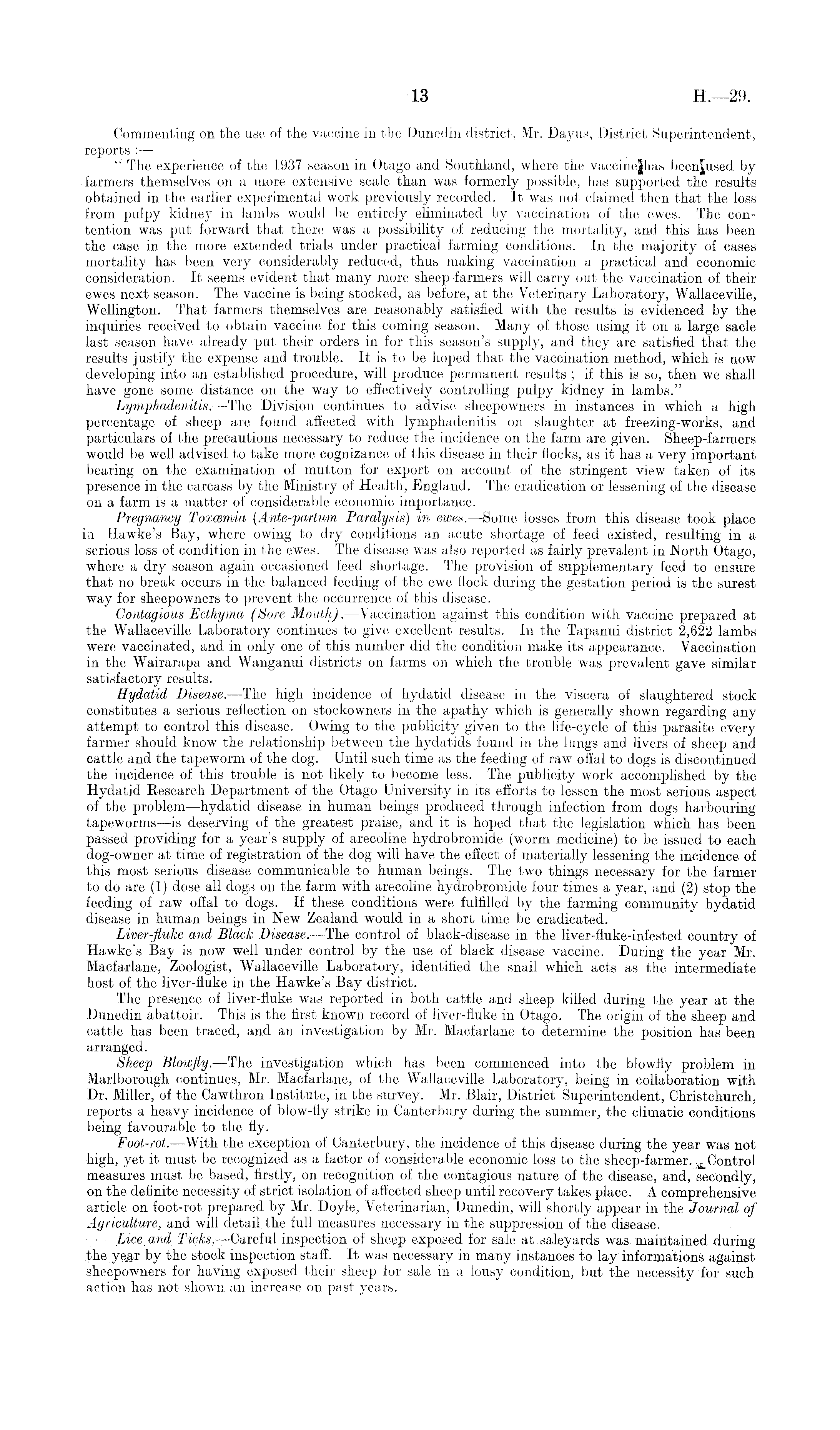 Commenting on the use of the vaccine in the Dunedin district, Mr. Dayus, District Superintendent, reports : — " The experience of the 1937 season in Otago and Southland, where the vaccineJlias beenjused by farmers themselves on a more extensive scale than was formerly possible, has supported the results obtained in the earlier experimental work previously recorded. It was not claimed then that the loss from pulpy kidney in lambs would be entirely eliminated by vaccination of the ewes. The contention was put forward that there was a possibility of reducing the mortality, and this has been the case in the more extended trials under practical farming conditions. In the majority of cases mortality has been very considerably reduced, thus making vaccination a practical and economic consideration. It seems evident that many more sheep-farmers will carry out the vaccination of their ewes next season. The vaccine is being stocked, as before, at the Veterinary Laboratory, Wallaceville, Wellington. That farmers themselves are reasonably satisfied with the results is evidenced by the inquiries received to obtain vaccine for this coming season. Many of those using it on a large sacle last season have already put their orders in for this season's supply, and they are satisfied that the results justify the expense and trouble. It is to be hoped that the vaccination method, which is now developing into an established procedure, will produce permanent results ; if this is so, then we shall have gone some distance on the way to effectively controlling pulpy kidney in lambs." Lymphadenitis.—The Division continues to advise sheepowners in instances in which a high percentage of sheep are found affected with lymphadenitis on slaughter at freezing-works, and particulars of the precautions necessary to reduce the incidence on the farm are given. Sheep-farmers would be well advised to take more cognizance of this disease in their flocks, as it has a very important bearing on the examination of mutton for export on account of the stringent view taken of its presence in the carcass by the Ministry of Health, England. The eradication or lessening of the disease on a farm is a matter of considerable economic importance. Pregnancy Toxcemia (Ante-partum Paralysis) in ewes. —Some losses from this disease took place ia Hawke's Bay, where owing to dry conditions an acute shortage of feed existed, resulting in a serious loss of condition in the ewes. The disease was also reported as fairly prevalent in North Otago, where a dry season again occasioned feed shortage. The provision of supplementary feed to ensure that no break occurs in the balanced feeding of the ewe flock during the gestation period is the surest way for sheepowners to prevent the occurrence of this disease. Contagious Ecthyma (Sore Mouth). —Vaccination against this condition with vaccine prepared at the Wallaceville Laboratory continues to give excellent results. In the Tapanui district 2,622 lambs were vaccinated, and in only one of this number did the condition make its appearance. Vaccination in the Wairarapa and Wanganui districts on farms on which the trouble was prevalent gave similar satisfactory results. Hydatid Disease.—The high incidence of hydatid disease in the viscera of slaughtered stock constitutes a serious reflection on stockowners in the apathy which is generally shown regarding any attempt to control this disease. Owing to the publicity given to the life-cycle of this parasite every farmer should know the relationship between the hydatids found in the lungs and livers of sheep and cattle and the tapeworm of the dog. Until such time as the feeding of raw offal to dogs is discontinued the incidence of this trouble is not likely to become less. The publicity work accomplished by the Hydatid Research Department of the Otago University in its efforts to lessen the most serious aspect of the problem—hydatid disease in human beings produced through infection from dogs harbouring tapeworms —is deserving of the greatest praise, and it is hoped that the legislation which has been passed providing for a year's supply of arecoline hydrobromide (worm medicine) to be issued to each dog-owner at time of registration of the dog will have the effect of materially lessening the incidence of this most serious disease communicable to human beings. The two things necessary for the farmer to do are (1) dose all dogs on the farm with arecoline hydrobromide four times a year, and (2) stop the feeding of raw offal to dogs. If these conditions were fulfilled by the farming community hydatid disease in human beings in New Zealand would in a short time be eradicated. Liver-fluke and Black Disease. —The control of black-disease in the liver-fluke-infested country of Hawke's Bay is now well under control by the use of black disease vaccine. During the year Mr. Macfarlane, Zoologist, Wallaceville Laboratory, identified the snail which acts as the intermediate host of the liver-fluke in the Hawke's Bay district. The presence of liver-fluke was reported in both cattle and sheep killed during the year at the Dunedin abattoir. This is the first known record of liver-fluke in Otago. The origin of the sheep and cattle has been traced, and an investigation by Mr. Macfarlane to determine the position has been arranged. Sheep Blowfly.— : The investigation which has been commenced into the blowfly problem in Marlborough continues, Mr. Macfarlane, of the Wallaceville Laboratory, being in collaboration with Dr. Miller, of the Cawthron Institute, in the survey. Mr. Blair, District Superintendent, Christchurch, reports a heavy incidence of blow-fly strike in Canterbury during the summer, the climatic conditions being favourable to the fly. Foot-rot.- —With the exception of Canterbury, the incidence of this disease during the year was not high, yet it must be recognized as a factor of considerable economic loss to the sheep-farmer. :sL Control measures must be