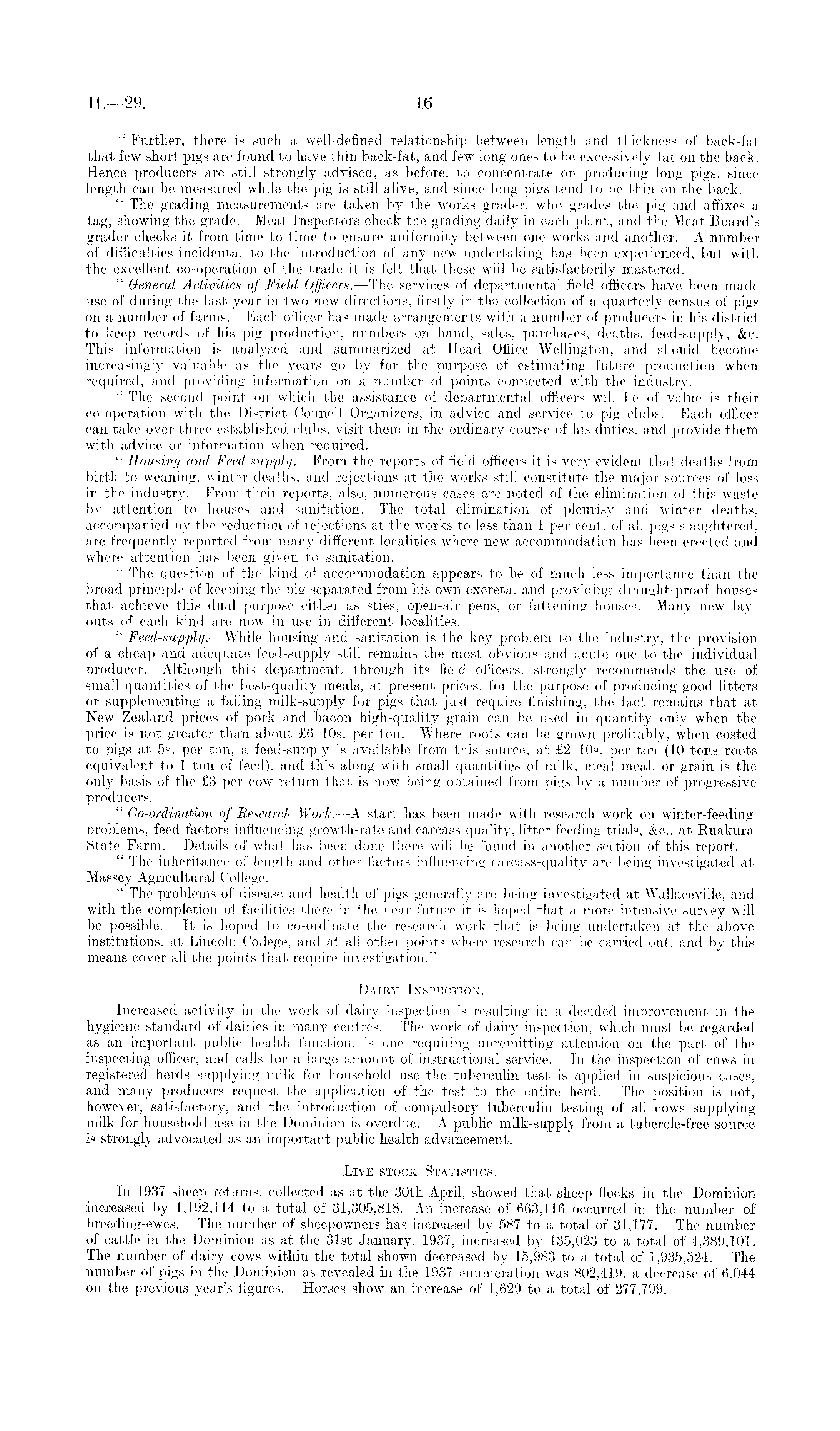 " Further, there is such a well-defined relationship between length and thickness of back-fat that few short pigs are found to have thin back-fat, and few long ones to be excessively fat on the back. Hence producers are still strongly advised, as before, to concentrate on producing long pigs, since length can be measured while the pig is still alive, and since long pigs tend to be thin on the back. " The grading measurements are taken by the works grader, who grades the pig and affixes a tag, showing the grade. Meat Inspectors check the grading daily in each plant, and the Meat Board's grader checks it from time to time to ensure uniformity between one works and another. A number of difficulties incidental to the introduction of any new undertaking has been experienced, but with the excellent co-operation of the trade it is felt that these will be satisfactorily mastered. " General Activities of Field Officers. —The services of departmental field officers have been made use of during the last year in two new directions, firstly in the collection of a quarterly census of pigs on a number of farms. Each officer has made arrangements with a number of producers in his district to keep records of his pig production, numbers on hand, sales, purchases, deaths, feed-supply, &c. This information is analysed and summarized at Head Office Wellington, and should become increasingly valuable as the years go by for the purpose of estimating future production when required, and providing information on a number of points connected with the industry. " The second point on which the assistance of departmental officers will be of value is their co-operation with the District Council Organizers, in advice and service to pig clubs. Each officer can take over three established clubs, visit them in the ordinary course of his duties, and provide them with advice or information when required. " Housing and Feed-supply. —From the reports of field officers it is very evident that deaths from birth to weaning, winter deaths, and rejections at the works still constitute the major sources of loss in the industry. From their reports, also, numerous cases are noted of the elimination of this waste by attention to houses and sanitation. The total elimination of pleurisy and winter deaths, accompanied by the reduction of rejections at the works to less than 1 per cent, of all pigs slaughtered, are frequently reported from many different localities where new accommodation has been erected and where attention has been given to sanitation. The question of the kind of accommodation appears to be of much less importance than the broad principle of keeping the pig separated from his own excreta, and providing draught-proof houses that achieve this dual purpose either as sties, open-air pens, or fattening houses. Many new layouts of each kind are now in use in different localities. " Feed-swpply.—While housing and sanitation is the key problem to the industry, the provision of a cheap and adequate feed-supply still remains the most obvious and acute one to the individual producer. Although this department, through its field officers, strongly recommends the use of small quantities of the best-quality meals, at present prices, for the purpose of producing good litters or supplementing a failing milk-supply for pigs that just require finishing, the fact remains that at New Zealand prices of pork and bacon high-quality grain can be used in quantity only when the price is not greater than about £6 10s. per ton. Where roots can be grown profitably, when costed to pigs at ss. per ton, a feed-supply is available from this source, at £2 10s. per ton (10 tons roots equivalent to 1 ton of feed), and this along with small quantities of milk, meat-meal, or grain is the only basis of the £3 per cow return that is now being obtained from pigs by a number of progressive producers. " Co-ordination of Research Work. —A start has been made with research work on winter-feeding problems, feed factors influencing growth-rate and carcass-quality, litter-feeding trials, &c., at Ruakura State Farm. Details of what has been done there will be found in another section of this report. " The inheritance of length and other factors influencing carcass-quality are being investigated at Massey Agricultural College. " The problems of disease and health of pigs generally are being investigated at Wallaceville, and with the completion of facilities there in the near future it is hoped that a more intensive survey will be possible. It is hoped to co-ordinate the research work that is being undertaken at the above institutions, at Lincoln College, and at all other points where research can be carried out, and by this means cover all the points that require investigation." Dairy Inspection. Increased activity in the work of dairy inspection is resulting in a decided improvement in the hygienic standard of dairies in many centres. The work of dairy inspection, which must be regarded as an important public health function, is one requiring unremitting attention on the part of the inspecting officer, and calls for a large amount of instructional service. In the inspection of cows in registered herds supplying milk for household use the tuberculin test is applied in suspicious cases, and many producers request the application of the test to the entire herd. The position is not, however, satisfactory, and the introduction of compulsory tuberculin testing of all cows supplying milk for household use in the Dominion is overdue. A public milk-supply from a tubercle-free source is strongly advocated as an important public health advancement. Live-stock Statistics. In 1937 sheep returns, collected as at the 30th April, showed that sheep flocks in the Dominion increased by 1,192,114 to a total of 31,305,818. An increase of 663,116 occurred in the number of breeding-ewes. The number of sheepowners has increased by 587 to a total of 31,177. The number of cattle in 