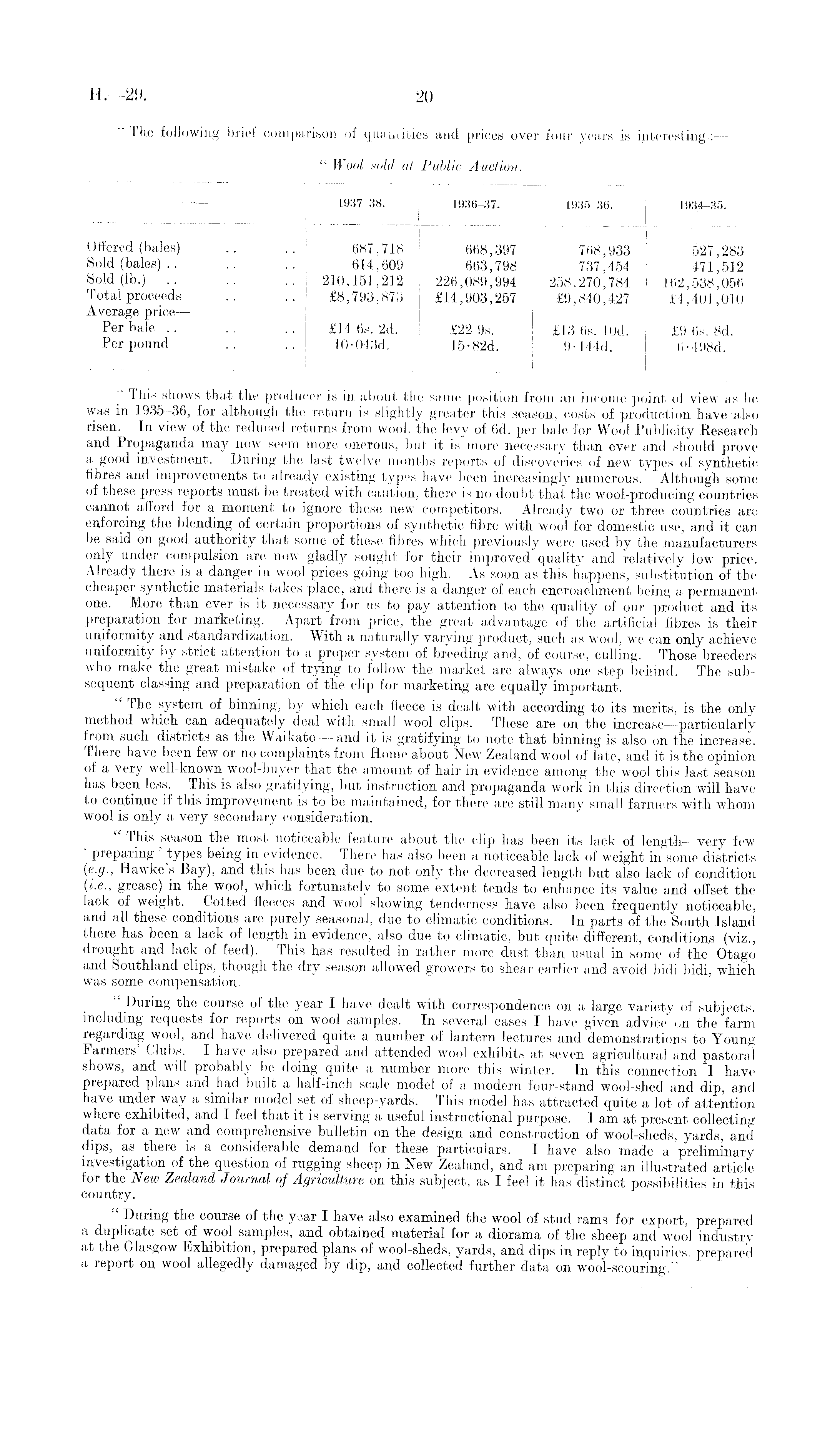 This shows that the producer is in about the same position from an income point of view as he was in 1935-36, for although the return is slightly greater this season, costs of production have also risen. In view of the reduced returns from wool, "the levy of 6d. per bale for Wool Publicity Research and Propaganda may now seem more onerous, but it is more necessary than ever and should prove a good investment. During the last twelve months reports of discoveries of new types of synthetic fibres and improvements to already existing types have been increasingly numerous. Although some of these press reports must be treated with caution, there is no doubt that the wool-producing countries cannot afford for a moment to ignore these new competitors. Already two or three countries are enforcing the blending of certain proportions of synthetic fibre with wool for domestic use, and it can be said on good authority that some of these fibres which previously were used by the manufacturers only under compulsion are now gladly sought for their improved quality and relatively low price. Already there is a danger in wool prices going too high. As soon as this happens, substitution of the cheaper synthetic materials takes place, and there is a danger of each encroachment being a permanent one. More than ever is it necessary for us to pay attention to the quality of our product and its preparation for marketing. Apart from price, the great advantage of the artificial fibres is their uniformity and standardization. With a naturally varying product, such as wool, we can only achieve uniformity by strict attention to a proper system of breeding and, of course, culling. Those breeders who make the great mistake of trying to follow the market are always one step behind. The subsequent classing and preparation of the clip for marketing are equally important. " The system of binning, by which each fleece is dealt with according to its merits, is the only method which can adequately deal with small wool clips. These are on, the increase—particularly from such districts as the Waikato — and it is gratifying to note that binning is also on the increase. There have been few or no complaints from Home about New Zealand wool of late, and it is the opinion of a very well-known wool-buyer that the amount of hair in, evidence among the wool this last season has been less. This is also gratifying, but instruction and propaganda work in this direction will have to continue if this improvement is to be maintained, for there are still many small farmers with whom wool is only a very secondary consideration. This season the most noticeable feature about the clip has been its lack of length—very few preparing types being in evidence. There has also been a noticeable lack of weight in some districts (e.g., Hawke s Bay), and this has been due to not only the decreased length but also lack of condition (i.e., grease) in the wool, which fortunately to some extent tends to enhance its value and offset the lack of weight. Cotted fleeces and wool showing tenderness have also been frequently noticeable, and all these conditions are purely seasonal, due to climatic conditions. In parts of the South Island there has been a lack of length in evidence, also due to climatic, but quite different, conditions (viz., drought and lack of feed). This has resulted in rather more dust than usual in some of the Otago and Southland clips, though the dry season allowed growers to shear earlier and avoid bidi-bidi, which was some compensation. During the course of the year I have dealt with correspondence on a large variety of subjects, including requests for reports on wool samples. In several cases I have given advice on the farm regarding wool, and have delivered quite a number of lantern lectures and demonstrations to Young Farmers' Clubs. I have also prepared and attended wool exhibits at seven agricultural and pastoral shows, and will probably be doing quite a number more this winter. In this connection 1 have prepared plans and had built a half-inch scale model of a modern four-stand wool-shed and dip, and have under way a similar model set of sheep-yards. This model has attracted quite a lot of attention where exhibited, and I feel that it is serving a useful instructional purpose. lam at present collecting data for a new and comprehensive bulletin on the design and construction of wool-sheds, yards, and dips, as there is a considerable demand for these particulars. I have also made a preliminary investigation of the question of rugging sheep in New Zealand, and am preparing an illustrated article for the New Zealand Journal of Agriculture on this subject, as I feel it has distinct possibilities in this country. During the course of the year I have also examined the wool of stud rams for export, prepared a duplicate set of wool samples, and obtained material for a diorama of the sheep and wool industry at the Glasgow Exhibition, prepared plans of wool-sheds, yards, and dips in reply to inquiries, prepared a report on wool allegedly damaged by dip, and collected further data on wool-scouring."