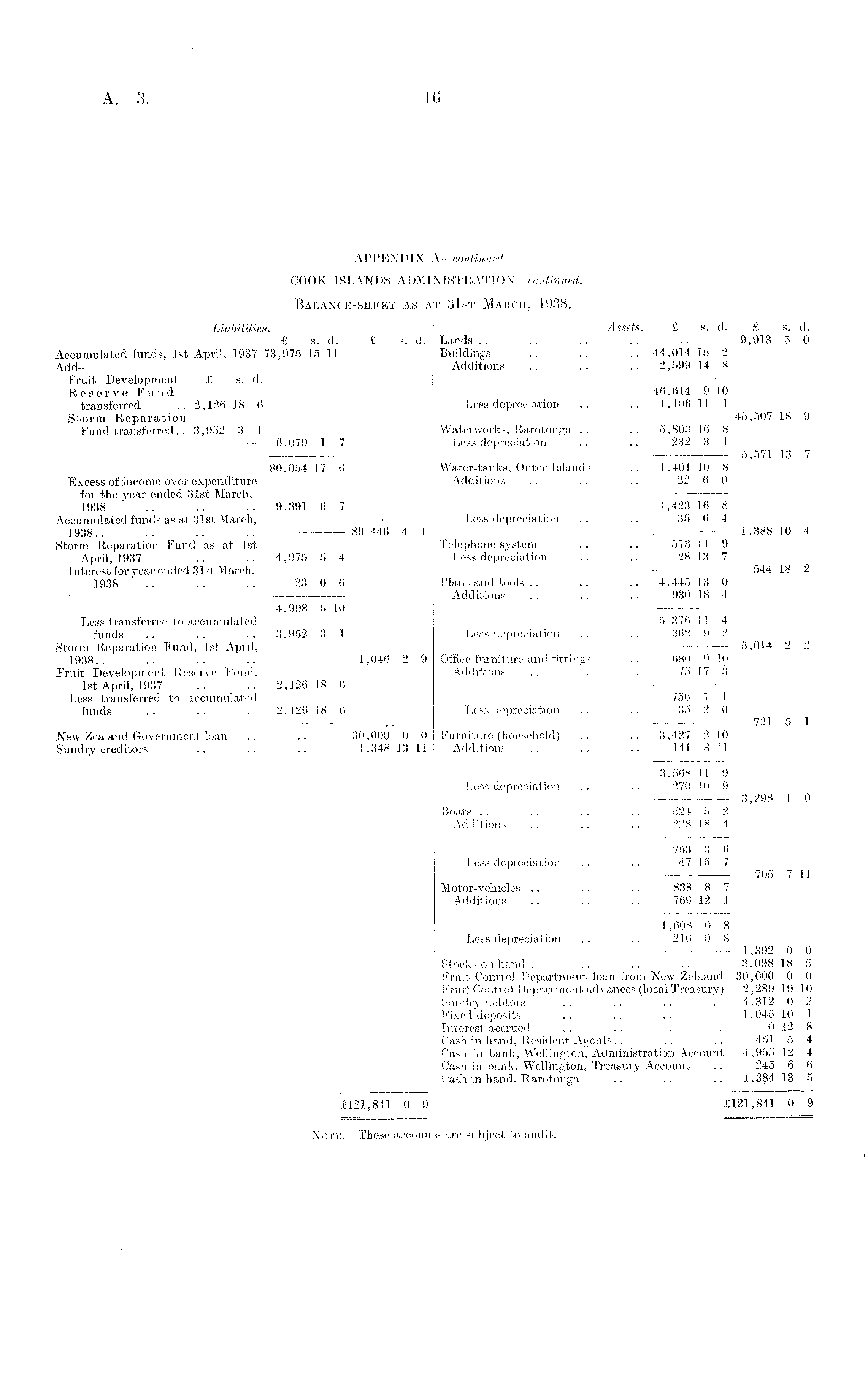 APPENDIX A—continued. COOK ISLANDS ADMINISTRATION —continued. Balance-sheet as at 31st March, 1938. Liabilities. Assets. £ s. d. £ s. d. £ s. d. £ s. d. Lands .. .. .. .. 9,913 5 0 Accumulated funds, Ist April, 1937 73,975 15 11 Buildings .. .. .. 44,014 15 2 Add— Additions .. .. .. 2,59914 8 Fruit Development £ s. d. Reserve Fund 46,614 9 10 transferred .. 2,126 18 6 Less depreciation .. .. 1,106 11 1 Storm Reparation 45,507 18 9 Fund transferred.. 3,952 3 1 Waterworks, Rarotonga .. .. 5,803 16 8 6,079 1 7 Less depreciation .. .. 232 3 I 5,571 13 7 80,054 17 6 Water-tanks, Outer Islands .. 1,401 10 8 Excess of income over expenditure Additions .. .. .. 22 6 0 for the year ended 31st March, 1938 .. 9,391 6 7 1.423 16 8 Accumulated funds as at 31st March, • Less depreciation .. .. 35 6 4 1938.. .. .. .. 89,446 4 1 1,388 10 4 Storm Reparation Fund as at Ist Telephone system .. .. 573 11 9 April, 1937 .. .. 4,975 5 4 Less depreciation .. .. 28 13 7 Interestforyearended3lstMarch, — 544 18 2 1938 .. .. .. 23 0 6 Plant and tools .. .. .. 4,445 13 0 Additions .. .. .. 930 18 4 4,998 5 10 Less transferred to accumulated 1 5,376 li 4 funds .. .. .. 3,95231 Less depreciation .. .. 362 9 2 Storm Reparation Fund, Ist April, — — 5,014 22 1938.. .. .. .. 1,046 2 9 Office furniture and fittings .. 680 9 10 Fruit Development Reserve Fund, Additions .. .. .. 75 17 3 Ist April, 1937 .. .. 2,126 18 6 Less transferred to accumulated 756 7 1 funds .. .. .. 2,126 18 6 Less depreciation .. .. 35 2 0 — .. 721 5 1 New Zealand Government loan .. .. 30,000 0 0 Furniture (household) .. .. 3,427 210 Sundry creditors .. .. .. 1,348 13 11 Additions .. .. .. 141 811 3,568 11 9 Less depreciation .. .. 270 10 9 3,298 1 0 Boats .. .. .. 521 5 2 Additions .. .. 228 18 4 753 3 6 Less depreciation .. .. 47 15 7 705 7 11 Motor-vehicles .. .. .. 838 8 7 Additions .. .. . . 769 12 1 1,608 0 8 Less depreciation .. .. 216 0 8 1,392 0 0 Stocks on hand .. .. .. . . 3,098 18 5 Fruit Control Department loan from New Zelaand 30,000 0 0 Fruit Control Department advances (local Treasury) 2,289 19 10 Sundry debtors .. .. .. .. 4,312 0 2 Fixed deposits .. .. .. .. 1,045 10 1 Interest accrued .. .. .. .. 0 12 8 Cash in hand, Resident Agents.. .. .. 451 5 4 Cash in bank, Wellington, Administration Account 4,955 12 4 Cash in bank, Wellington, Treasury Account .. 245 6 6 Cash in hand, Rarotonga .. .. .. 1,384 13 5 £121,841 0 9 £121,841 0 9 Note. —These accounts are subject to audit.