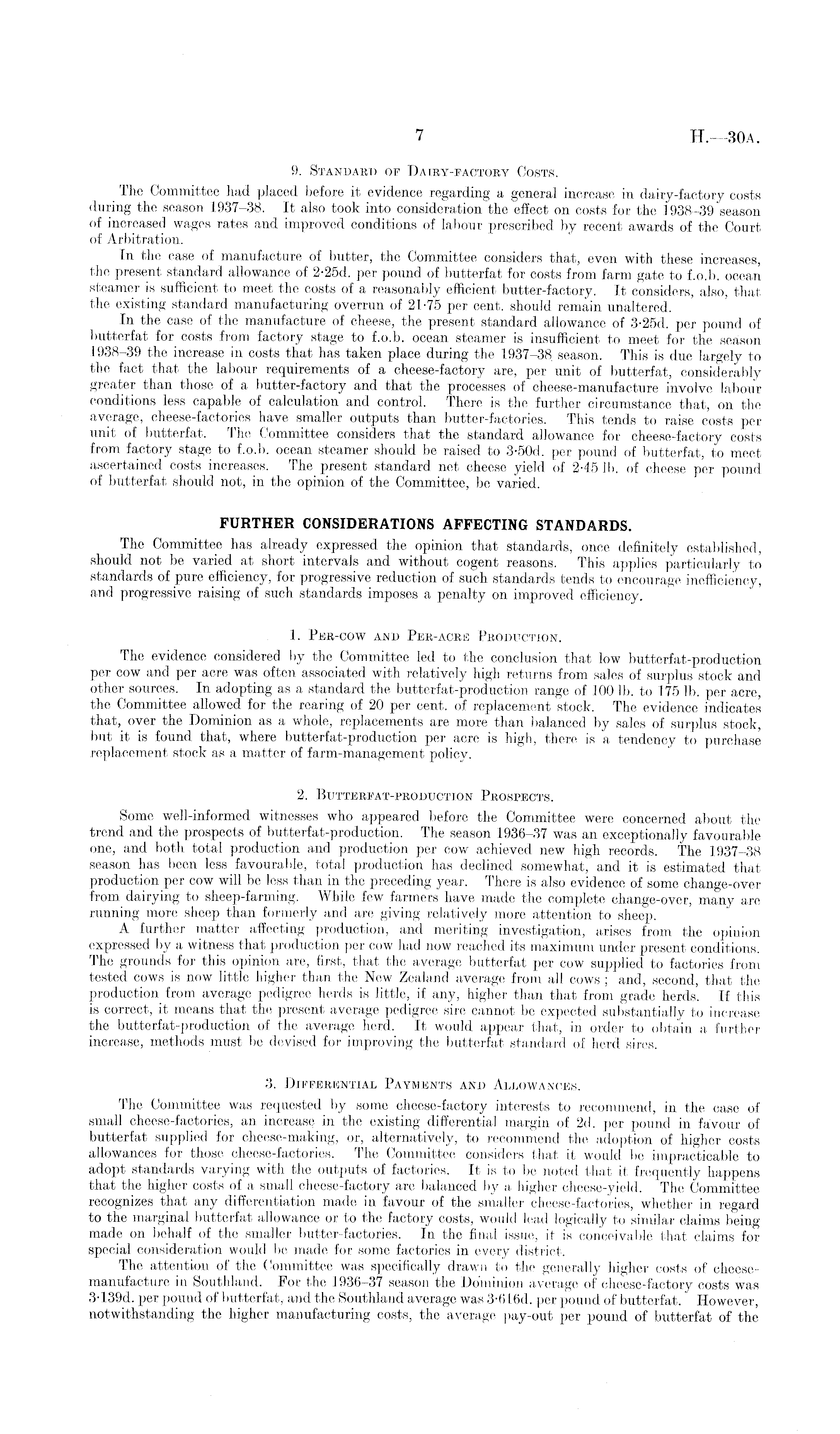 9. Standard op Dairy-factory Costs. The Committee had placed before it evidence regarding a general increase in dairy-factory costs during the season 1937-38. It also took into consideration the effect on costs for the 1938-39 season of increased wages rates and improved conditions of labour prescribed by recent awards of the Court of Arbitration. fn the case of manufacture of butter, the Committee considers that, even with these increases, the present standard allowance of 2-25 d. per pound of butterfat for costs from farm gate to f.o.b. ocean steamer is sufficient to meet the costs of a reasonably efficient butter-factory. It considers, also, that the existing standard manufacturing overrun of 21-75 per cent, should remain unaltered. In the case of the manufacture of cheese, the present standard allowance of 3-25 d. per pound of butterfat for costs from factory stage to f.o.b. ocean steamer is insufficient to meet for the season 1938-39 the increase in costs that has taken place during the 1937-38. season. This is due largely to the fact that the labour requirements of a cheese-factory are, per unit of butterfat, considerably greater than those of a butter-factory and that the processes of cheese-manufacture involve labour conditions less capable of calculation and control. There is the further circumstance that, on the average, cheese-factories have smaller outputs than butter-factories. This tends to raise costs per unit of butterfat. The Committee considers that the standard allowance for cheese-fa,ctory costs from factory stage to f.o.b. ocean steamer should be raised to 3-50 d. per pound of butterfat, to meet ascertained costs increases. The present standard net cheese yield of 245 lb. of cheese per pound of butterfat should not, in the opinion of the Committee, be varied. FURTHER CONSIDERATIONS AFFECTING STANDARDS. The Committee has already expressed the opinion that standards, once definitely established, should not be varied at short intervals and without cogent reasons. This applies particularly to standards of pure efficiency, for progressive reduction of such standards tends to encourage inefficiency, and progressive raising of such standards imposes a penalty on improved efficiency. 1. Per-cow and Per-acre Production. The evidence considered by the Committee led to the conclusion that low butterfat-production per cow and per acre was often associated with relatively high returns from sales of surplus stock and other sources. In adopting as a standard the butterfat-production range of 100 lb. to 175 lb. per acre, the Committee allowed for the rearing of 20 per cent, of replacement stock. The evidence indicates that, over the Dominion as a whole, replacements are more than balanced by sales of surplus stock, but it is found that, where butterfat-production per acre is high, there is a tendency to purchase replacement stock as a matter of farm-management policy. 2. Butterfat-production Prospects. Some well-informed witnesses who appeared before the Committee were concerned about the trend and the prospects of butterfat-production. The season 1936-37 was an exceptionally favourable one, and both total production and production per cow achieved new high records. The 1937-38 season has been less favourable, total production has declined somewhat, and it is estimated that production per cow will be less than in the preceding year. There is also evidence of some change-over from dairying to sheep-farming. While few farmers have made the complete change-over, many are running more sheep than formerly and are giving relatively more attention to sheep. A further matter affecting production, and meriting investigation, arises from the opinion expressed by a witness that production per cow had now reached its maximum under present conditions. The grounds for this opinion are, first, that the average butterfat per cow supplied to factories from tested cows is now little higher than the New Zealand average from all cows ; and, second, that the production from average pedigree herds is little, if any, higher than that from grade herds. If this is correct, it means that the present average pedigree sire cannot be expected substantially to increase the butterfat-production of the average herd. It would appear that, in order to obtain a further increase, methods must be devised for improving the butterfat standard of herd sires. 3. Differential Payments and Allowances. The Committee was requested by some cheese-factory interests to recommend, in the case of small cheese-factories, an increase in the existing differential margin of 2d. per pound in favour of butterfat supplied for cheese-making, or, alternatively, to recommend the adoption of higher costs allowances for those cheese-factories. The Committee considers that it would be impracticable to adopt standards varying with the outputs of factories. It is to be noted that it frequently happens that the higher costs of a small cheese-factory are balanced by a higher cheese-yield. The Committee recognizes that any differentiation made in favour of the smaller cheese-factories, whether in regard to the marginal butterfat allowance or to the factory costs, would lead logically to similar claims beingmade on behalf of the smaller butter-factories. In the final issue, it is conceivable that claims for special consideration would be made for some factories in every district. The attention of the Committee was specifically drawn to the generally higher costs of cheesemanufacture in Southland. For the 1936-37 season the Dominion average of cheese-factory costs was 3-139 d. per pound of butterfat, and the Southland average was 3-616 d. per pound of butterfat. However, notwithstanding the higher manufacturing costs, the average pay-out per pound of butterfat of the