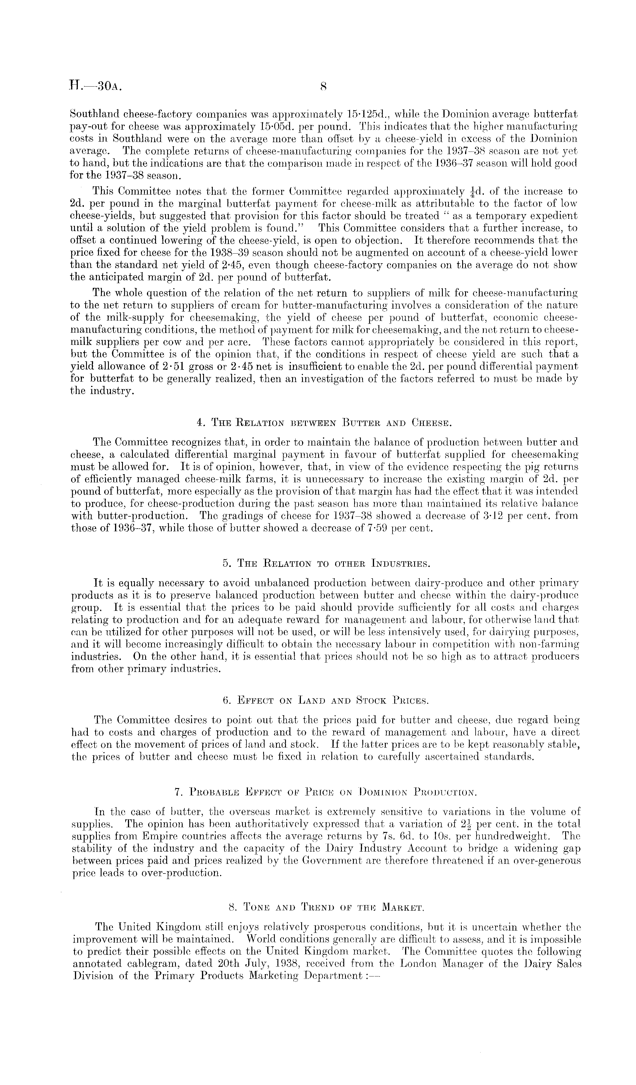 Southland cheese-factory companies was approximately 15-125 d., while the Dominion average butterfat pay-out for cheese was approximately 15-05 d. per pound. This indicates that the higher manufacturing costs in Southland were on the average more than offset by a cheese-yield in excess of the Dominion average. The complete returns of cheese-manufacturing companies for the 1937-38 season are not yet to hand, but the indications are that the comparison made in respect of the 1936-37 season will hold good for the 1937-38 season. This Committee notes that the former Committee regarded approximately Jd. of the increase to 2d. per pound in the marginal butterfat payment for cheese-milk as attributable to the factor of low cheese-yields, but suggested that provision for this factor should be treated " as a temporary expedient until a solution of the yield problem is found." This Committee considers that a further increase, to offset a continued lowering of the cheese-yield, is open to objection. It therefore recommends that the price fixed for cheese for the 1938-39 season should not be augmented on account of a cheese-yield lower than the standard net yield of 2*45, even though cheese-factory companies on the average do not show the anticipated margin of 2d. per pound of butterfat. The whole question of the relation of the net return to suppliers of milk for cheese-manufacturing to the net return to suppliers of cream for butter-manufacturing involves a consideration of the nature of the milk-supply for cheesemaking, the yield of cheese per pound of butterfat, economic cheesemanufacturing conditions, the method of payment for milk for cheesemaking, and the net return to cheesemilk suppliers per cow and per acre. These factors cannot appropriately be considered in this report, but the Committee is of the opinion that, if the conditions in respect of cheese yield are such that a yield allowance of 2-51 gross or 2• 45 net is insufficient to enable the 2d. per pound differential payment for butterfat to be generally realized, then an investigation of the factors referred to must be made by the industry. 4. The Relation between Butter and Cheese. The Committee recognizes that, in order to maintain the balance of production between butter and cheese, a calculated differential marginal payment in favour of butterfat supplied for cheesemaking must be allowed for. It is of opinion, however, that, in view of the evidence respecting the pig returns of efficiently managed cheese-milk farms, it is unnecessary to increase the existing margin of 2d. per pound of butterfat, more especially as the provision of that margin has had the effect that it was intended to produce, for cheese-production during the past season has more than maintained its relative balance with butter-production. The gradings of cheese for 1937-38 showed a decrease of 3-12 per cent. from, those of 1936-37, while those of butter showed a decrease of 7'59 per cent. 5. The Relation to other Industries. It is equally necessary to avoid unbalanced production between dairy-produce and other primary products as it is to preserve balanced production between butter and cheese within the dairy-produce group. It is essential that the prices to be paid should provide sufficiently for all costs and charges relating to production and for an adequate reward for management and labour, for otherwise land that can be utilized for other purposes will not be used, or will be less intensively used, for dairying purposes, and it will become increasingly difficult to obtain the necessary labour in competition with non-farming industries. On the other hand, it is essential that prices should not be so high as to attract producers from other primary industries. 6. Effect on Land and Stock Prices. The Committee desires to point out that the prices paid for butter and cheese, due regard being had to costs and charges of production and to the reward of management and labour, have a direct effect on of prices of land and stock. If the latter prices are to be kept reasonably stable, the prices of butter and cheese must be fixed in relation to carefully ascertained standards. 7. Probable Effect of Price on Dominion Production. In the case of butter, the overseas market is extremely sensitive to variations in the volume of supplies. The opinion has been authoritatively expressed that a variation of 24- per cent, in the total supplies from Empire countries affects the average returns by 7s. 6d. to 10s. per hundredweight. The stability of the industry and the capacity of the Dairy Industry Account to bridge a widening gap between prices paid and prices realized by the Government are therefore threatened if an over-generous price leads to over-production. 8. Tone and Trend of the Market. The United Kingdom still enjoys relatively prosperous conditions, but it is uncertain whether the improvement will be maintained. World conditions generally are difficult to assess, and it is impossible to predict their possible effects on the United Kingdom market. The Committee quotes the following annotated cablegram, dated 20th July, 1938, received from the London Manager of the Dairy Sales Division of the Primary Products Marketing Department:—