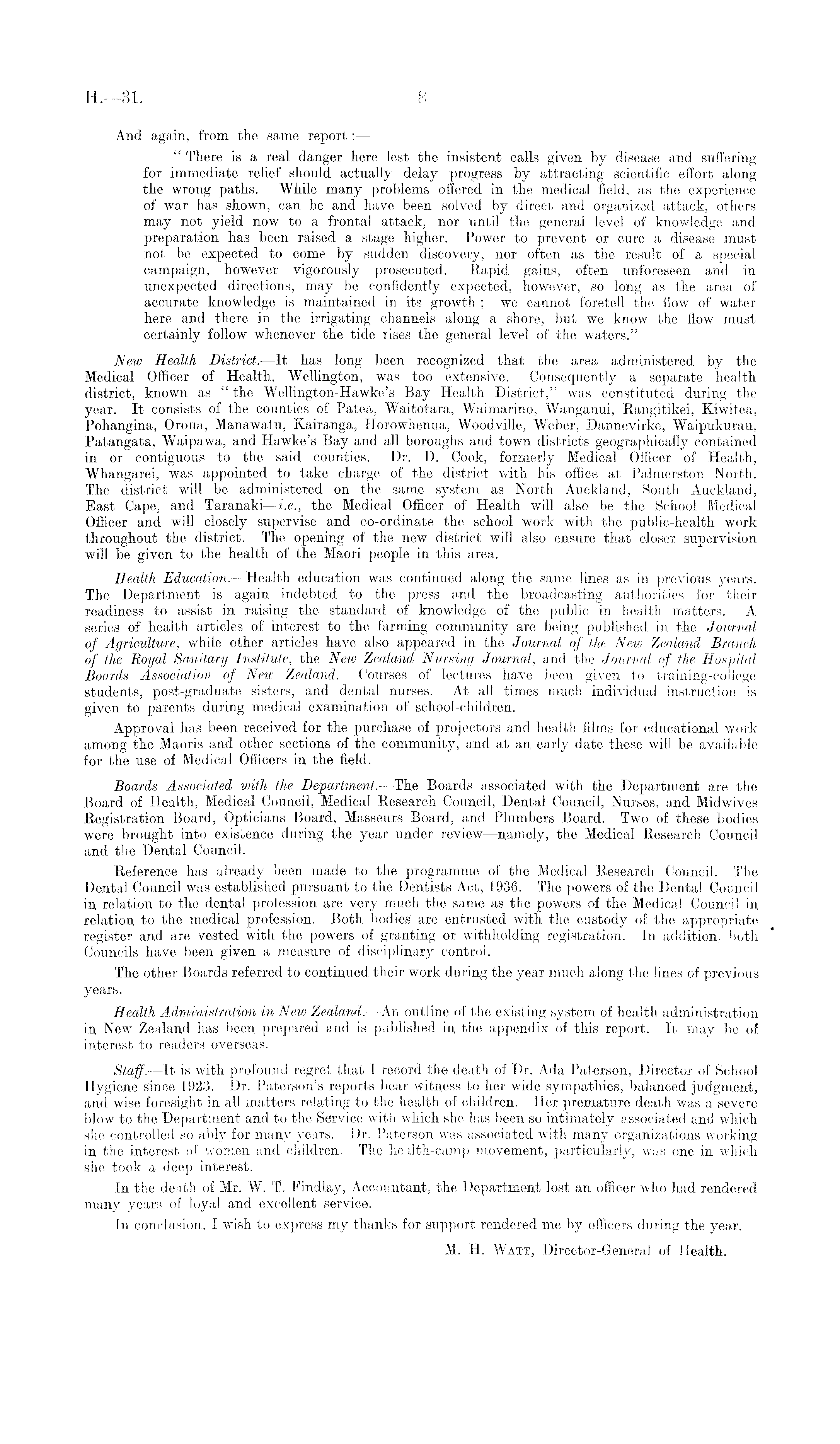 And again, from the same report:— " There is a real danger here lest the insistent calls given by disease and suffering for immediate relief should actually delay progress by attracting scientific effort along the wrong paths. While many problems offered in the medical field, as the experience of war has shown, can be and have been solved by direct and organized attack, others may not yield now to a frontal attack, nor until the general level of knowledge and preparation has been raised a stage higher. Power to prevent or cure a disease must not be expected to come by sudden discovery, nor often as the result of a special campaign, however vigorously prosecuted. Rapid gains, often unforeseen and in unexpected directions, may be confidently expected, however, so long as the area of accurate knowledge is maintained in its growth ; we cannot foretell the flow of water here and there in the irrigating channels along a shore, but we know the flow must certainly follow whenever the tide rises the general level of the waters." New Health District. —It has long been recognized that the area administered by the Medical Officer of Health, Wellington, was too extensive. Consequently a separate health district, known as " the Wellington-Hawke's Bay Health District," was constituted during the year. It consists of the counties of Patea, Waitotara, Waimarino, Wanganui, Rangitikei, Kiwitea, Pohangina, Oroua, Manawatu, Kairanga, Horowhenua, Woodville, Weber, Dannevirke, Waipukurau, Patangata, Waipawa, and Hawke's Bay and all boroughs and town districts geographically contained in or contiguous to the said counties. Dr. D. Cook, formerly Medical Officer of Health, Whangarei, was appointed to take charge of the district with bis office at Palmerston North. The district will be administered on the same system as North Auckland, South Auckland, East Cape, and Taranaki—i.e., the Medical Officer of Health will also be the School Medical Officer and will closely supervise and co-ordinate the school work with the public-health work throughout the district. The opening of the new district will also ensure that closer supervision will be given to the health of the Maori people in this area. Health Education. —Health education was continued along the same lines as in previous years. The Department is again indebted to the press and the broadcasting authorities for their readiness to assist in raising the standard of knowledge of the public in health matters. A series of health articles of interest to the farming community are being published in the Journal of Agriculture, while other articles have also appeared in the Journal of the New Zealand Branch of the Royal Sanitary Institute, the New Zealand Nursing Journal, and the Journal of the Hospital Boards Association of New Zealand. Courses of lectures have been given to training-college students, post-graduate sisters, and dental nurses. At all times much individual instruction is given to parents during medical examination of school-children. Approval has been received for the purchase of projectors and health films for educational work among the Maoris and other sections of the community, and at an early date these will be available for the use of Medical Officers in the field. Boards Associated with the Department. —The Boards associated with the Department are the Board of Health, Medical Council, Medical Research Council, Dental Council, Nurses, and Midwives Registration Board, Opticians Board, Masseurs Board, and Plumbers Board. Two of these bodies were brought into existence during the year under review—namely, the Medical Research Council and the Dental Council. Reference has already been made to the programme of the Medical Research Council. The Dental Council was established pursuant to the Dentists Act, 1936. The powers of the Dental Council in relation to the dental profession are very much the same as the powers of the Medical Council in relation to the medical profession. Both bodies are entrusted with the custody of the appropriate register and are vested with the powers of granting or withholding registration. In addition, both Councils have been given a measure of disciplinary control. The other Boards referred to continued their work during the year much along the lines of previous years. Health Administration in New Zealand. —An outline of the existing system of health administration in New Zealand has been prepared and is published in the appendix of this report. It may be of interest to readers overseas. Staff. —It is with profound regret that I record the death of Dr. Ada Paterson, Director of School Hygiene since 1923. Dr. Paterson's reports bear witness to her wide sympathies, balanced judgment, and wise foresight in all matters relating to the health of children. Her premature death was a severe blow to the Department and to the Service with which she has been so intimately associated and which she controlled so ably for many years. Dr. Paterson was associated with many organizations working in the interest of women and children. The health-camp movement, particularly, was one in which she took a deep interest. In the death of Mr. W. T. Findlay, Accountant, the Department lost an officer who had rendered many years of loyal and excellent service. In conclusion, I wish to express my thanks for support rendered me by officers during the year. M. H. Watt, Director-General of Health.