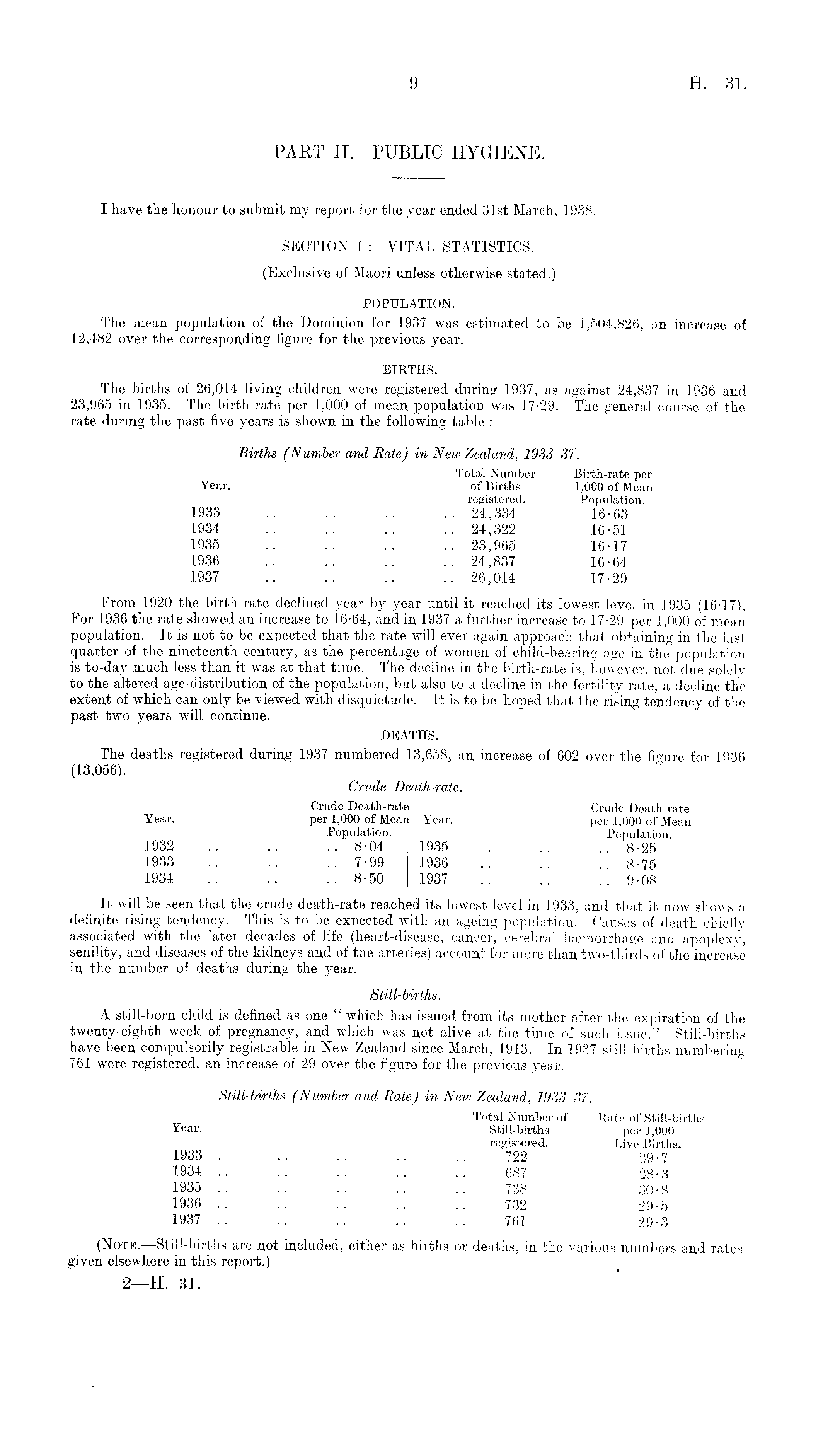 I have the honour to submit my report for the year ended 31st March, 1938. SECTION 1 : VITAL STATISTICS. (Exclusive of Maori unless otherwise stated.) POPULATION. The mean population of the Dominion for 1937 was estimated to be 1,504,826, an increase of 12,482 over the corresponding figure for the previous year. BIRTHS. The births of 26,014 living children were registered during 1937, as against 24,837 in 1936 and 23,965 in 1935. The birth-rate per 1,000 of mean population was 17-29. The general course of the rate during the past five years is shown in the following table : — Births (Number and Rate) in New Zealand, 1933-37. Total Number Birth-rate per Year. of Births 1,000 of Mean registered. Population. 1933 .. .. .. .. 24,334 16-63 1934 .. .. .. .. 24,322 16-51 1935 .. .. .. .. 23,965 16-17 1936 .. .. .. .. 24,837 16-64 1937 .. .. .. .. 26,014 17-29 Prom 1920 the birth-rate declined year by year until it reached its lowest level in 1935 (16-17). For 1936 the rate showed an increase to 16-64, and in 1937 a further increase to 17-29 per 1,000 of mean population. It is not to be expected that the rate will ever again approach that obtaining in the last quarter of the nineteenth century, as the percentage of women of child-bearing age in the population is to-day much less than it was at that time. The decline in the birth-rate is, however, not due solely to the altered age-distribution of the population, but also to a decline in the fertility rate, a decline the extent of which can only be viewed with disquietude. It is to be hoped that the rising tendency of the past two years will continue. DEATHS. The deaths registered during 1937 numbered 13,658, an increase of 602 over the figure for 1936 (13,056). Crude Death-rate. Crude Death-rate Crude Death-rate Year. per 1,000 of Mean Year. per 1,000 of Mean Population. Population. 1932 .. .. .. 8-04 1935 .. .. .. 8-25 1933 .. .. .. 7-99 1936 .. .. .. 8-75 1934 .. .. .. 8-50 1937 .. .. .. 9-08 It will be seen that the crude death-rate reached its lowest level in 1933, and that it now shows a definite rising tendency. This is to be expected with an ageing population. Causes of death chiefly associated with the later decades of life (heart-disease, cancer, cerebral haemorrhage and apoplexy, senility, and diseases of the kidneys and of the arteries) account for more than two-thirds of the increase in the number of deaths during the year. Still-births. A still-born child is defined as one " which has issued from its mother after the expiration of the twenty-eighth week of pregnancy, and which was not alive at the time of such issue." Still-births have been compulsorily registrable in New Zealand since March, 1913. In 1937 still-births numbering 761 were registered, an increase of 29 over the figure for the previous year. Still-births (Number and Rate) in New Zealand, 1933-37. Total Number of Rate of Still-births Year. Still-births per 1,000 registered. Live Births. 1933 .. .. .. .. .. 722 29-7 1934 .. .. .. .. .. 687 28-3 1935 .. .. .. .. .. 738 30-8 1936 .. .. .. .. .. 732 29-5 1937 .. .. .. .. .. 761 29-3 (Note. —Still-births are not included, either as births or deaths, in the various numbers and rates given elsewhere in this report.)