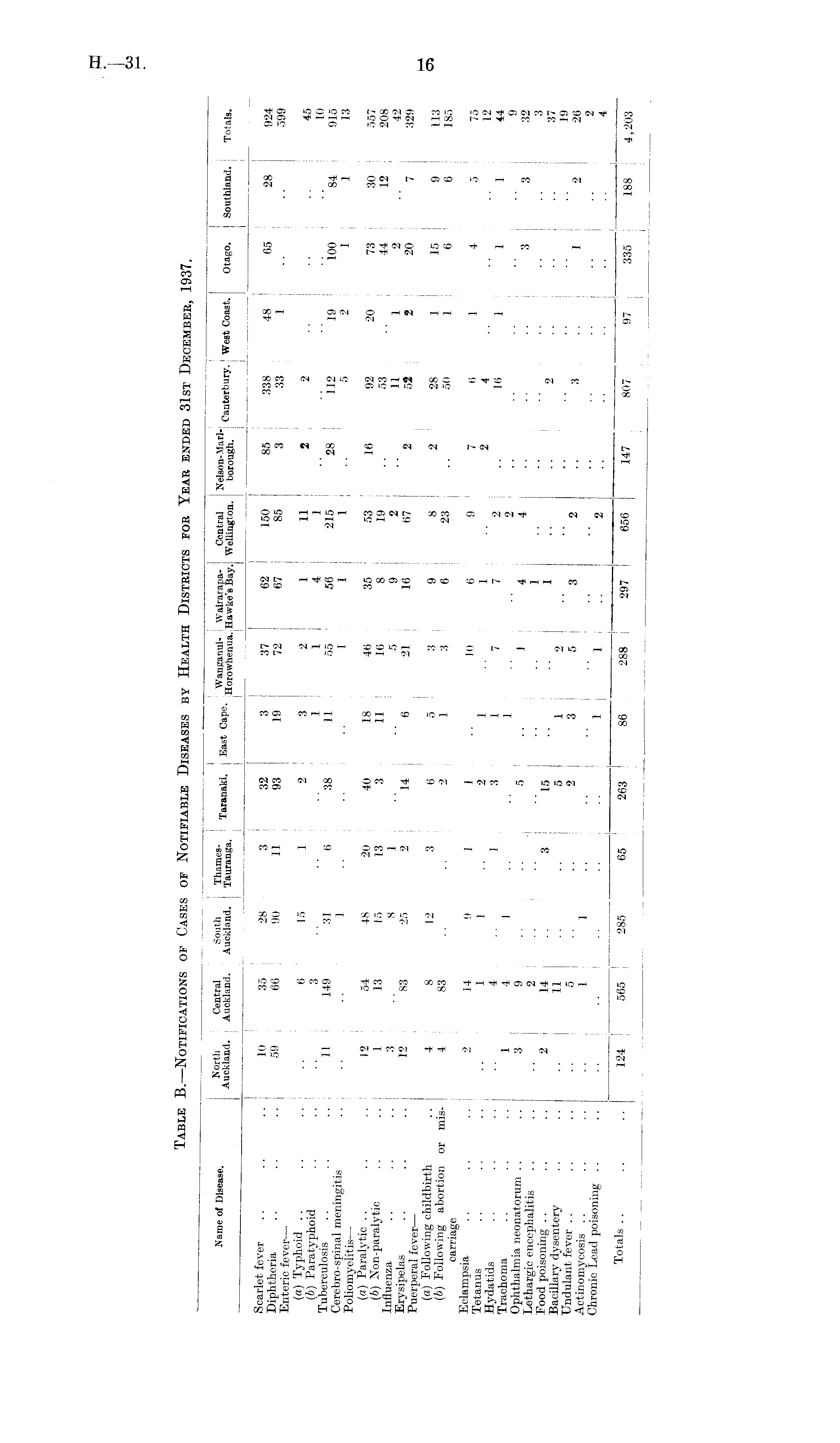 Table B.—Notifications of Cases of Notifiable Diseases by Health Districts for Year ended 31st December, 1937.