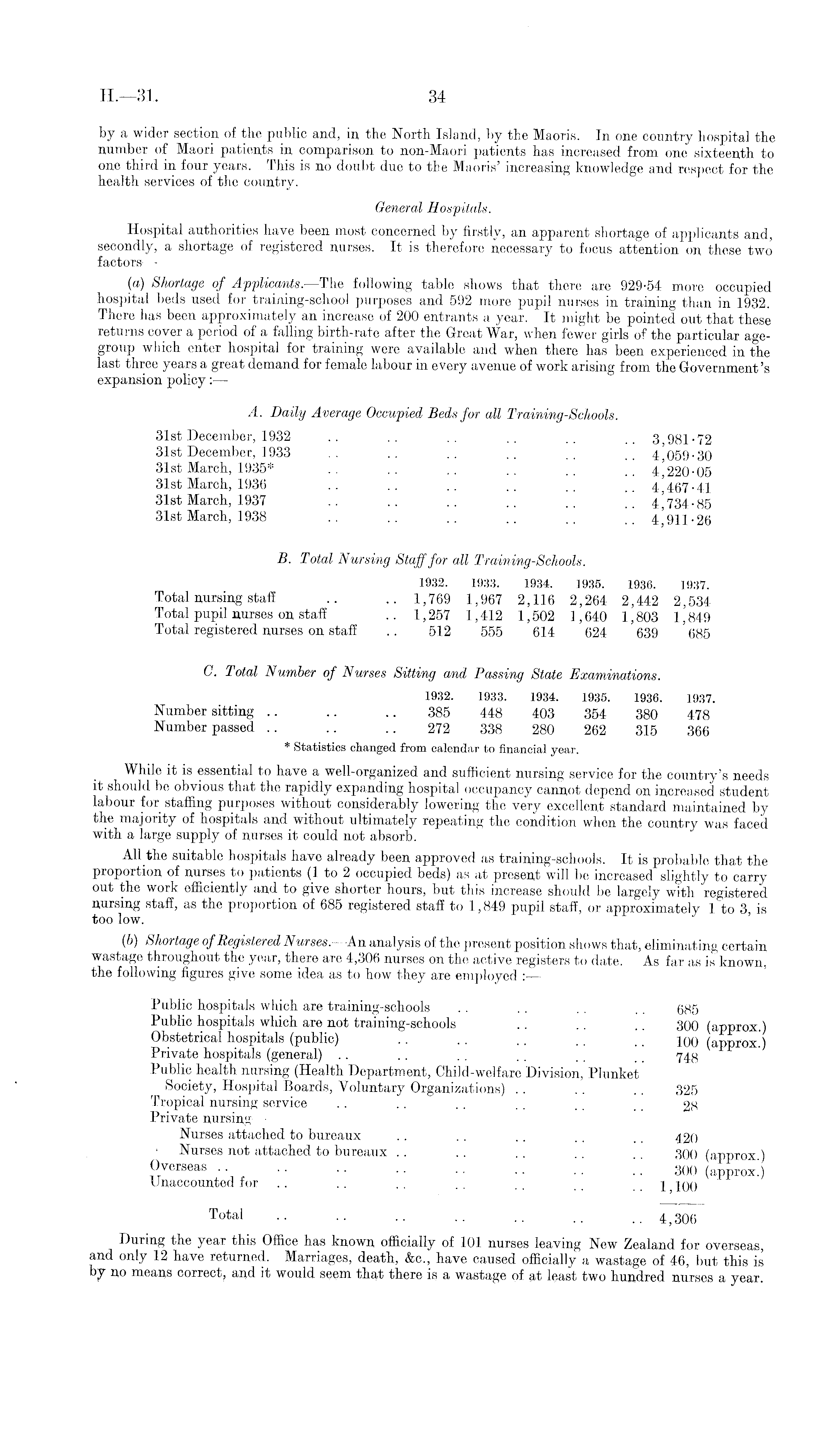 by a wider section of the public and, in the North Island, by the Maoris. In one country hospital the number of Maori patients in comparison to non-Maori patients has increased from one sixteenth to one third in four years. This is no doubt due to the Maoris' increasing knowledge and respect for the health services of the country. General Hospitals. Hospital authorities have been most concerned by firstly, an apparent shortage of applicants and, secondly, a shortage of registered nurses. It is therefore necessary to focus attention on these two factors — (a) Shortage of Applicants.—The following table shows that there are 929-54 more occupied hospital beds used for training-school purposes and 592 more pupil nurses in training than in 1932. There has been approximately an increase of 200 entrants a year. It might be pointed out that these returns cover a period of a falling birth-rate after the Great War, when fewer girls of the particular agegroup which enter hospital for training were available and when there has been experienced in the last three years a great demand for female labour in every avenue of work arising from the Government's expansion policy: — A. Daily Average Occupied Beds for all Training-Schools. 31st December, 1932 .. .. .. .. .. ..3 981-72 31st December, 1933 .. .. .. .. .. ..4 059-30 31st March, 1935* .. .. .. ~ ~ ~ 4*220-05 31st March, 1936 .. .. .. .. __ 4'467-41 31st March, 1937 .. .. .. .. .. 4^734-85 31st March, 1938 .. .. .. .. 4^911-26 B. Total Nursing Staff for all Training-Schools. 1932. 1933. 1934. 1935. 1936. 1937. Total nursing staff .. .. 1,769 1,967 2,116 2,264 2,442 2,534 Total pupil nurses on staff .. 1,257 1,412 1,502 1,640 1,803 1,849 Total registered nurses on staff .. 512 555 614 624 639 685 C. Total Number of Nurses Sitting and Passing State Examinations. 1932. 1933. 1934. 1935. 1936. 1937. Number sitting .. .. .. 385 448 403 354 380 478 Number passed .. .. .. 272 338 280 262 315 366 * Statistics changed from calendar to financial year. While it is essential to have a well-organized and sufficient nursing service for the country's needs it should be obvious that the rapidly expanding hospital occupancy cannot depend on increased Student labour for staffing purposes without considerably lowering the very excellent standard maintained by the majority of hospitals and without ultimately repeating the condition when the country was faced with a large supply of nurses it could not absorb. All the suitable hospitals have already been approved as training-schools. It is probable that the proportion of nurses to patients (1 to 2 occupied beds) as at present will be increased slightly to carry out the work efficiently and to give shorter hours, but this increase should be largely with registered nursing staff, as the proportion of 685 registered staff to 1,849 pupil staff, or approximately Ito3, is too low. (b) Shortage of Registered Nurses. An analysis of the present position shows that, eliminating certain wastage throughout the year, there are 4,306 nurses on the active registers to date. As far as is known, the following figures give some idea as to how they are employed :— Public hospitals which are training-schools .. .. .. 685 Public hospitals which are not training-schools .. .. .. 300 (approx.) Obstetrical hospitals (public) .. .. .. ~ 100 (approx) Private hospitals (general) .. . . . . .. . . 74g Public health nursing (Health Department, Child-welfare Division, Plunket Society, Hospital Boards, Voluntary Organizations) . . .. .. 325 Tropical nursing service .... .. .. 28 Private nursing—Nurses attached to bureaux .. .. .. .. ~ 420 Nurses not attached to bureaux . . . . . . . . 300 (approx ) Overseas . . .. . . . . . . , 30Q (approx.) Unaccounted for .. .. .. . . .. 1 100 Total -• •• ■■ •• •• .. .. 4,306 During the year this Office has known officially of 101 nurses leaving New Zealand for overseas, and only 12 have returned. Marriages, death, &c., have caused officially a wastage of 46, but this is by no means correct, and it would seem that there ig a wastage, of at least two hundred nurses a year.