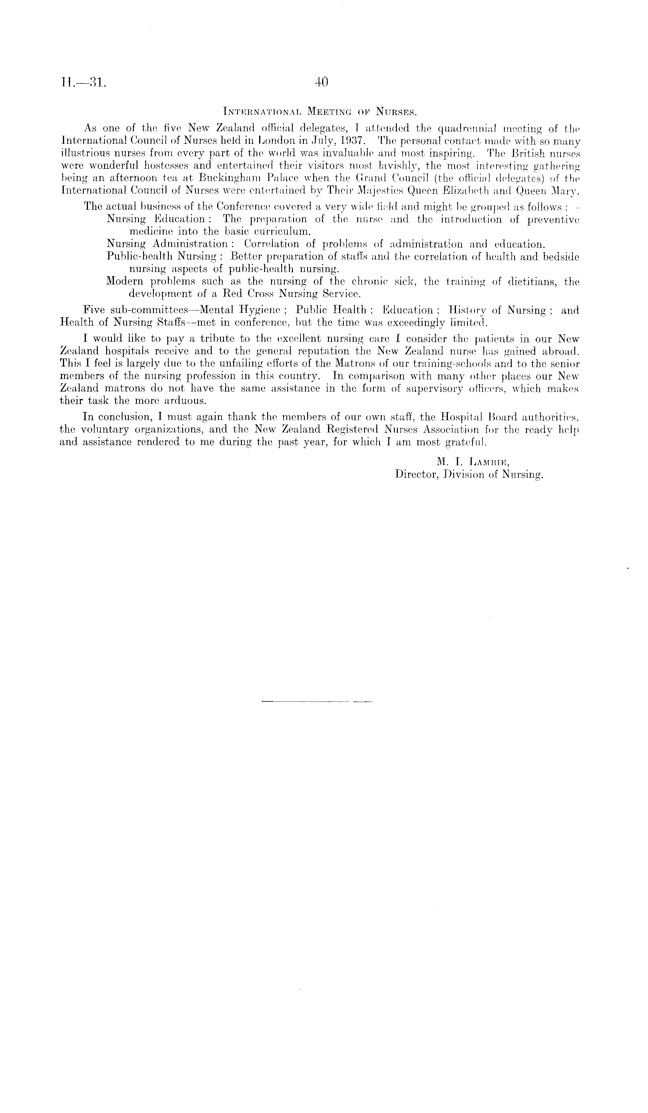 International Meeting op Nurses. As one of the five New Zealand official delegates, I attended the quadrennial meeting of the International Council of Nurses held in London in July, 1937. The personal contact made with so many illustrious nurses from every part of the world was invaluable and most inspiring. The British nurses were wonderful hostesses and entertained their visitors most lavishly, the most interesting gathering being an afternoon tea at Buckingham Palace when the Grand Council (the official delegates) of the International Council of Nurses were entertained by Their Majesties Queen Elizabeth and Queen Mary. The actual business of the Conference covered a very wide field and might be grouped as follows : — Nursing Education : The preparation of the nurse and the introduction of preventive medicine into the basic curriculum. Nursing Administration : Correlation of problems of administration and education. Public-health Nursing : Better preparation of staffs and the correlation of health and bedside nursing aspects of public-health nursing. Modern problems such as the nursing of the chronic sick, the training of dietitians, the development of a Red Cross Nursing Service. Five sub-committees —Mental Hygiene ; Public Health ; Education ; History of Nursing ; and Health of Nursing Staffs —met in conference, but the time was exceedingly limited. I would like to pay a tribute to the excellent nursing care I consider the patients in our New Zealand hospitals receive and to the general reputation the New Zealand nurse has gained abroad. This I feel is largely due to the unfailing efforts of the Matrons of our training-schools and to the senior members of the nursing profession in this country. In comparison with many other places our New Zealand matrons do not have the same assistance in the form of supervisory officers, which makes their task the more arduous. In conclusion, I must again thank the members of our own staff, the Hospital Board authorities, the voluntary organizations, and the New Zealand Registered Nurses Association for the ready help and assistance rendered to me during the past year, for which I am most grateful. M. I. Lambie, Director, Division of Nursing.