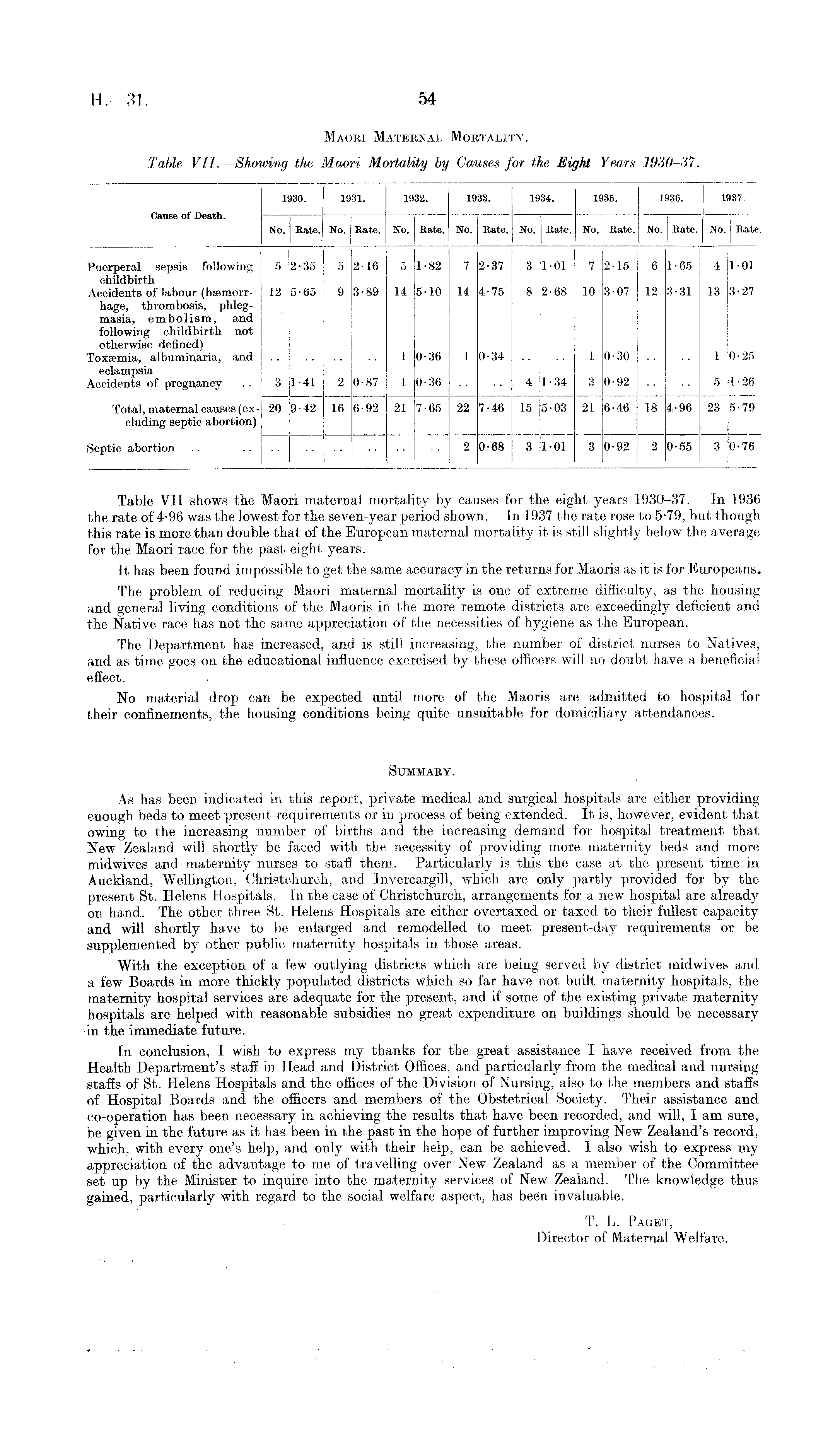 Table VII shows the Maori maternal mortality by causes for the eight years 1930-37. In 1936 the rate of 4-96 was the lowest for the seven-year period shown. In 1937 the rate rose to 5-79, but though this rate is more than double that of the European maternal mortality it is still slightly below the average for the Maori race for the past eight years. It has been found impossible to get the same accuracy in the returns for Maoris as it is for Europeans. The problem of reducing Maori maternal mortality is one of extreme difficulty, as the housing and general living conditions of the Maoris in the more remote districts are exceedingly deficient and the Native race has not the same appreciation of the necessities of hygiene as the European. The Department has increased, and is still increasing, the number of district nurses to Natives, and as time goes on the educational influence exercised by these officers will no doubt have a beneficial efiect. No material drop can be expected until more of the Maoris are admitted to hospital for their confinements, the housing conditions being quite unsuitable for domiciliary attendances. Summary. As has been indicated in this report, private medical and surgical hospitals are either providing enough beds to meet present requirements or in process of being extended. It is, however, evident that owing to the increasing number of births and the increasing demand for hospital treatment that New Zealand will shortly be faced with the necessity of providing more maternity beds and more mid wives and maternity nurses to staff them. Particularly is this the case at the present time in Auckland, Wellington, Christchurch, and Invercargill, which are only partly provided for by the present St. Helens Hospitals. In the case of Christchurch, arrangements for a new hospital are already on hand. The other three St. Helens Hospitals are either overtaxed or taxed to their fullest capacity and will shortly have to be enlarged and remodelled to meet present-day requirements or be supplemented by other public maternity hospitals in those areas. With the exception of a few outlying districts which are being served by district midwives and a few Boards in more thickly populated districts which so far have not built maternity hospitals, the maternity hospital services are adequate for the present, and if some of the existing private maternity hospitals are helped with reasonable subsidies no great expenditure on buildings should be necessary in the immediate future. In conclusion, I wish to express my thanks for the great assistance I have received from the Health Department's staff in Head and District Offices, and particularly from the medical and nursing staffs of St. Helens Hospitals and the offices of the Division of Nursing, also to the members and staffs of Hospital Boards and the officers and members of the Obstetrical Society. Their assistance and co-operation has been necessary in achieving the results that have been recorded, and will, I am sure, be given in the future as it has been in the past in the hope of further improving New Zealand's record, which, with every one's help, and only with their help, can be achieved. I also wish to express my appreciation of the advantage to me of travelling over New Zealand as a member of the Committee set up by the Minister to inquire into the maternity services of New Zealand. The knowledge thus gained, particularly with regard to the social welfare aspect, has been invaluable. T. L. Paget, Director of Maternal Welfare.