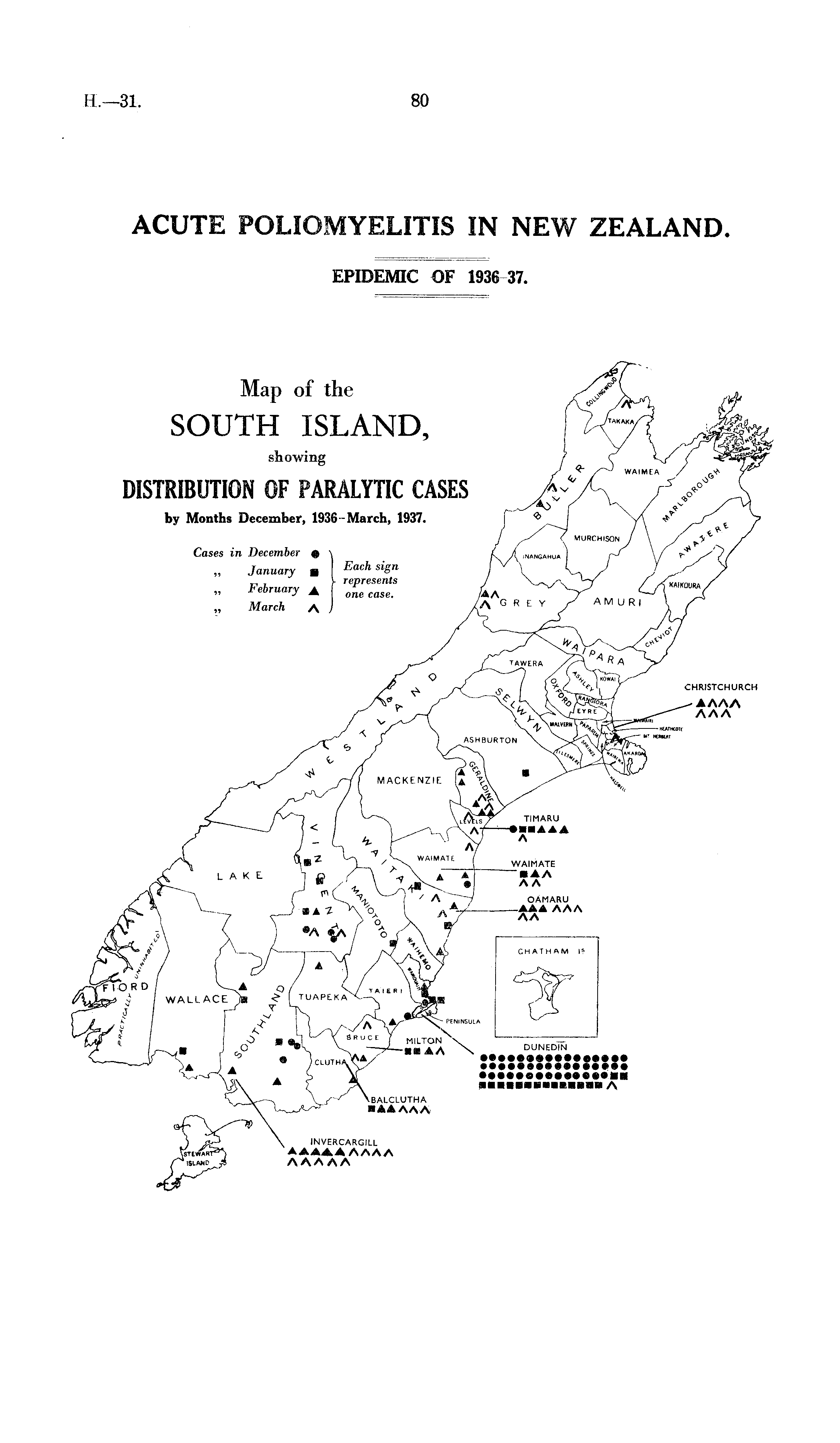 Map of the SOUTH ISLAND, showing DISTRIBUTION OF PARALYTIC CASES by Months December, 1936-March, 1937.
