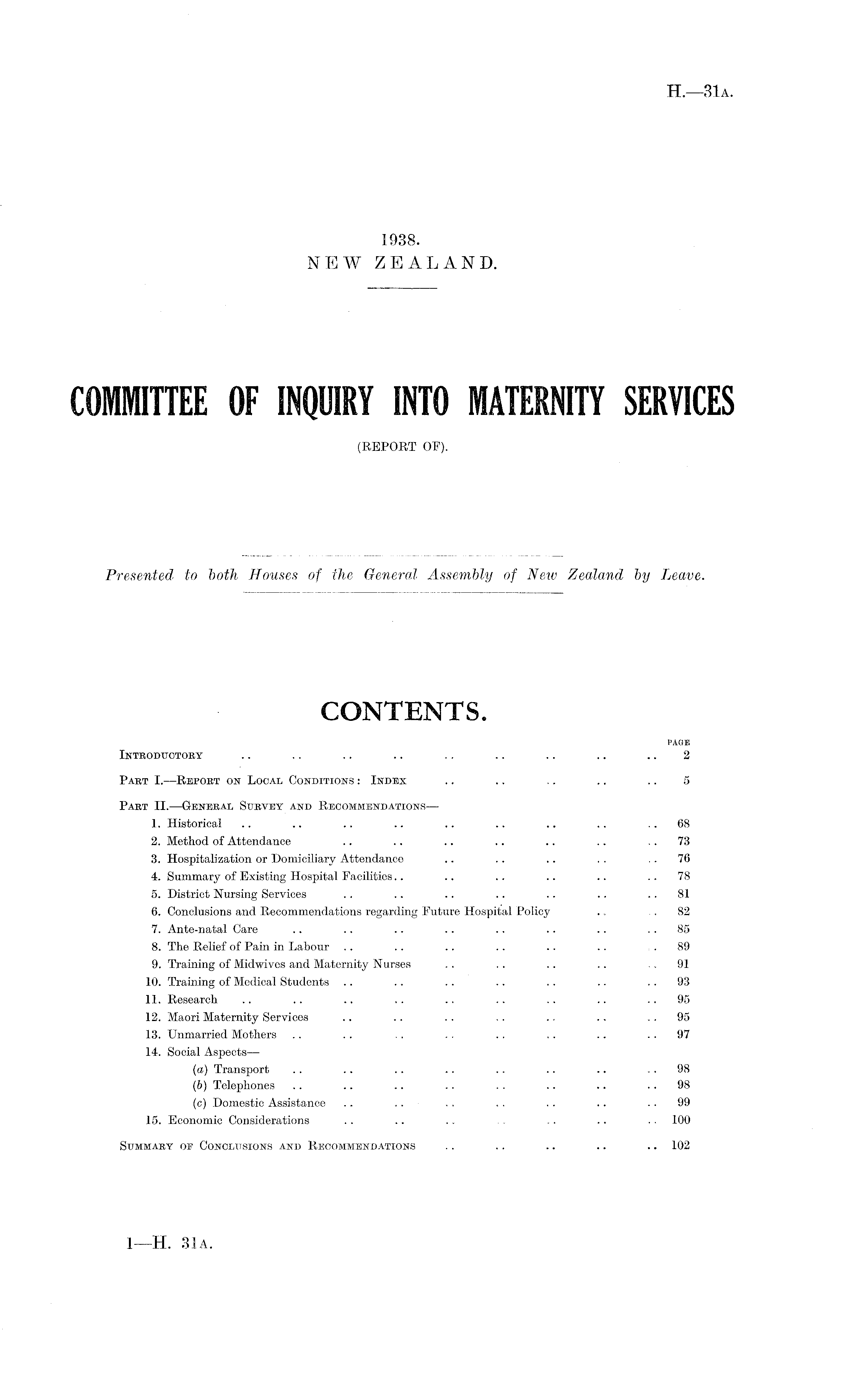 CONTENTS. PAGE Introductory .. . . .. .. .. .. .. .. .. 2 Past I.—Report on Local Conditions : Index .. .. ~ .. .. 5 Part II. —General Survey and Recommendations— 1. Historical .. .. .. .. .. .. .. .. 68 2. Method of Attendance .. .. .. .. .. .. 73 3. Hospitalization or Domiciliary Attendance .. ... .. .. 76 4. Summary of Existing Hospital Facilities.. .. . . .. . . .. 78 5. District Nursing Services .. .. .. .. .. .. 81 6. Conclusions and Recommendations regarding Future Hospital Policy .. . 82 7. Ante-natal Care .. .. .. .. .. .. .. 85 8. The Relief of Pain in Labour .. .. .. .. .. .. .89 9. Training of Midwives and Maternity Nurses .. .. .. .. .91 10. Training of Medical Students .. .. .. .. .. .. 93 11. Research .. .. .. .. .. .. .. .. 95 12. Maori Maternity Services .. .. .. .. ~ .. 95 13. Unmarried Mothers .. .. . . .. .. . . .. 97 14. Social Aspects — (а) Transport .. .. .. .. .. .. .. 98 (б) Telephones .. .. .. .. . . .. .. 98 (c) Domestic Assistance .. .. .. .. .. .. 99 15. Economic Considerations . . .. .. .. .. .. .. 100 Summary of Conclusions and Recommendations .. .. .. .. .. 102