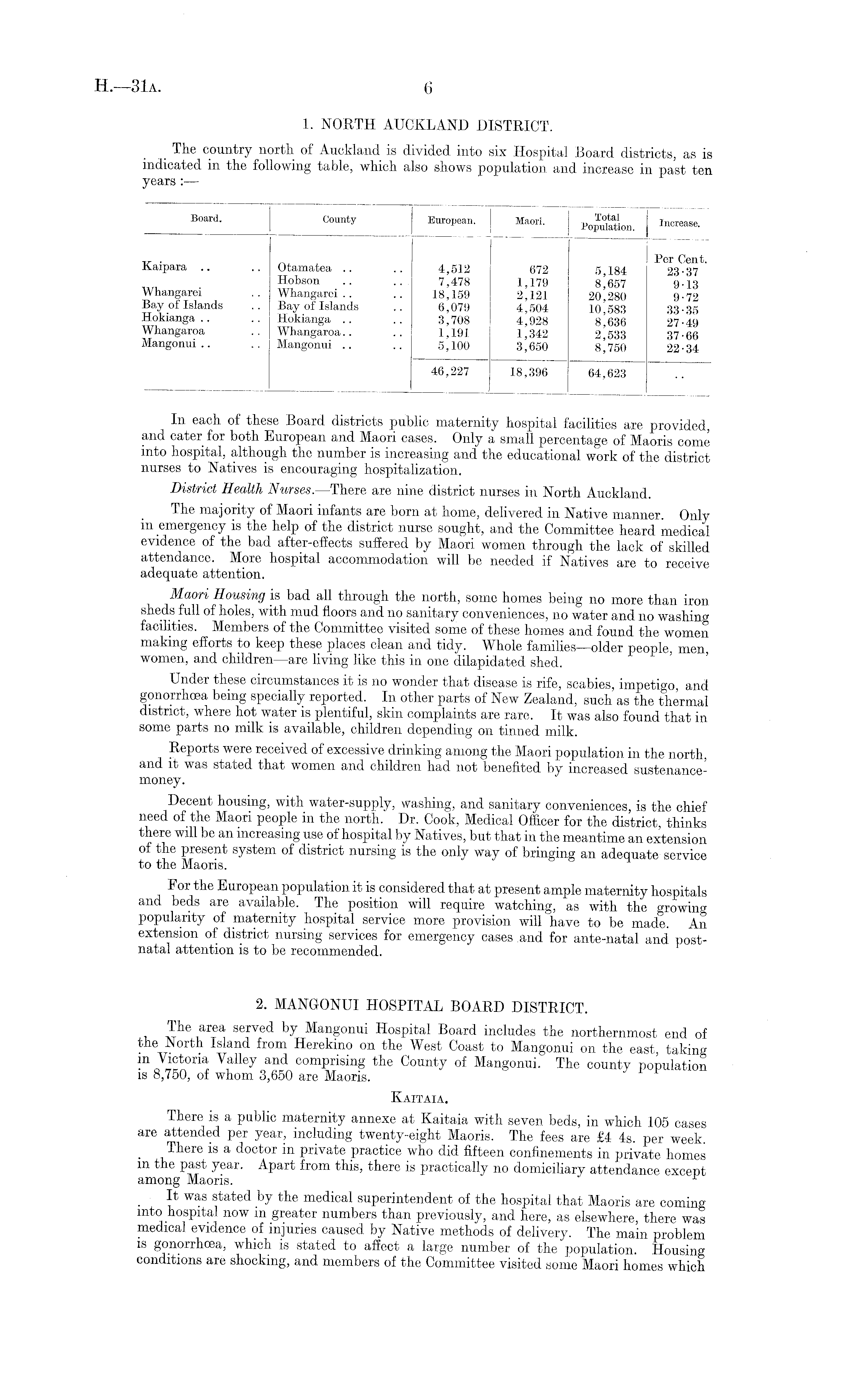 1. NORTH AUCKLAND DISTRICT. The country north of Auckland is divided into six Hospital Board districts, as is indicated in the following table, which also shows population and increase in past ten years : —