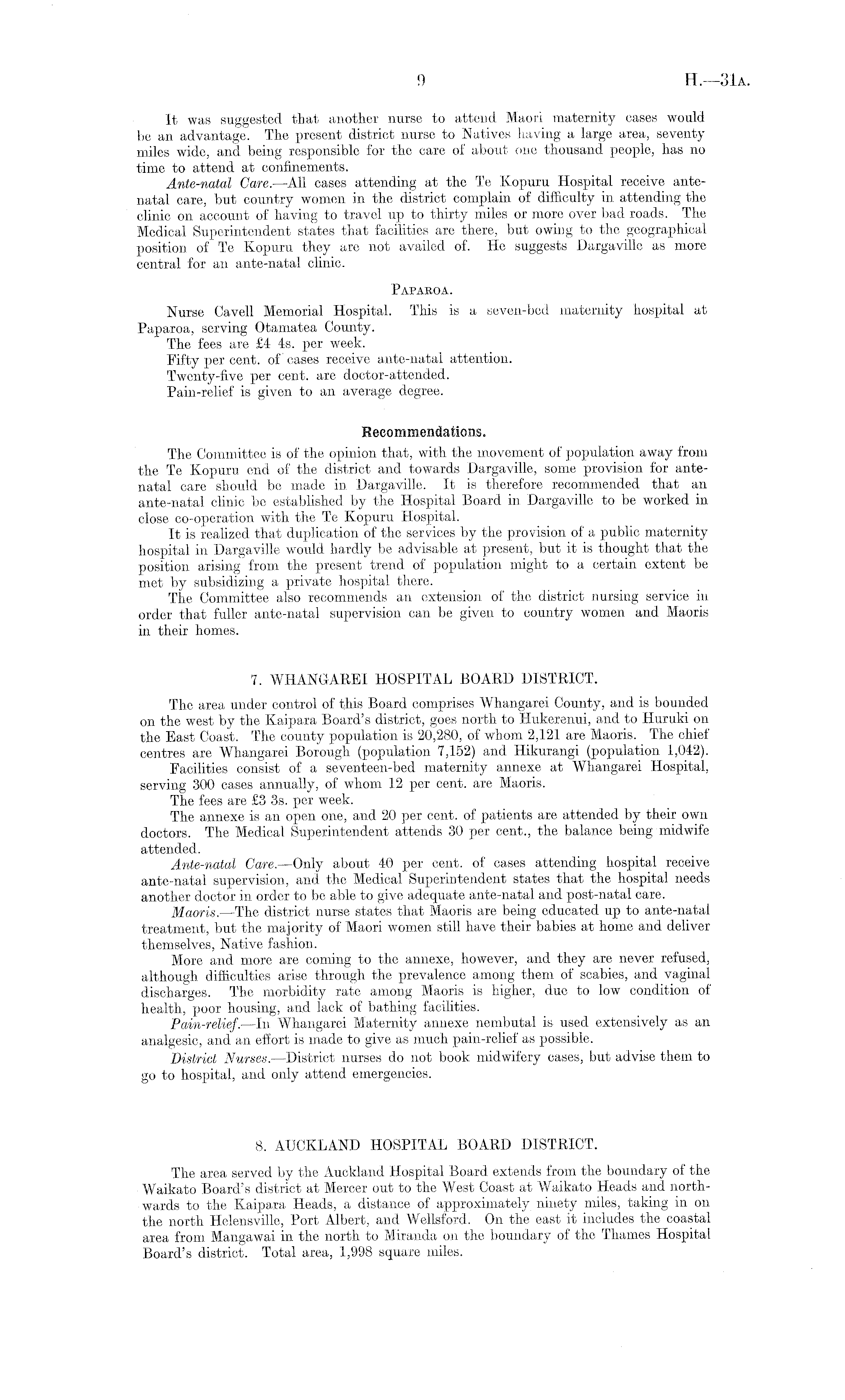 It was suggested that another nurse to attend Maori maternity cases would be an advantage. The present district nurse to Natives having a large area, seventy miles wide, and being responsible for the care of about one thousand people, has no time to attend at confinements. Ante-natal Care. —All cases attending at the Te Kopuru Hospital receive antenatal care, but country women in the district complain of difficulty in attending the clinic on account of having to travel up to thirty miles or more over bad roads. The Medical Superintendent states that facilities are there, but owing to the geographical position of Te Kopuru they are not availed of. He suggests Dargaville as more central for an ante-natal clinic. Paparoa. Nurse Cavell Memorial Hospital. This is a seven-bed maternity hospital at Paparoa, serving Otamatea County. The fees are £4 4s. per week. Fifty per cent, of cases receive ante-natal attention. Twenty-five per cent, are doctor-attended. Pain-relief is given to an average degree. Recommendations. The Committee is of the opinion that, with the movement of population away from the Te Kopuru end of the district and towards Dargaville, some provision for antenatal care should be made in Dargaville. It is therefore recommended that an ante-natal clinic be established by the Hospital Board in Dargaville to be worked in close co-operation with the Te Kopuru Hospital. It is realized that duplication of the services by the provision of a public maternity hospital in Dargaville would hardly be advisable at present, but it is thought that the position arising from the present trend of population might to a certain extent be met by subsidizing a private hospital there. The Committee also recommends an extension of the district nursing service in order that fuller ante-natal supervision can be given to country women and Maoris in their homes. 7. WHANGAREI HOSPITAL BOARD DISTRICT. The area under control of this Board comprises Whangarei County, and is bounded on the west by the Ivaipara Board's district, goes north to Hukerenui, and to Huruki on the Bast Coast. The county population is 20,280, of whom 2,121 are Maoris. The chief centres are Whangarei Borough (population 7,152) and Hikurangi (population 1,042). Facilities consist of a seventeen-bed maternity annexe at Whangarei Hospital, serving 300 cases annually, of whom 12 per cent, are Maoris. The fees are £3 3s. per week. The annexe is an open one, and 20 per cent, of patients are attended by their own doctors. The Medical Superintendent attends 30 per cent., the balance being midwife attended. Ante-natal Care. —Only about 40 per cent, of cases attending hospital receive ante-natal supervision, and the Medical Superintendent states that the hospital needs another doctor in order to be able to give adequate ante-natal and post-natal care. Maoris. —The district nurse states that Maoris are being educated up to ante-natal treatment, but the majority of Maori women still have their babies at home and deliver themselves, Native fashion. More and more are coming to the annexe, however, and they are never refused, although difficulties arise through the prevalence among them of scabies, and vaginal discharges. The morbidity rate among Maoris is higher, due to low condition of health, poor housing, and lack of bathing facilities. Pain-relief. —In Whangarei Maternity annexe nembutal is used extensively as an analgesic, and an eflort is made to give as much pain-relief as possible. District Nurses. —District nurses do not book midwifery cases, but advise them to go to hospital, and only attend emergencies. 8. AUCKLAND HOSPITAL BOARD DISTRICT. The area served by the Auckland Hospital Board extends from the boundary of the Waikato Board's district at Mercer out to the West Coast at Waikato Heads and northwards to the Kaipara Heads, a distance pf approximately ninety miles, taking in on the north Helensville, Port Albert, and Wellsford. On the east it includes the coastal area from Mangawai in the north to Miranda on the boundary of the Thames Hospital Board's district. Total area, 1,998 square miles.
