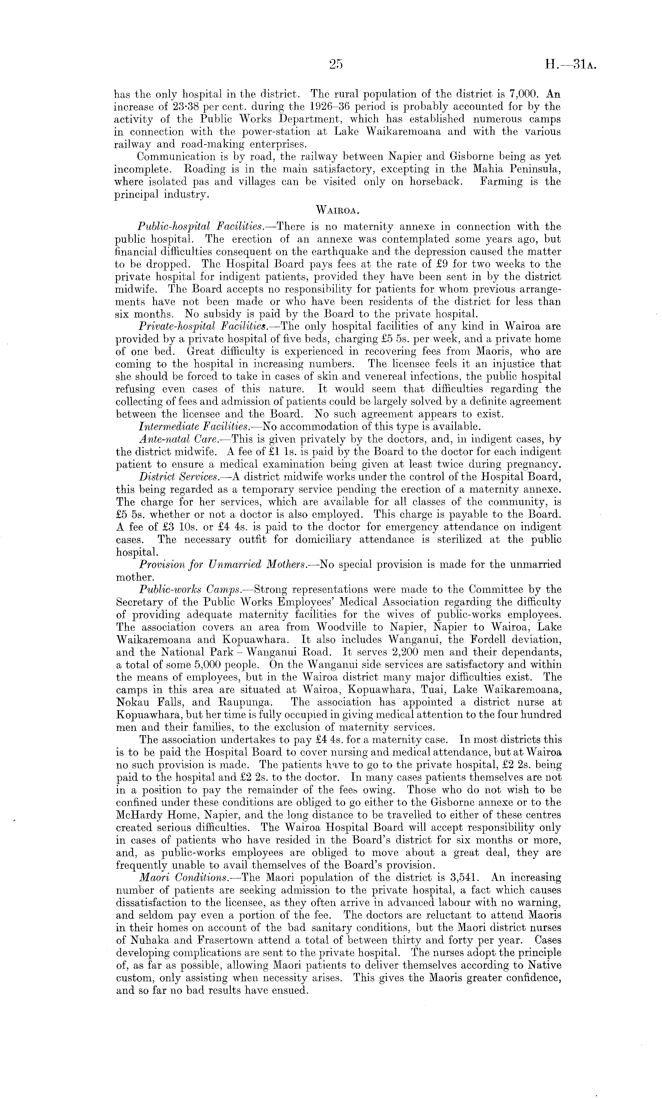 has the only hospital in the district. The rural population of the district is 7,000. An increase of 23-38 per cent, during the 1926-36 period is probably accounted for by the activity of the Public Works Department, which has established numerous camps in connection with the power-station at Lake Waikaremoana and with the various railway and road-making enterprises. Communication is by road, the railway between Napier and Gisborne being as yet incomplete. Roading is in the main satisfactory, excepting in the Mahia Peninsula, where isolated pas and villages can be visited only on horseback. Farming is the principal industry. Wairoa. Public-hospital Facilities. —There is no maternity annexe in connection with the public hospital. The erection of an annexe was contemplated some years ago, but financial difficulties consequent on the earthquake and the depression caused the matter to be dropped. The Hospital Board pays fees at the rate of £9 for two weeks to the private hospital for indigent patients, provided they have been sent in by the district midwife. The Board accepts no responsibility for patients for whom previous arrangements have not been made or who have been residents of the district for less than six months. No subsidy is paid by the Board to the private hospital. Private-hospital Facilities. —The only hospital facilities of any kind in Wairoa are provided by a private hospital of five beds, charging £5 ss. per week, and a private home of one bed. Great difficulty is experienced in recovering fees from Maoris, who are coming to the hospital in increasing numbers. The licensee feels it an injustice that she should be forced to take in cases of skin and venereal infections, the public hospital refusing even cases of this nature. It would seem that difficulties regarding the collecting of fees and admission of patients could be largely solved by a definite agreement between the licensee and the Board. No such agreement appears to exist. Intermediate Facilities. —No accommodation of this type is available. Ante-natal Care.—This is given privately by the doctors, and, in indigent cases, by the district midwife. A fee of £1 Is. is paid by the Board to the doctor for each indigent patient to ensure a medical examination being given at least twice during pregnancy. District Services. —A district midwife works under the control of the Hospital Board, this being regarded as a temporary service pending the erection of a maternity annexe. The charge for her services, which are available for all classes of the community, is £5 ss. whether or not a doctor is also employed. This charge is payable to the Board. A fee of £3 10s. or £4 4s. is paid to the doctor for emergency attendance on indigent cases. The necessary outfit for domiciliary attendance is sterilized at the public hospital. Provision for Unmarried Mothers.—No special provision is made for the unmarried mother. Public-works Camps.—Strong representations were made to the Committee by the Secretary of the Public Works Employees' Medical Association regarding the difficulty of providing adequate maternity facilities for the wives of public-works employees. The association covers an area from Woodville to Napier, Napier to Wairoa, Lake Waikaremoana and Kopuawhara. It also includes Wanganui, the Fordell deviation, and the National Park - Wanganui Road. It serves 2,200 men and their dependants, a total of some 5,000 people. On the Wanganui side services are satisfactory and within the means of employees, but in the Wairoa district many major difficulties exist. The camps in this area are situated at Wairoa, Kopuawhara, Tuai, Lake Waikaremoana, Nokau Falls, and Raupunga. The association has appointed a district nurse at Kopuawhara, but her time is fully occupied in giving medical attention to the four hundred men and their families, to the exclusion of maternity services. The association undertakes to pay £4 4s. for a maternity case. In most districts this is to be paid the Hospital Board to cover nursing and medical attendance, but at Wairoa no such provision is made. The patients have to go to the private hospital, £2 2s. being paid to the hospital and £2 2s. to the doctor. In many cases patients themselves are not in a position to pay the remainder of the fees owing. Those who do not wish to be confined under these conditions are obliged to go either to the Gisborne annexe or to the McHardy Home, Napier, and the long distance to be travelled to either of these centres created serious difficulties. The Wairoa Hospital Board will accept responsibility only in cases of patients who have resided in the Board's district for six months or more, and, as public-works employees are obliged to move about a great deal, they are frequently unable to avail themselves of the Board's provision. Maori Conditions. —The Maori population of the district is 3,541. An increasing number of patients are seeking admission to the private hospital, a fact which causes dissatisfaction to the licensee, as they often arrive in advanced labour with no warning, and seldom pay even a portion of the fee. The doctors are reluctant to attend Maoris in their homes on account of the bad sanitary conditions, but the Maori district nurses of Nuhaka and Frasertown attend a total of between thirty and forty per year. Cases developing complications are sent to the private hospital. The nurses adopt the principle of, as far as possible, allowing Maori patients to deliver themselves according to Native custom, only assisting when necessity arises. This gives the Maoris greater confidence, and so far no bad results have ensued.