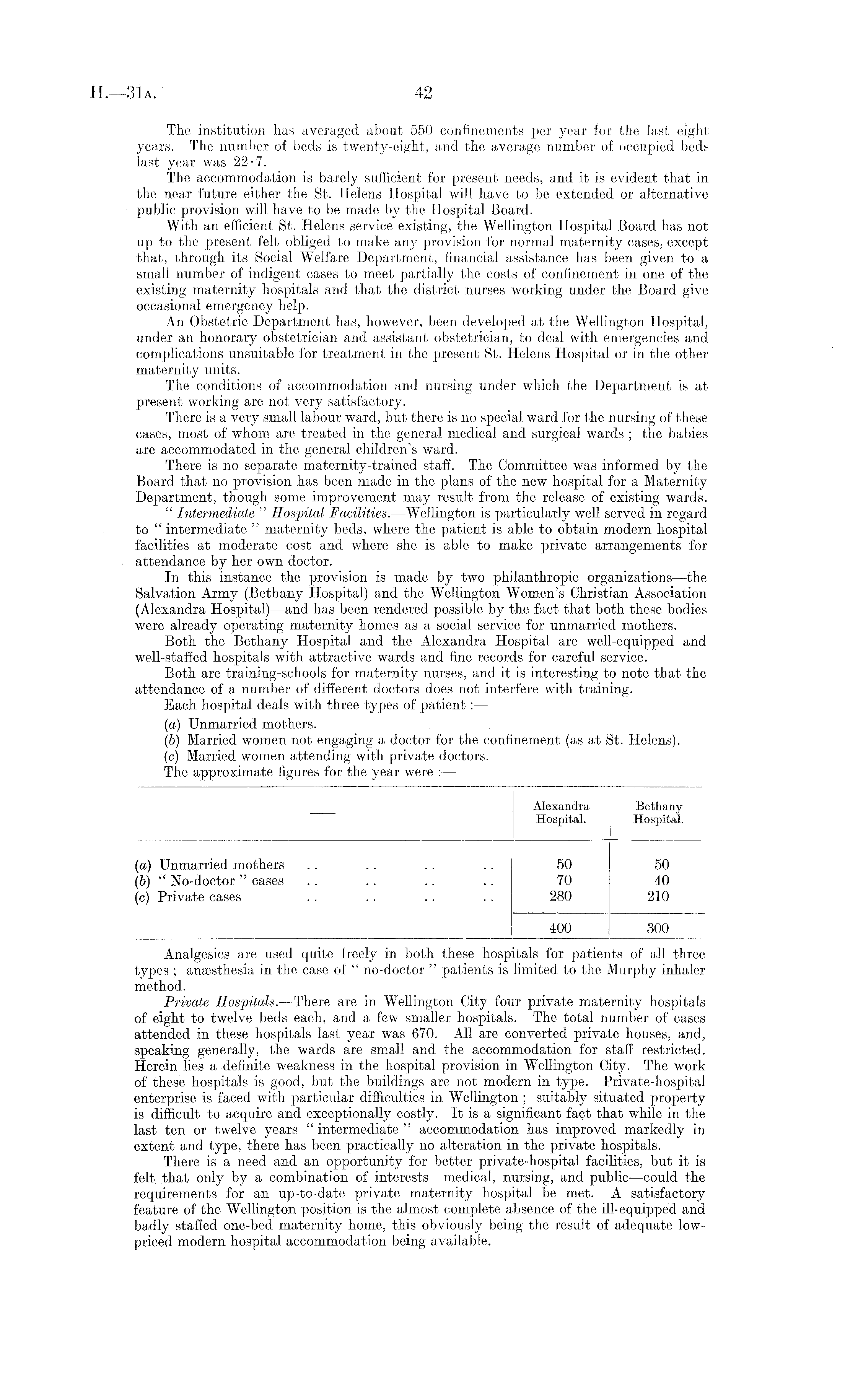 The institution has averaged about 550 confinements per year for the last eight years. The number of beds is twenty-eight, and the average number of occupied beds last year was 22-7. The accommodation is barely sufficient for present needs, and it is evident that in the near future either the St. Helens Hospital will have to be extended or alternative public provision will have to be made by the Hospital Board. With an efficient St. Helens service existing, the Wellington Hospital Board has not up to the present felt obliged to make any provision for normal maternity cases, except that, through its Social Welfare Department, financial assistance has been given to a small number of indigent cases to meet partially the costs of confinement in one of the existing maternity hospitals and that the district nurses working under the Board give occasional emergency help. An Obstetric Department has, however, been developed at the Wellington Hospital, under an honorary obstetrician and assistant obstetrician, to deal with emergencies and complications unsuitable for treatment in the present St. Helens Hospital or in the other maternity units. The conditions of accommodation and nursing under which the Department is at present working are not very satisfactory. There is a very small labour ward, but there is no special ward for the nursing of these cases, most of whom are treated in the general medical and surgical wards ; the babies are accommodated in the general children's ward. There is no separate maternity-trained staff. The Committee was informed by the Board that no provision has been made in the plans of the new hospital for a Maternity Department, though some improvement may result from the release of existing wards. " Intermediate " Hospital Facilities.—Wellington is particularly well served in regard to " intermediate " maternity beds, where the patient is able to obtain modern hospital facilities at moderate cost and where she is able to make private arrangements for attendance by her own doctor. In this instance the provision is made by two philanthropic organizations—the Salvation Army (Bethany Hospital) and the Wellington Women's Christian Association (Alexandra Hospital)—and has been rendered possible by the fact that both these bodies were already operating maternity homes as a social service for unmarried mothers. Both the Bethany Hospital and the Alexandra Hospital are well-equipped and well-staffed hospitals with attractive wards and fine records for careful service. Both are training-schools for maternity nurses, and it is interesting to note that the attendance of a number of different doctors does not interfere with training. Each hospital deals with three types of patient:— (a) Unmarried mothers. (b) Married women not engaging a doctor for the confinement (as at St. Helens). (c) Married women attending with private doctors. The approximate figures for the year were : —