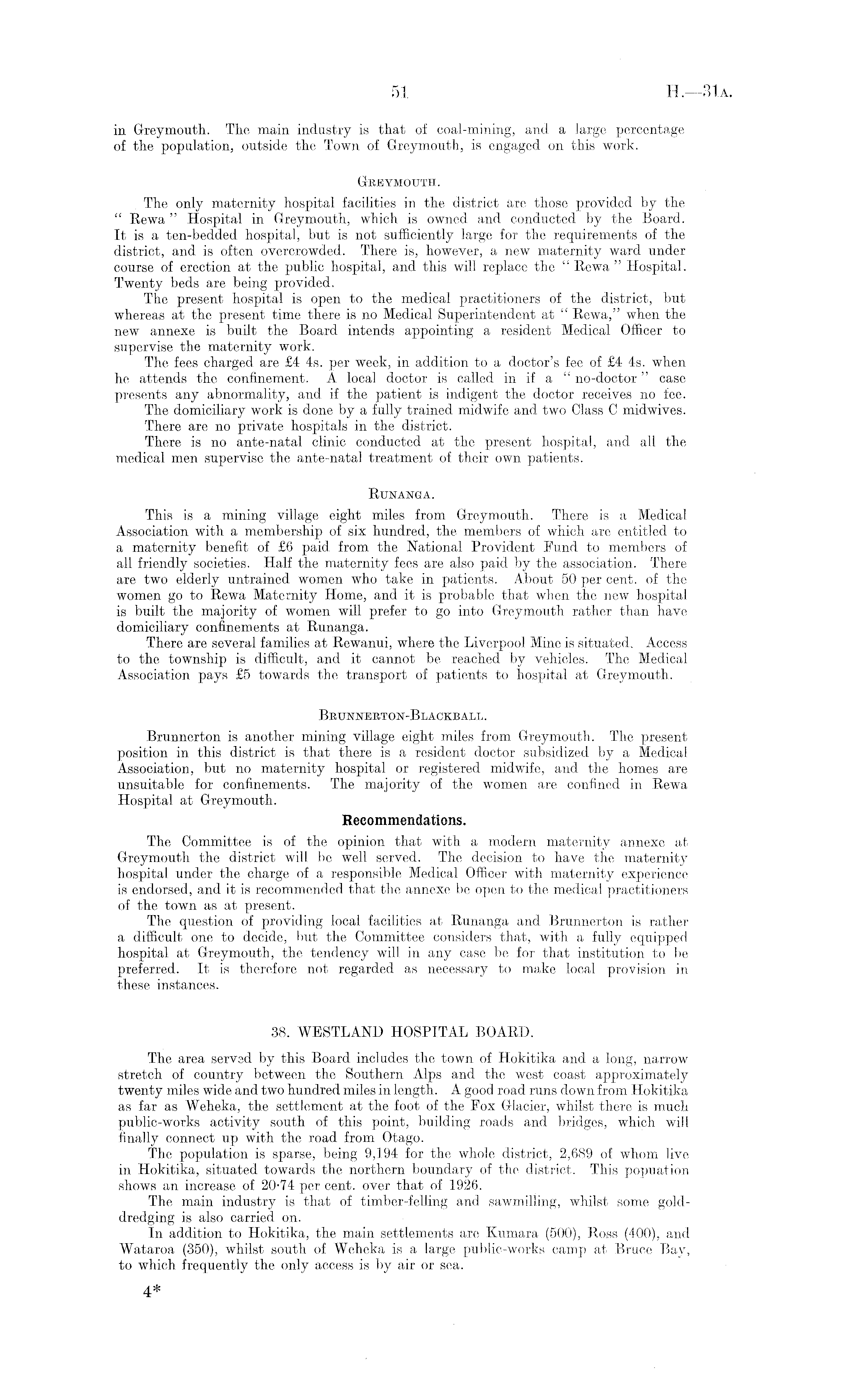 ill Greymouth. Tlie main industry is that of coal-mining, and a large percentage of the population, outside the Town of Greymouth, is engaged on this work. Greymouth. The only maternity hospital facilities in the district are those provided by the " Rewa " Hospital in Greymouth, which is owned and conducted by the Board. It is a ten-bedded hospital, but is not sufficiently large for the requirements of the district, and is often overcrowded. There is, however, a new maternity ward under course of erection at the public hospital, and this will replace the " Rewa " Hospital. Twenty beds are being provided. The present hospital is open to the medical practitioners of the district, but whereas at the present time there is no Medical Superintendent at " Eewa," when the new annexe is built the Board intends appointing a resident Medical Officer to supervise the maternity work. The fees charged are £4 4s. per week, in addition to a doctor's fee of £4 4s. when he attends the confinement. A local doctor is called in if a " no-doctor" case presents any abnormality, and if the patient is indigent the doctor receives no fee. The domiciliary work is done by a fully trained midwife and two Class C midwives. There are no private hospitals in the district. There is no ante-natal clinic conducted at the present hospital, and all the medical men supervise the ante-natal treatment of their own patients. Runanga. This is a mining village eight miles from Greymouth. There is a Medical Association with a membership of six hundred, the members of which are entitled to a maternity benefit of £6 paid from the National Provident Fund to members of all friendly societies. Half the maternity fees are also paid by the association. There are two elderly untrained women who take in patients. About 50 per cent, of the women go to Rewa Maternity Home, and it is probable that when the new hospital is built the majority of women will prefer to go into Greymouth rather than have domiciliary confinements at Runanga. There are several families at Rewanui, where the Liverpool Mine is situated. Access to the township is difficult, and it cannot be reached by vehicles. The Medical Association pays £5 towards the transport of patients to hospital at Greymouth. Brunnerton-Blackball. Brunnerton is another mining village eight miles from Greymouth. The present position in this district is that there is a resident doctor subsidized by a Medical Association, but no maternity hospital or registered midwife, and the homes are unsuitable for confinements. The majority of the women are confined in Rewa Hospital at Greymouth. Recommendations. The Committee is of the opinion that with a modern maternity annexe at Greymouth the district will be well served. The decision to have the maternity hospital under the charge of a responsible Medical Officer with maternity experience is endorsed, and it is recommended that the annexe be open to the medical practitioners of the town as at present. The question of providing local facilities at Runanga and Brunnerton is rather a difficult one to decide, but the Committee considers that, with a fully equipped hospital at Greymouth, the tendency will in any case be for that institution to be preferred. It is therefore not regarded as necessary to make local provision in these instances. 38. WESTLAND HOSPITAL BOARD. The area served by this Board includes the town of Hokitika and a long, narrow stretch of country between the Southern Alps and the west coast approximately twenty miles wide and two hundred miles in length. A good road runs down from Hokitika as far as Weheka, the settlement at the foot of the Fox Glacier, whilst there is much public-works activity south of this point, building roads and bridges, which will finally connect up with the road from Otago. The population is sparse, being 9,194 for the whole district, 2,689 of whom live in Hokitika, situated towards the northern boundary of the district. This popuation shows an increase of 2074 per cent, over that of 1926. The main industry is that of timber-felling and sawmilling, whilst some golddredging is also carried on. In addition to Hokitika, the main settlements are Kumara (500), Ross (400), and Wataroa (350), whilst south of Weheka is a large public-works camp at Bruce Bay, to which frequently the only access is by air or sea. 4*