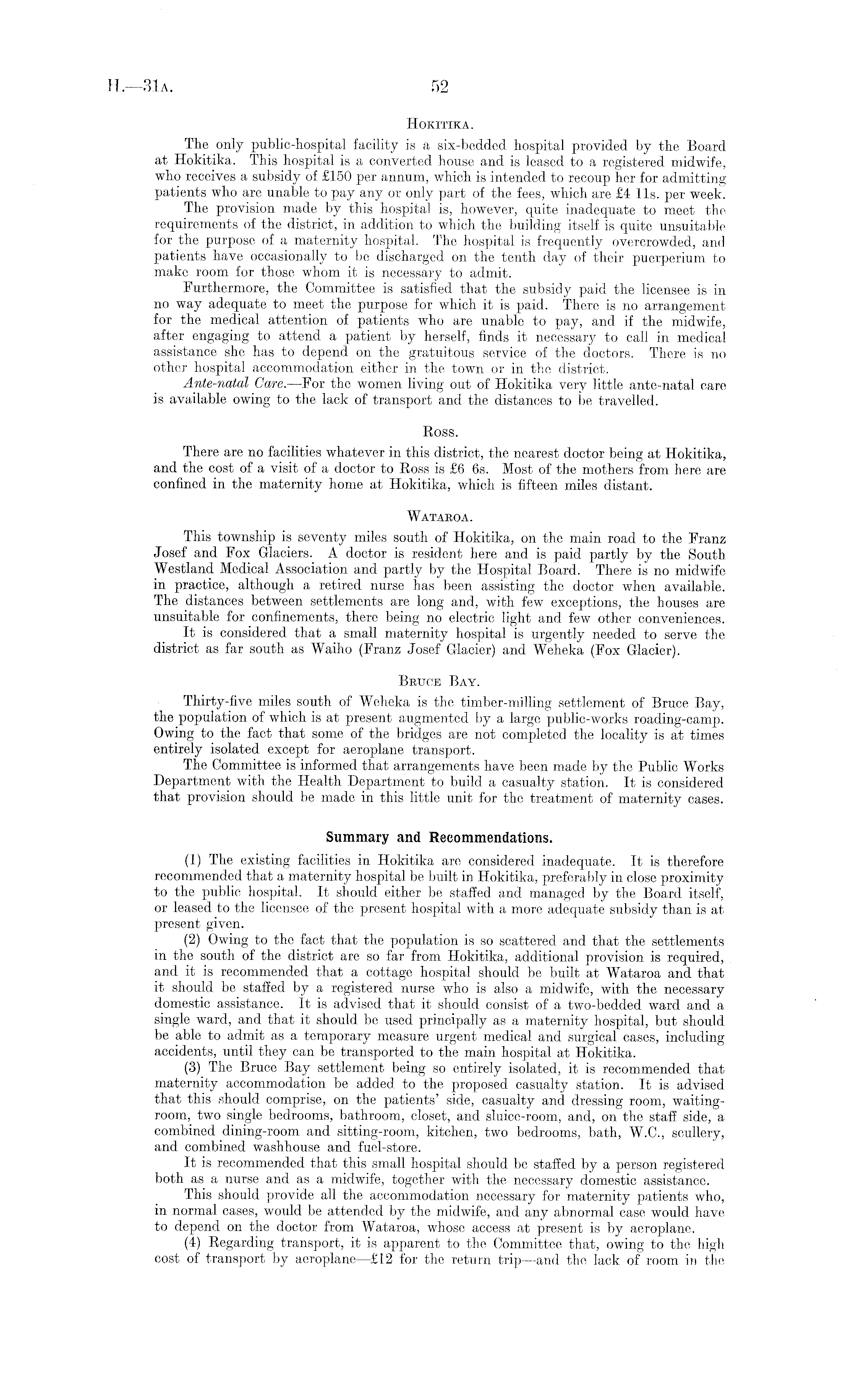 Hokitika. The only public-hospital facility is a six-bedded hospital provided by the Board at Hokitika. This hospital is a converted house and is leased to a registered midwife, who receives a subsidy of £150 per annum, which is intended to recoup her for admitting patients who are unable to pay any or only part of the fees, which are £4 lis. per week. The provision made by this hospital is, however, quite inadequate to meet the requirements of the district, in addition to which the building itself is quite unsuitable for the purpose of a maternity hospital. The hospital is frequently overcrowded, and patients have occasionally to be discharged on the tenth day of their puerperium to make room for those whom it is necessary to admit. Furthermore, the Committee is satisfied that the subsidy paid the licensee is in no way adequate to meet the purpose for which it is paid. There is no arrangement for the medical attention of patients who are unable to pay, and if the midwife, after engaging to attend a patient by herself, finds it necessary to call in medical assistance she has to depend on the gratuitous service of the doctors. There is no other hospital accommodation either in the town or in the district. Ante-natal Care. —For the women living out of Hokitika very little ante-natal care is available owing to the lack of transport and the distances to be travelled. Ross. There are no facilities whatever in this district, the nearest doctor being at Hokitika, and the cost of a visit of a doctor to Ross is £6 6s. Most of the mothers from here are confined in the maternity home at Hokitika, which is fifteen miles distant. Watakoa. This township is seventy miles south of Hokitika, on the main road to the Franz Josef and Fox Glaciers. A doctor is resident here and is paid partly by the South Westland Medical Association and partly by the Hospital Board. There is no midwife in practice, although a retired nurse has been assisting the doctor when available. The distances between settlements are long and, with few exceptions, the houses are unsuitable for confinements, there being no electric light and few other conveniences. It is considered that a small maternity hospital is urgently needed to serve the district as far south as Waiho (Franz Josef Glacier) and Weheka (Fox Glacier). Bruce Bay. Thirty-five miles south of Weheka is the timber-milling settlement of Bruce Bay, the population of which is at present augmented by a large public-works roading-camp. Owing to the fact that some of the bridges are not completed the locality is at times entirely isolated except for aeroplane transport. The Committee is informed that arrangements have been made by the Public Works Department with the Health Department to build a casualty station. It is considered that provision should be made in this little unit for the treatment of maternity cases. Summary and Recommendations. (1) The existing facilities in Hokitika are considered inadequate. It is therefore recommended that a maternity hospital be built in Hokitika, preferably in close proximity to the public hospital. It should either be staffed and managed by the Board itself, or leased to the licensee of the present hospital with a more adequate subsidy than is at present given. (2) Owing to the fact that the population is so scattered and that the settlements in the south of the district are so far from Hokitika, additional provision is required, and it is recommended that a cottage hospital should be built at Wataroa and that it should be staffed by a registered nurse who is also a midwife, with the necessary domestic assistance. It is advised that it should consist of a two-bedded ward and a single ward, and that it should be used principally as a maternity hospital, but should be able to admit as a temporary measure urgent medical and surgical cases, including accidents, until they can be transported to the main hospital at Hokitika. (3) The Bruce Bay settlement being so entirely isolated, it is recommended that maternity accommodation be added to the proposed casualty station. It is advised that this should comprise, on the patients' side, casualty and dressing room, waitingroom, two single bedrooms, bathroom, closet, and sluice-room, and, on the staff side, a combined dining-room and sitting-room, kitchen, two bedrooms, bath, W.C., scullery, and combined washhouse and fuel-store. It is recommended that this small hospital should be staffed by a person registered both as a nurse and as a midwife, together with the necessary domestic assistance. This should provide all the accommodation necessary for maternity patients who, in normal cases, would be attended by the midwife, and any abnormal case would have to depend on the doctor from Wataroa, whose access at present is by aeroplane. (4) Regarding transport, it is apparent to the Committee that, owing to the high cost of transport by aeroplane—£l2 for the return trip—and the lack of room in the