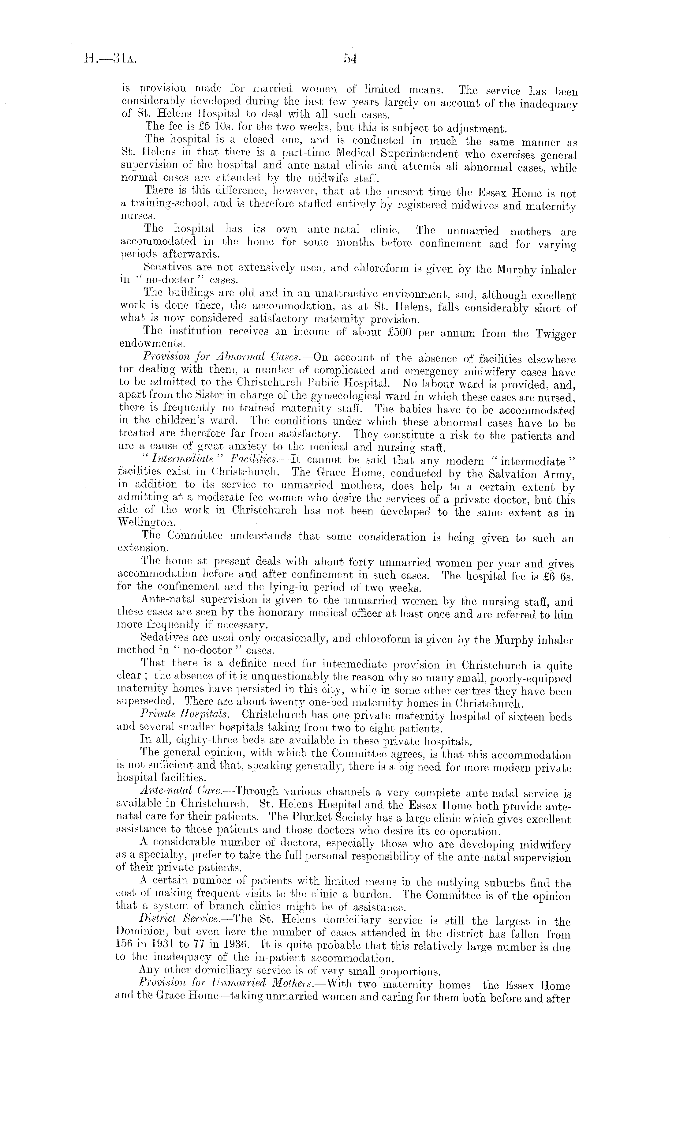 is provision made for married women of limited means. The service has been considerably developed during the last few years largely on account of the inadequacy of St. Helens Hospital to deal with all such cases. The fee is £5 10s. for the two weeks, but this is subject to adjustment. The hospital is a closed one, and is conducted in much the same manner as St. Helens in that there is a part-time Medical Superintendent who exercises general supervision of the hospital and ante-natal clinic and attends all abnormal cases, while normal cases are attended by the midwife staff. There is this difference, however, that at the present time the Essex Home is not a training-school, and is therefore staffed entirely by registered midwives and maternity nurses. The hospital has its own ante-natal clinic. The unmarried mothers are accommodated in the home for some months before confinement and for varying periods afterwards. Sedatives are not extensively used, and chloroform is given by the Murphy inhaler in " no-doctor " cases. The buildings are old and in an unattractive environment, and, although excellent work is done there, the accommodation, as at St. Helens, falls considerably short of what is now considered satisfactory maternity provision. The institution receives an income of about £500 per annum from the Twigger endowments. Provision for Abnormal Gases. —On account of the absence of facilities elsewhere lor dealing with them, a number of complicated and emergency midwifery cases have to be admitted to the Christchurch Public Hospital. No labour ward is provided, and, apart from the Sister in charge of the gynaecological ward in which these cases are nursed,' there is frequently no trained maternity staff. The babies have to be accommodated in the children's ward. The conditions under which these abnormal cases have to be treated are therefore far from satisfactory. They constitute a risk to the patients and are a cause of great anxiety to the medical and nursing staff. Intermediate Facilities.—lt cannot be said that any modern intermediate " facilities exist in Christchurch. The Grace Home, conducted by the Salvation Army, in addition to its service to unmarried mothers, does help to a certain extent by admitting at a moderate fee women who desire the services of a private doctor, but this side of the work in Christchurch has not been developed to the same extent as in Wellington. Ihe Committee understands that some consideration is being given to such an extension. The home at present deals with about forty unmarried women per year and gives accommodation before and after confinement in such cases. The hospital fee is £6 6s. for the confinement and the lying-in period of two weeks. Ante-natal supervision is given to the unmarried women by the nursing staff, and these cases are seen by the honorary medical officer at least once and are referred to him more frequently if necessary. Sedatives are used only occasionally, and chloroform is given by the Murphy inhaler method in " no-doctor " cases. That there is a definite need for intermediate provision in Christchurch is quite clear ; the absence ol it is unquestionably the reason why so many small, poorly-equipped maternity homes have persisted in this city, while in some other centres they have been superseded. There are about twenty one-bed maternity homes in Christchurch. Private Hospitals.—Christchurch has one private maternity hospital of sixteen beds and several smaller hospitals taking from two to eight patients. In all, eighty-three beds are available in these private hospitals. The general opinion, with which the Committee agrees, is that this accommodation is not sufficient and that, speaking generally, there is a big need for more modern private hospital facilities. Ante-natal Care. Through various channels a very complete ante-natal service is available in Christchurch. St. Helens Hospital and the Essex Home both provide antenatal care for their patients. The Plunket Society has a large clinic which gives excellent assistance to those patients and those doctors who desire its co-operation. A considerable number of doctors, especially those who are developing midwifery as a specialty, prefer to take the full personal responsibility of the ante-natal supervision of their private patients. A certain number of patients with limited means in the outlying suburbs find the cost of making frequent visits to the clinic a burden. The Committee is of the opinion that a system of branch clinics might be of assistance. District. Service. —The St. Helens domiciliary service is still the largest in the Dominion, but even here the number of cases attended in the district has fallen from 156 in 1931 to 77 in 1936. It is quite probable that this relatively large number is due to the inadequacy of the in-patient accommodation. Any other domiciliary service is of very small proportions. Provision for Unmarried, Mothers.—With two maternity homes—the Essex Home and the Grace Home—taking unmarried women and caring for them both before and after