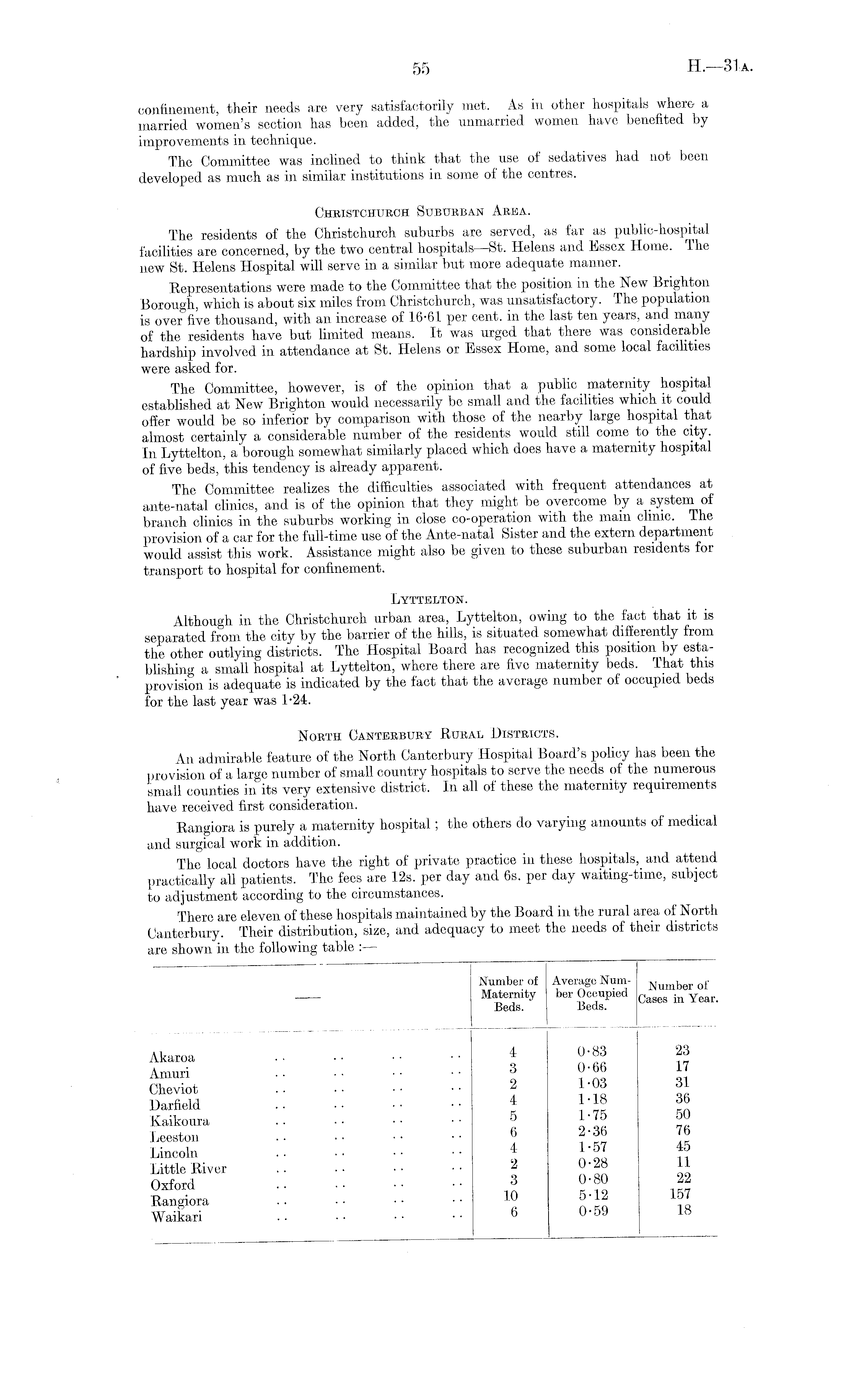 confinement, their needs are very satisfactorily met. As in other hospitals where a married women's section has been added, the unmarried women have benefited by improvements in technique. The Committee was inclined to think that the use of sedatives had not been developed as much as in similar institutions in some of the centres. Christchurch Suburban Area. The residents of the Christchurch suburbs are served, as far as public-hospital facilities are concerned, by the two central hospitals St. Helens and Essex Home. The new St. Helens Hospital will serve in a similar but more adequate manner. Representations were made to the Committee that the position in the New Brighton Borough, which is about six miles from ChristchuTch, was unsatisfactory. The population is over five thousand, with an increase of 16-61 per cent, in the last ten years, and many of the residents have but limited means. It was urged that there was considerable hardship involved in attendance at St. Helens or Essex Home, and some local facilities were asked for. The Committee, however, is of the opinion that a public _ maternity hospital established at New Brighton would necessarily be small and the facilities which it could offer would be so inferior by comparison with those of the nearby large hospital that almost certainly a considerable number of the residents would still come to the city. In Lyttelton, a borough somewhat similarly placed which does have a maternity hospital of five beds, this tendency is already apparent. The Committee realizes the difficulties associated with frequent attendances at ante-natal clinics, and is of the opinion that they might be overcome by a system of branch clinics in the suburbs working in close co-operation with the main clinic. The provision of a car for the full-time use of the Ante-natal Sister and the extern department would assist this work. Assistance might also be given to these suburban residents for transport to hospital for confinement. Lyttelton. Although in the Christchurch urban area, Lyttelton, owing to the fact that it is separated from the city by the barrier of the hills, is situated somewhat differently from the other outlying districts. The Hospital Board has recognized this position by establishing a small hospital at Lyttelton, where there are five maternity beds. That this provision is adequate is indicated by the fact that the average number of occupied beds for the last year was 1-24. North Canterbury Rural Districts. An admirable feature of the North Canterbury Hospital Board's policy has been the provision of a large number of small country hospitals to serve the needs of the numerous small counties in its very extensive district. In all of these the maternity requirements have received first consideration. Rangiora is purely a maternity hospital; the others do varying amounts of medical and surgical work in addition. The local doctors have the right of private practice in these hospitals,_ and attend practically all patients. The fees are 12s. per day and 6s. per day waiting-time, subject to adjustment according to the circumstances. There are eleven of these hospitals maintained by the Board in the rural area of North Canterbury. Their distribution, size, and adequacy to meet the needs of their districts are shown in the following table : —