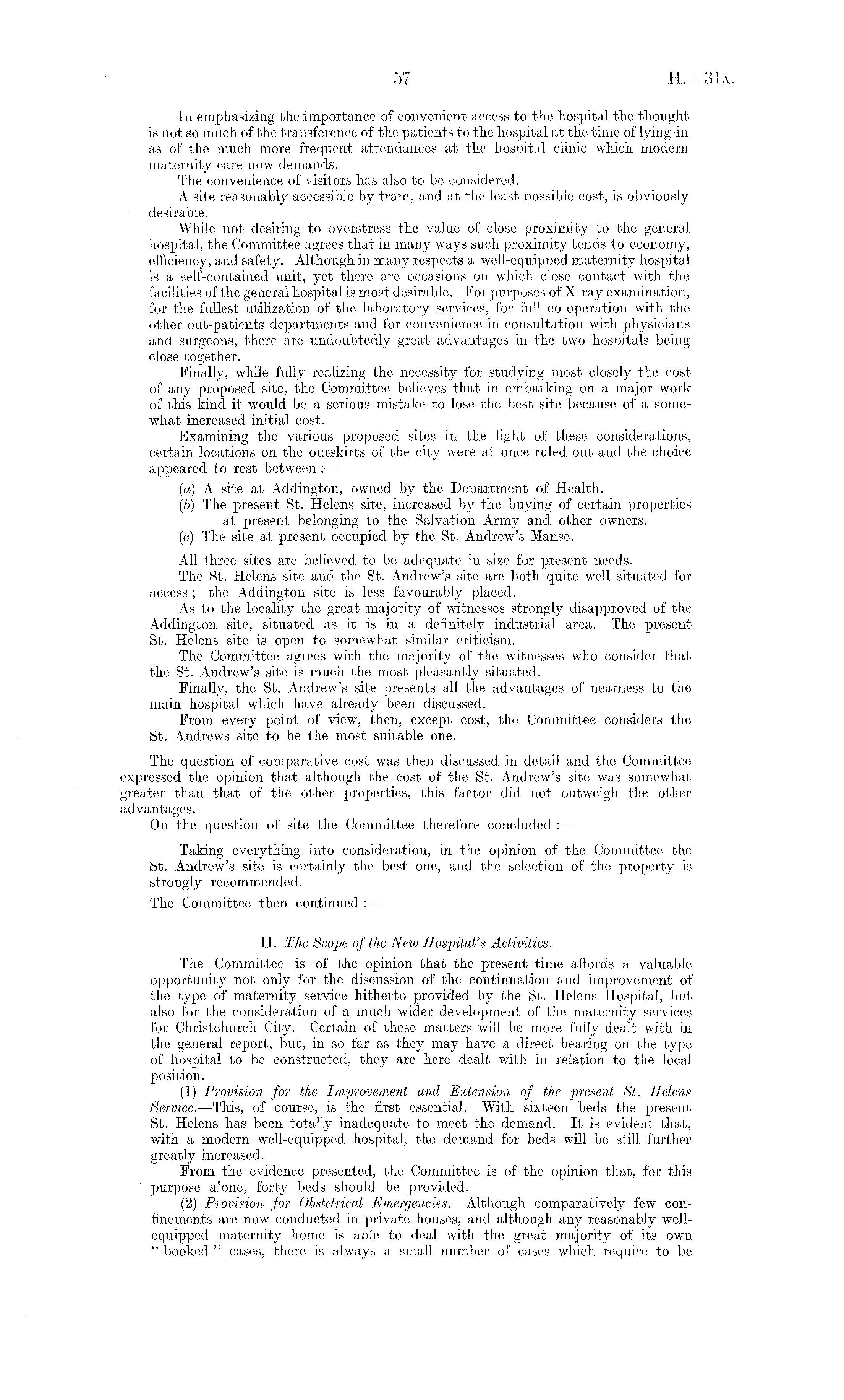 In emphasizing the importance of convenient access to the hospital the thought is not so much of the transference of the patients to the hospital at the time of lying-in as of the much more frequent attendances at the hospital clinic which modern maternity care now demands. The convenience of visitors has also to be considered. A site reasonably accessible by tram, and at the least possible cost, is obviously desirable. While not desiring to overstress the value of close proximity to the general hospital, the Committee agrees that in many ways such proximity tends to economy, efficiency, and safety. Although in many respects a well-equipped maternity hospital is a self-contained unit, yet there are occasions on which close contact with the facilities of the general hospital is most desirable. For purposes of X-ray examination, for the fullest utilization of the laboratory services, for full co-operation with the other out-patients departments and for convenience in consultation with physicians and surgeons, there are undoubtedly great advantages in the two hospitals being close together. Finally, while fully realizing the necessity for studying most closely the cost of any proposed site, the Committee believes that in embarking on a major work of this kind it would be a serious mistake to lose the best site because of a somewhat increased initial cost. Examining the various proposed sites in the light of these considerations, certain locations on the outskirts of the city were at once ruled out and the choice appeared to rest between : — (a) A site at Addington, owned by the Department of Health. (b) The present St. Helens site, increased by the buying of certain properties at present belonging to the Salvation Army and other owners. (c) The site at present occupied by the St. Andrew's Manse. All three sites are believed to be adequate in size for present needs. The St. Helens site and the St. Andrew's site are both quite well situated for access ; the Addington site is less favourably placed. As to the locality the great majority of witnesses strongly disapproved of the Addington site, situated as it is in a definitely industrial area. The present St. Helens site is open to somewhat similar criticism. The Committee agrees with the majority of the witnesses who consider that the St. Andrew's site is much the most pleasantly situated. Finally, the St. Andrew's site presents all the advantages of nearness to the main hospital which have already been discussed. From every point of view, then, except cost, the Committee considers the St. Andrews site to be the most suitable one. The question of comparative cost was then discussed in detail and the Committee expressed the opinion that although the cost of the St. Andrew's site was somewhat greater than that of the other properties, this factor did not outweigh the other advantages. On the question of site the Committee therefore concluded : — Taking everything into consideration, in the opinion of the Committee the St. Andrew's site is certainly the best one, and the selection of the property is strongly recommended. The Committee then continued :— 11. The Scope of the New Hospital's Activities. The Committee is of the opinion that the present time affords a valuable opportunity not only for the discussion of the continuation and improvement of the type of maternity service hitherto provided by the St. Helens Hospital, but also for the consideration of a much wider development of the maternity services for Christchurch City. Certain of these matters will be more fully dealt with in the general report, but, in so far as they may have a direct bearing on the type of hospital to be constructed, they are here dealt with in relation to the local position. (1) Provision for the Improvement and Extension of the present St. Helens Service. —This, of course, is the first essential. With sixteen beds the present St. Helens has been totally inadequate to meet the demand. It is evident that, with a modern well-equipped hospital, the demand for beds will be still further greatly increased. From the evidence presented, the Committee is of the opinion that, for this purpose alone, forty beds should be provided. (2) Provision for Obstetrical Emergencies.—Although comparatively few confinements are now conducted in private houses, and although any reasonably wellequipped maternity home is able to deal with the great majority of its own " booked " cases, there is always a small number of cases which require to be