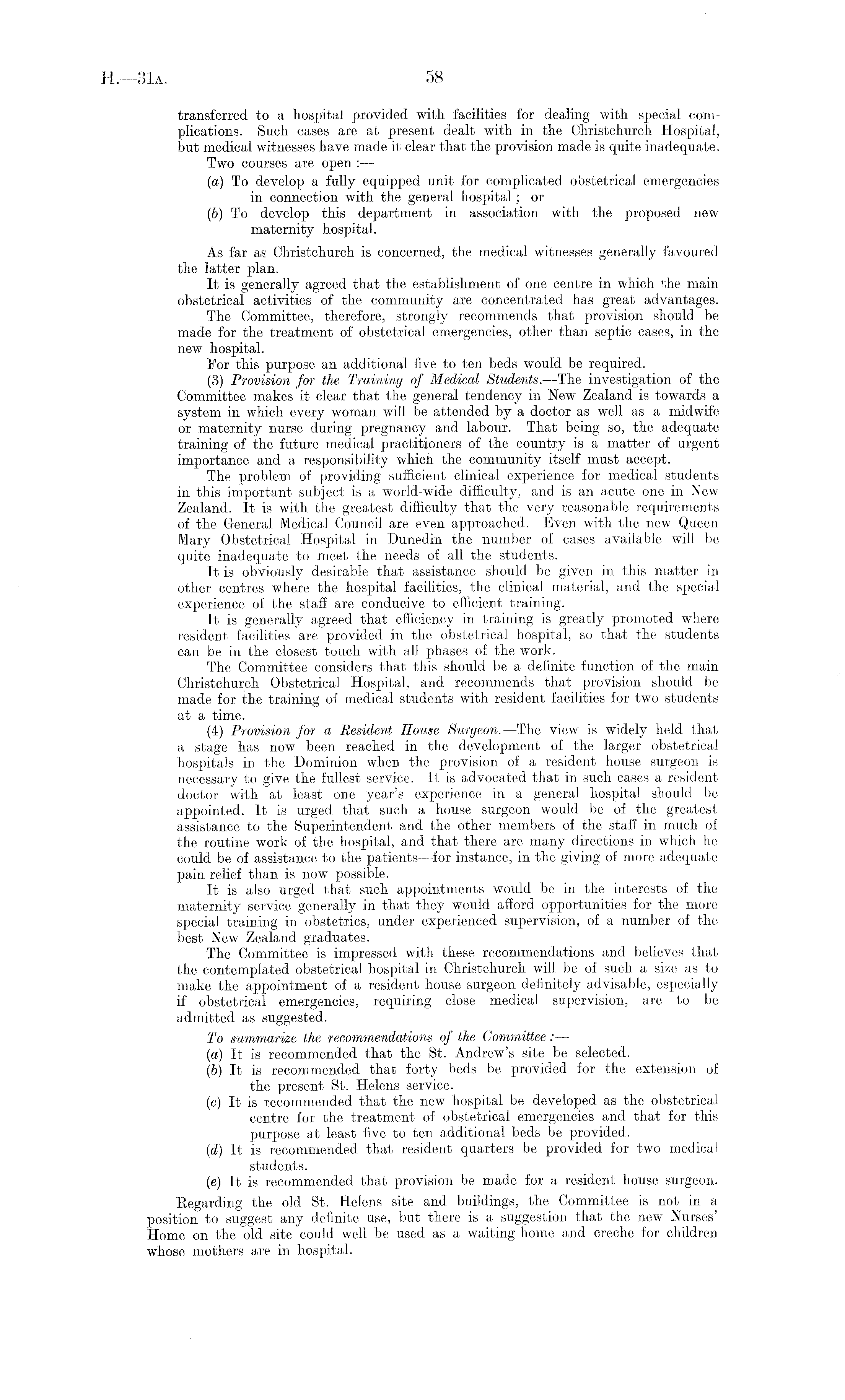 transferred to a hospital provided with facilities for dealing with special complications. Such cases are at present dealt with in the Christchurch Hospital, but medical witnesses have made it clear that the provision made is quite inadequate. Two courses are open : — (а) To develop a fully equipped unit for complicated obstetrical emergencies in connection with the general hospital; or (б) To develop this department in association with the proposed new maternity hospital. As far as Christchurch is concerned, the medical witnesses generally favoured the latter plan. It is generally agreed that the establishment of one centre in which the main obstetrical activities of the community are concentrated has great advantages. The Committee, therefore, strongly recommends that provision should be made for the treatment of obstetrical emergencies, other than septic cases, in the new hospital. For this purpose an additional five to ten beds would be required. (3) Provision for the Training of Medical Students. —The investigation of the Committee makes it clear that the general tendency in New Zealand is towards a system in which every woman will be attended by a doctor as well as a midwife or maternity nurse during pregnancy and labour. That being so, the adequate training of the future medical practitioners of the country is a matter of urgent importance and a responsibility which the community itself must accept. The problem of providing sufficient clinical experience for medical students in this important subject is a world-wide difficulty, and is an acute one in New Zealand. It is with the greatest difficulty that the very reasonable requirements of the General Medical Council are even approached. Even with the new Queen Mary Obstetrical Hospital in Dunedin the number of cases available will be quite inadequate to meet the needs of all the students. It is obviously desirable that assistance should be given in this matter in other centres where the hospital facilities, the clinical material, and the special experience of the staff are conducive to efficient training. It is generally agreed that efficiency in training is greatly promoted where resident facilities are provided in the obstetrical hospital, so that the students can be in the closest touch with all phases of the work. The Committee considers that this should be a definite function of the main Christchurch Obstetrical Hospital, and recommends that provision should be made for the training of medical students with resident facilities for two students at a time. (4) Provision for a Resident House Surgeon.—The view is widely held that a stage has now been reached in the development of the larger obstetrical hospitals in the Dominion when the provision of a resident house surgeon is necessary to give the fullest service. It is advocated that in such cases a resident doctor with at least one year's experience in a general hospital should be appointed. It is urged that such a house surgeon would be of the greatest assistance to the Superintendent and the other members of the staff in much of the routine work of the hospital, and that there are many directions in which he could be of assistance to the patients —for instance, in the giving of more adequate pain relief than is now possible. It is also urged that such appointments would be in the interests of the maternity service generally in that they would afford opportunities for the more special training in obstetrics, under experienced supervision, of a number of the best New Zealand graduates. The Committee is impressed with these recommendations and believes that the contemplated obstetrical hospital in Christchurch will be of such a size as to make the appointment of a resident house surgeon definitely advisable, especially if obstetrical emergencies, requiring close medical supervision, are to be admitted as suggested. To summarize the recommendations of the Committee: — (а) It is recommended that the St. Andrew's site be selected. (б) It is recommended that forty beds be provided for the extension of the present St. Helens service. (c) It is recommended that the new hospital be developed as the obstetrical centre for the treatment of obstetrical emergencies and that for this purpose at least five to ten additional beds be provided. (d) It is recommended that resident quarters be provided for two medical students. (e) It is recommended that provision be made for a resident house surgeon. Regarding the old St. Helens site and buildings, the Committee is not in a position to suggest any definite use, but there is a suggestion that the new Nurses' Home on the old site could well be used as a waiting home and creche for children whose mothers are in hospital.