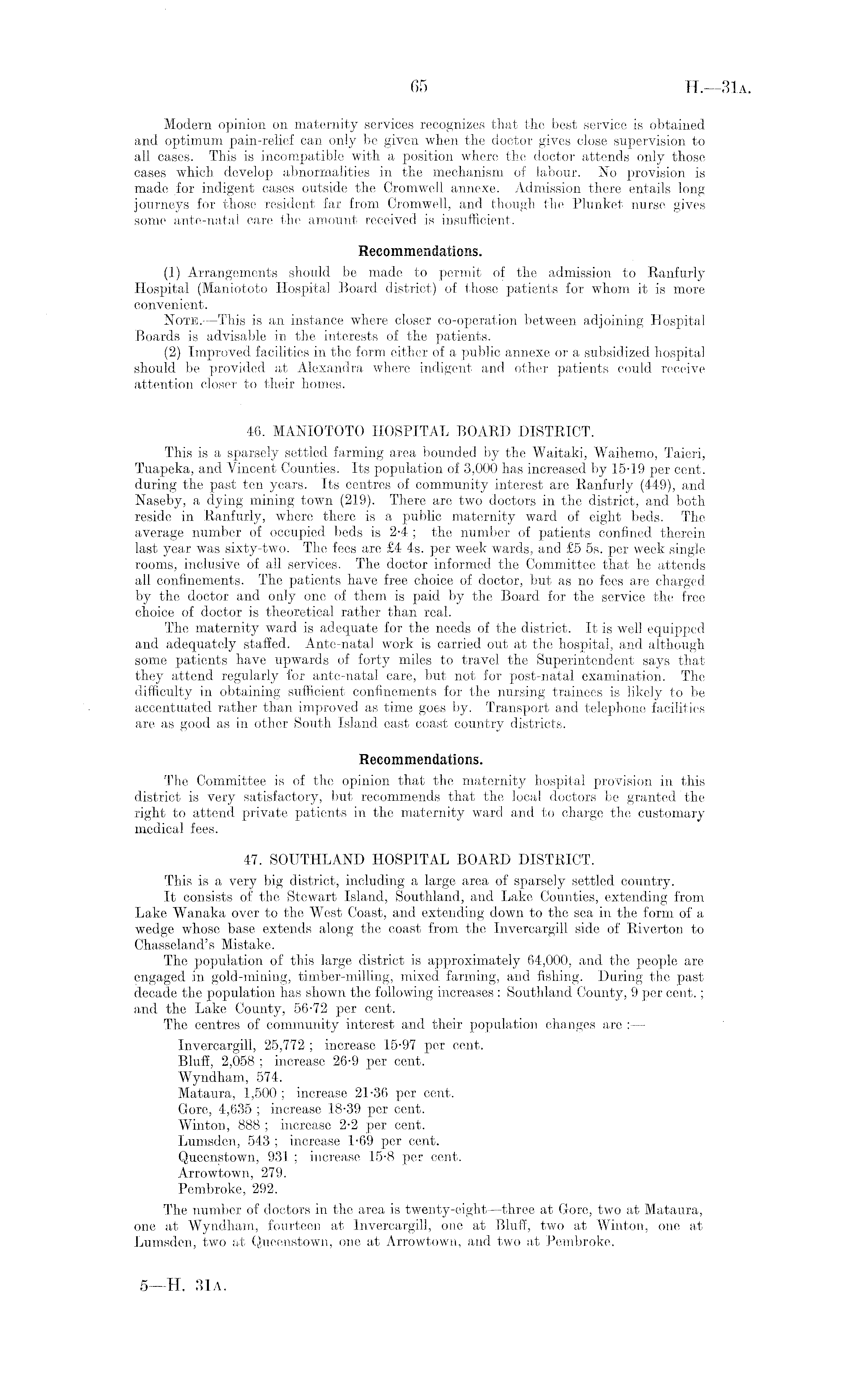 Modern opinion on maternity services recognizes that the best service is obtained and optimum pain-relief can only be given when the doctor gives close supervision to all cases. This is incompatible with a position where the doctor attends only those cases which develop abnormalities in the mechanism of labour. No provision is made for indigent cases outside the Cromwell annexe. Admission there entails long journeys for those resident far from Cromwell, and though the Plunket nurse gives some ante-natal care the amount received is insufficient. Recommendations. (1) Arrangements should be made to permit of the admission to Ranfurly Hospital (Maniototo Hospital Board district) of those patients for whom it is more convenient. Note. —This is an instance where closer co-operation between adjoining Hospital Boards is advisable in the interests of the patients. (2) Improved facilities in the form either of a public annexe or a subsidized hospital should be provided at Alexandra where indigent and other patients could receive attention closer to their homes. 46. MANIOTOTO HOSPITAL BOARD DISTRICT. This is a sparsely settled farming area bounded by the Waitaki, Waihemo, Taieri, Tuapeka, and Vincent Counties. Its population of 3,000 has increased by 15-19 per cent, during the past ten years. Its centres of community interest are Ranfurly (449), and Naseby, a dying mining town (219). There are two doctors in the district, and both reside in Ranfurly, where there is a public maternity ward of eight beds. The average number of occupied beds is 2-4 ; the number of patients confined therein last year was sixty-two. The fees are £4 4s. per week wards, and £5 ss. per week single rooms, inclusive of all services. The doctor informed the Committee that he attends all confinements. The patients have free choice of doctor, but as no fees are charged by the doctor and only one of them is paid by the Board for the service the free choice of doctor is theoretical rather than real. The maternity ward is adequate for the needs of the district. It is well equipped and adequately staffed. Ante-natal work is carried out at the hospital, and although some patients have upwards of forty miles to travel the Superintendent says that they attend regularly for ante-natal care, but not for post-natal examination. The difficulty in obtaining sufficient confinements for the nursing trainees is likely to be accentuated rather than improved as time goes by. Transport and telephone facilities are as good as in other South Island east coast country districts. Recommendations. The Committee is of the opinion that the maternity hospital provision in this district is very satisfactory, but recommends that the local doctors be granted the right to attend private patients in the maternity ward and to charge the customary medical fees. 47. SOUTHLAND HOSPITAL BOARD DISTRICT. This is a very big district, including a large area of sparsely settled country. It consists of the Stewart Island, Southland, and Lake Counties, extending from Lake Wanaka over to the West Coast, and extending down to the sea in the form of a wedge whose base extends along the coast from the Invereargill side of Riverton to Chasseland's Mistake. The population of this large district is approximately 64,000, and the people are engaged in gold-mining, timber-milling, mixed farming, and fishing. During the past decade the population has shown the following increases : Southland County, 9 per cent.; and the Lake County, 56-72 per cent. The centres of community interest and their population changes are : — Invereargill, 25,772 ; increase 15-97 per cent. Bluff, 2,058 ; increase 26-9 per cent. Wyndham, 574. Mataura, 1,500 ; increase 21-36 per cent. Gore, 4,635 ; increase 18-39 per cent. Winton, 888 ; increase 2-2 per cent. Lumsden, 543 ; increase 1-69 per cent. Queenstown, 931 ; increase 15-8 per cent. Arrowtown, 279. Pembroke, 292. The number of doctors in the area is twenty-eight —three at Gore, two at Mataura, one at Wyndham, fourteen at Invereargill, one at Bluff, two at Winton, one at Lumsden, two at Queenstown, one at Arrowtown, and two at Pembroke.