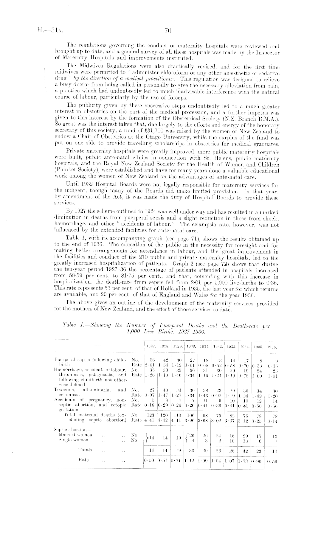 The regulations governing the conduct of maternity hospitals were reviewed and brought up to date, and a general survey of all these hospitals was made by the Inspector of Maternity Hospitals and improvements instituted. The Midwives Regulations were also drastically revised, and for the first time midwives were permitted to " administer chloroform or any other anaesthetic or sedative drug " by the direction of a medical practitioner. This regulation was designed to relieve a busy doctor from being called in personally to give the necessary alleviation from pain, a practice which had undoubtedly led to much inadvisable interference with the natural course of labour, particularly by the use of forceps. The publicity given by these successive steps undoubtedly led to a much greater interest in obstetrics on the part of the medical profession, and a further impetus was given to this interest by the formation of the Obstetrical Society (N.Z. Branch 8.M.A.). So great was the interest taken that, due largely to the efforts and energy of the honorary secretary of this society, a fund of £31,700 was raised by the women of New Zealand to endow a Chair of Obstetrics at the Otago University, while the surplus of the fund was put on one side to provide travelling scholarships in obstetrics for medical graduates. Private maternity hospitals were greatly improved, more public maternity hospitals were built, public ante-natal clinics in connection with St. Helens, public maternity hospitals, and the Royal New Zealand Society for the Health of Women and Children (Plunket Society), were established and have for many years done a valuable educational work among the women of New Zealand on the advantages of ante-natal care. Until 1932 Hospital Boards were not legally responsible for maternity services for the indigent, though many of the Boards did make limited provision. In that year, by amendment of the Act, it was made the duty of Hospital Boards to provide these services. By 1927 the scheme outlined in 1924 was well under way and has resulted in a marked diminution in deaths from puerperal sepsis and a slight reduction in those from shook, hcemorrhage, and other " accidents of labour." The eclampsia rate, however, was not influenced by the extended facilities for ante-natal care. Table 1, with its accompanying graph (see page 71), shows the results obtained up to the end of 1936. The education of the public in the necessity for foresight and for making better arrangements for attendance in labour, and the great improvement in the facilities and conduct of the 270 public and private maternity hospitals, led to the greatly increased, hospitalization of patients. Graph 2 (see page 72) shows that during the ten-year period 1927-36 the percentage of patients attended in hospitals increased froni 58-59 per cent, to 81-75 per cent., and that, coinciding with this increase in hospitalization, the death-rate from sepsis fell from 2-01 per 1,000 live-births to 0-36. .This rate represents 53 per cent, of that of Holland in 1935, the last year for which returns are available, and 29 per cent, of that of England and Wales for the year 1936. The above gives an outline of the development of the maternity services provided for the mothers of New Zealand, and the efiect of those services to date.