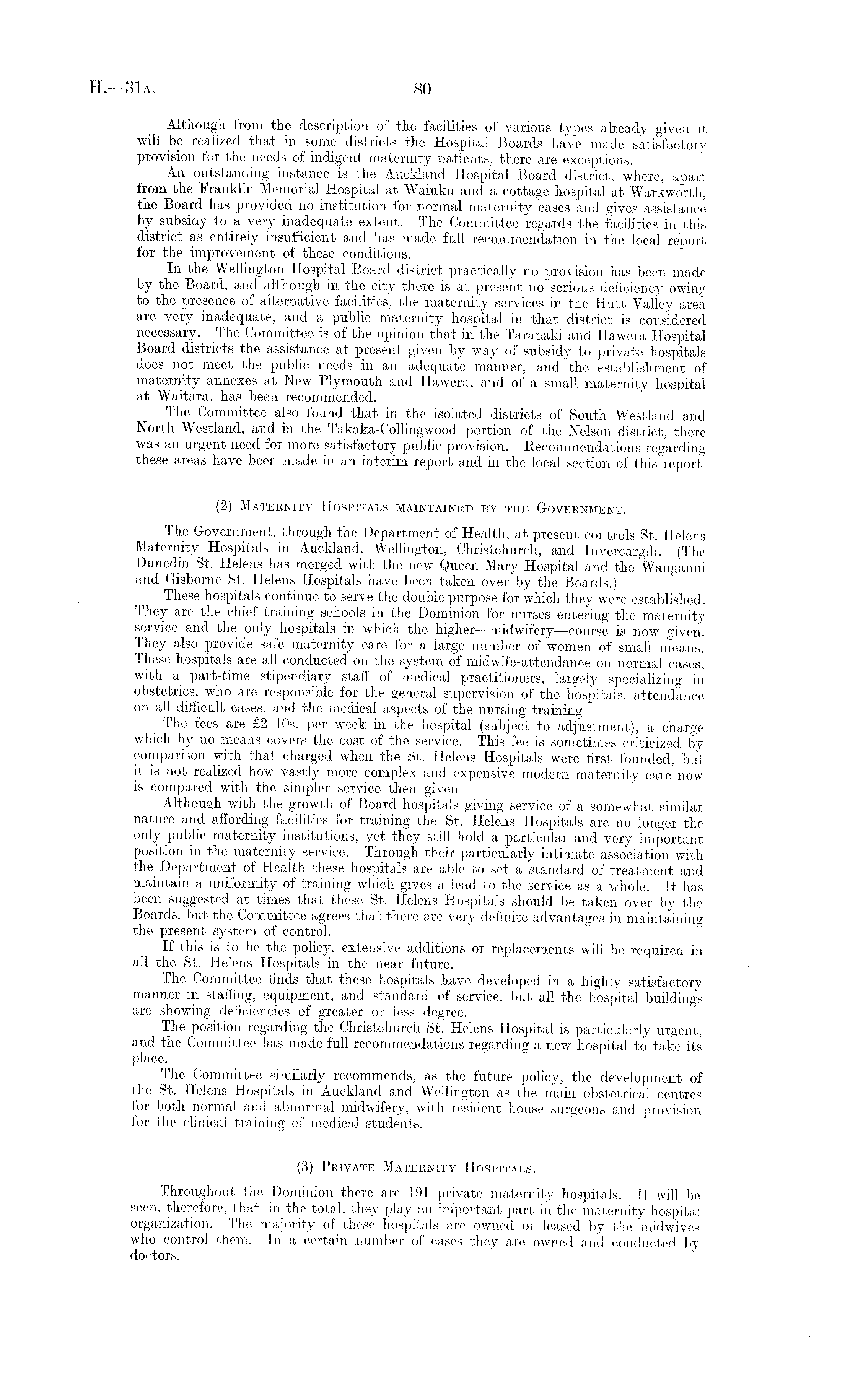 Although from the description of the facilities of various types already given it will be realized that in some districts the Hospital Boards have made satisfactory provision for the needs of indigent maternity patients, there are exceptions. An outstanding instance is the Auckland Hospital Board district, where, apart from the Franklin Memorial Hospital at Waiuku and a cottage hospital at Warkworth, the Board has provided no institution for normal maternity cases and gives assistance by subsidy to a very inadequate extent. The Committee regards the facilities in this district as entirely insufficient and has made full recommendation in the local report for the improvement of these conditions. In the Wellington Hospital Board district practically no provision has been made by the Board, and although in the city there is at present no serious deficiency owing to the presence of alternative facilities, the maternity services in the Hutt Valley area are very inadequate, and a public maternity hospital in that district is considered necessary. The Committee is of the opinion that in the Taranaki and Hawera Hospital Board districts the assistance at present given by way of subsidy to private hospitals does not meet the public needs in an adequate manner, and "the establishment of maternity annexes at New Plymouth and Hawera, and of a small maternity hospital at Waitara, has been recommended. The Committee also found that in the isolated districts of South Westland and North Westland, and in the Takaka-Collingwood portion of the Nelson district, there was an urgent need for more satisfactory public provision. Recommendations regarding these areas have been, made in an interim report and in the local section of this report. (2) Maternity Hospitals maintained by the Government. The Government, through the Department of Health, at present controls St. Helens Maternity Hospitals in Auckland, Wellington, Christchurch, and Invercargill. (The Dunedin St. Helens has merged with the new Queen Mary Hospital and the Wanganui and Gisborne St. Helens Hospitals have been taken over by the Boards.) These hospitals continue to serve the double purpose for which they were established. They are the chief training schools in the Dominion for nurses entering the maternity service and the only hospitals in which the higher—midwifery—course is now given. They also provide safe maternity care for a large number of women of small means. These hospitals are all conducted on the system of midwife-attendance on normal cases, with a part-time stipendiary staff of medical practitioners, largely specializing in obstetrics, who are responsible for the general supervision of the hospitals, attendance on all difficult cases, and the medical aspects of the nursing training. The fees are £2 10s. per week in the hospital (subject to adjustment), a charge which by no means covers the cost of the service. This fee is sometimes criticized by comparison with that charged when the St. Helens Hospitals were first founded, but it is not realized how vastly more complex and expensive modern maternity care now is compared with the simpler service then given. Although with the growth of Board hospitals giving service of a somewhat similar nature and affording facilities for training the St. Helens Hospitals are no longer the only public maternity institutions, yet they still hold a particular and very important position, in the maternity service. Through their particularly intimate association with the Department of Health these hospitals are able to set a standard of treatment and maintain a uniformity of training which gives a lead to the service as a whole. It has been suggested at times that these St. Helens Hospitals should be taken over by the Boards, but the Committee agrees that there are very definite advantages in maintaining the present system of control. If this is to be the policy, extensive additions or replacements will be required in all the St. Helens Hospitals in the near future. The Committee finds that these hospitals have developed in a highly satisfactory manner in staffing, equipment, and standard of service, but all the hospital buildings are showing deficiencies of greater or less degree. The position regarding the Christchurch St. Helens Hospital is particularly urgent, and the Committee has made full recommendations regarding a new hospital to take its place. The Committee similarly recommends, as the future policy, the development of the St. Helens Hospitals in Auckland and Wellington as the main obstetrical centres for both normal and abnormal midwifery, with resident house surgeons and provision for the clinical training of medical students. (3) Private Maternity Hospitals. Throughout the Dominion there are 191 private maternity hospitals. It will be seen, therefore, that, in the total, they play an important part in the maternity hospital organization. The majority of these hospitals are owned or leased by the midwives who control them. In a certain number of cases they are owned and conducted by doctors.