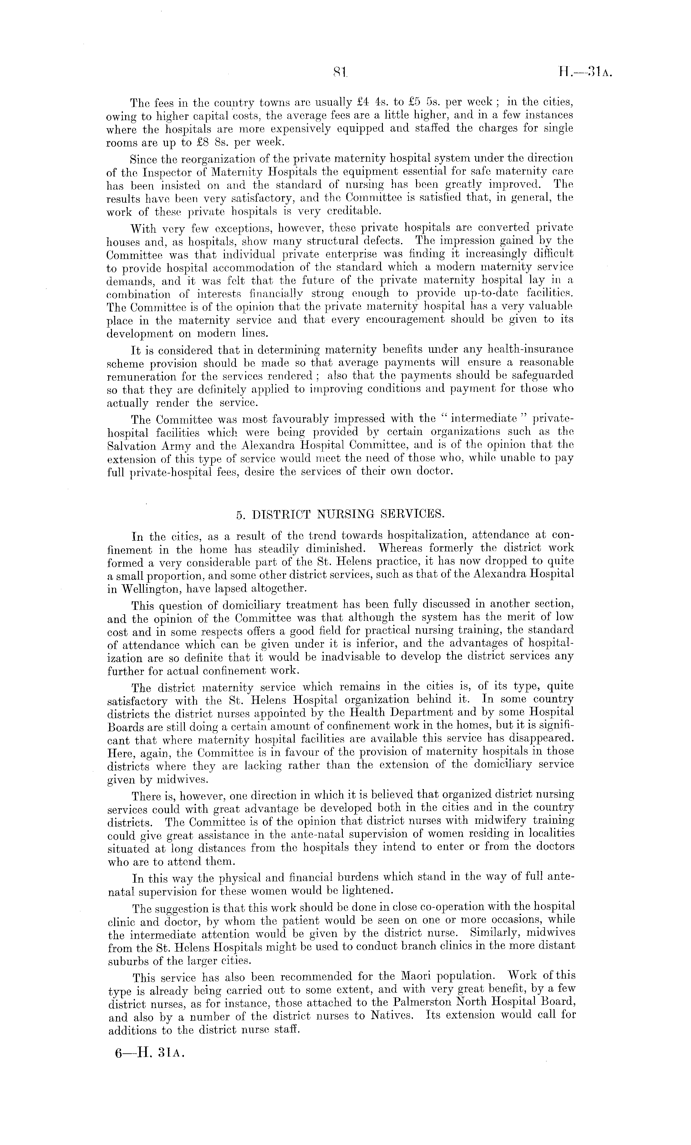 The fees in the country towns are usually £4 4s. to £5 ss. per week ; in the cities, owing to higher capital costs, the average fees are a little higher, and in a few instances where the hospitals are more expensively equipped and staffed the charges for single rooms are up to £8 Bs. per week. Since the reorganization of the private maternity hospital system under the direction of the Inspector of Maternity Hospitals the equipment essential for safe maternity care has been insisted on and the standard of nursing has been greatly improved. The results have been very satisfactory, and the Committee is satisfied that, in general, the work of these private hospitals is very creditable. With very few exceptions, however, these private hospitals are converted private houses and, as hospitals, show many structural defects. The impression gained by the Committee was that individual private enterprise was finding it increasingly difficult to provide hospital accommodation of the standard which a modern maternity service demands, and it was felt that the future of the private maternity hospital lay in a combination of interests financially strong enough to provide up-to-date facilities. The Committee is of the opinion that the private maternity hospital has a very valuable place in the maternity service and that every encouragement should be given to its development on modern lines. It is considered that in determining maternity benefits under any health-insurance scheme provision should be made so that average payments will ensure a reasonable remuneration for the services rendered ; also that the payments should be safeguarded so that they are definitely applied to improving conditions and payment for those who actually render the service. The Committee was most favourably impressed with the " intermediate " privatehospital facilities which were being provided by certain organizations such as the Salvation Army and the Alexandra Hospital Committee, and is of the opinion that the extension of this type of service would meet the need of those who, while unable to pay full private-hospital fees, desire the services of their own doctor. 5. DISTRICT NURSING SERVICES. In the cities, as a result of the trend towards hospitalization, attendance at confinement in the home has steadily diminished. Whereas formerly the district work formed a very considerable part of the St. Helens practice, it has now dropped to quite a small proportion, and some other district services, such as that of the Alexandra Hospital in Wellington, have lapsed altogether. This question of domiciliary treatment has been fully discussed in another section, and the opinion of the Committee was that although the system has the merit of low cost and in some respects offers a good field for practical nursing training, the standard of attendance which can be given under it is inferior, and the advantages of hospitalization are so definite that it would be inadvisable to develop the district services any further for actual confinement work. The district maternity service which remains in the cities is, of its type, quite satisfactory with the St. Helens Hospital organization behind it. In some country districts the district nurses appointed by the Health Department and by some Hospital Boards are still doing a certain amount of confinement work in the homes, but it is significant that where maternity hospital facilities are available this service has disappeared. Here, again, the Committee is in favour of the provision of maternity hospitals in those districts where they are lacking rather than the extension of the domiciliary service given by midwives. There is, however, one direction in which it is believed that organized district nursing services could with great advantage be developed both in the cities and in the country districts. The Committee is of the opinion that district nurses with midwifery training could give great assistance in the ante-natal supervision of women residing in localities situated at long distances from the hospitals they intend to enter or from the doctors who are to attend them. In this way the physical and financial burdens which stand in the way of full antenatal supervision for these women would be lightened. The suggestion is that this work should be done in close co-operation with the hospital clinic and doctor, by whom the patient would be seen on one or more occasions, while the intermediate attention would be given by the district nurse. Similarly, midwives from the St. Helens Hospitals might be used to conduct branch clinics in the more distant suburbs of the larger cities. This service has also been recommended for the Maori population. Work of this type is already being carried out to some extent, and with very great benefit, by a few district nurses, as for instance, those attached to the Palmerston North Hospital Board, and also by a number of the district nurses to Natives. Its extension would call for additions to the district nurse staff.