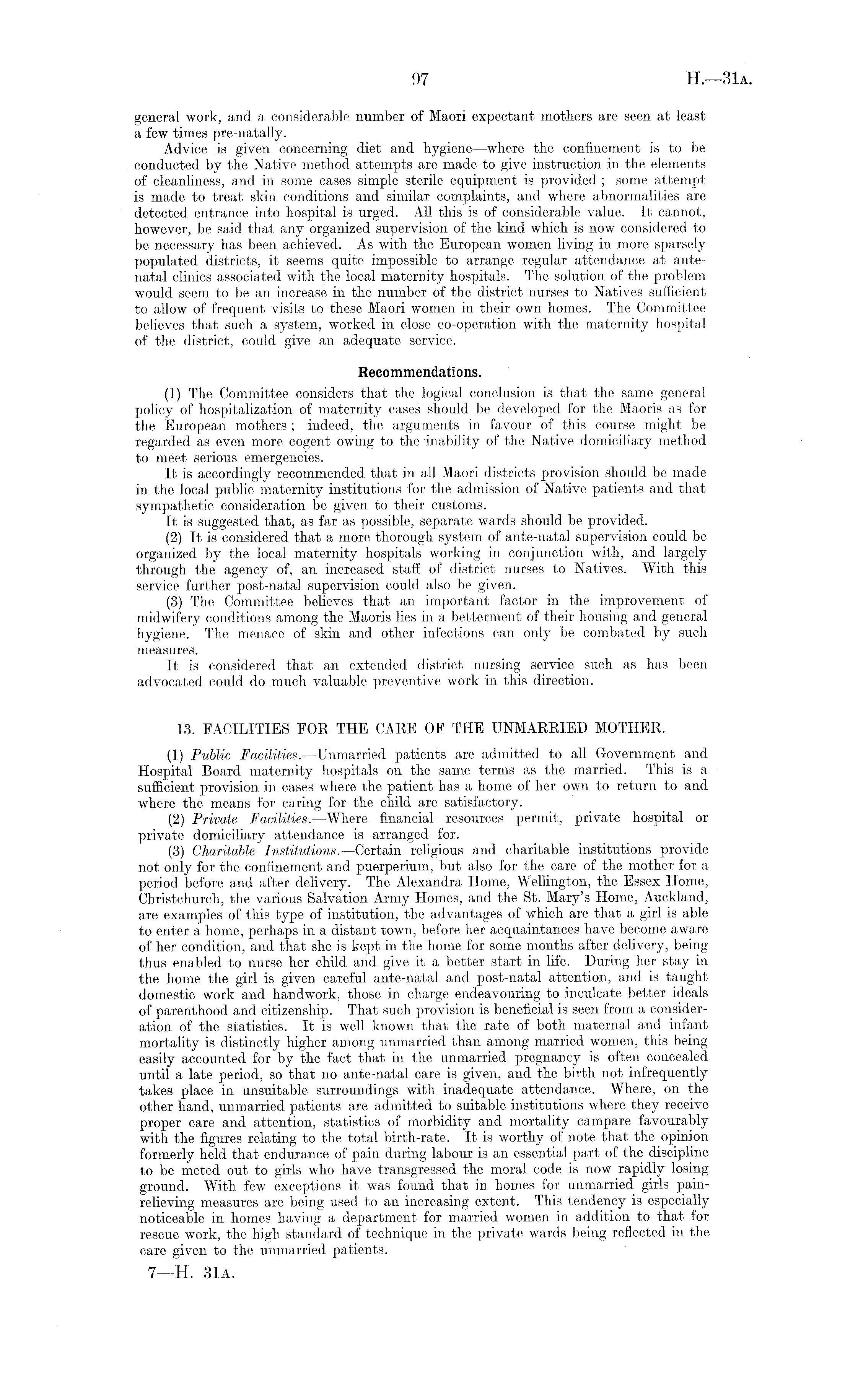 general work, and a considerable number of Maori expectant mothers are seen at least a few times pre-natally. Advice is given concerning diet and hygiene —where the confinement is to be conducted by the Native method attempts are made to give instruction in the elements of cleanliness, and in some cases simple sterile equipment is provided ; some attempt is made to treat skin conditions and similar complaints, and where abnormalities are detected entrance into hospital is urged. All this is of considerable value. It cannot, however, be said that any organized supervision of the kind which is now considered to be necessary has been achieved. As with the European women living in more sparsely populated districts, it seems quite impossible to arrange regular attendance at antenatal clinics associated with the local maternity hospitals. The solution of the problem would seem to be an increase in the number of the district nurses to Natives sufficient to allow of frequent visits to these Maori women in their own homes. The Committee believes that such a system, worked in close co-operation with the maternity hospital of the district, could give an adequate service. Recommendations. (1) The Committee considers that the logical conclusion is that the same general policy of hospitalization of maternity cases should be developed for the Maoris as for the European mothers ; indeed, the arguments in favour of this course might be regarded as even more cogent owing to the inability of the Native domiciliary method to meet serious emergencies. It is accordingly recommended that in all Maori districts provision should be made in the local public maternity institutions for the admission of Native patients and that sympathetic consideration be given to their customs. It is suggested that, as far as possible, separate wards should be provided. (2) It is considered that a more thorough system of ante-natal supervision could be organized by the local maternity hospitals working in conjunction with, and largely through the agency of, an increased staff of district nurses to Natives. With this service further post-natal supervision could also be given. (3) The Committee believes that an important factor in the improvement of midwifery conditions among the Maoris lies in a betterment of their housing and general hygiene. The menace of skin and other infections can only be combated by such measures. It is considered that an extended district nursing service such as has been advocated could do much valuable preventive work in this direction. 13. FACILITIES FOR THE CARE OF THE UNMARRIED MOTHER. (1) Public Facilities.—Unmarried patients are admitted to all Government and Hospital Board maternity hospitals on the same terms as the married. This is a sufficient provision in cases where the patient has a home of her own to return to and where the means for caring for the child are satisfactory. (2) Private Facilities. —Where financial resources permit, private hospital or private domiciliary attendance is arranged for. (3) Charitable Institutions. —Certain religious and charitable institutions provide not only for the confinement and puerperium, but also for the care of the mother for a period before and after delivery. The Alexandra Home, Wellington, the Essex Home, Christchurch, the various Salvation Army Homes, and the St. Mary's Home, Auckland, are examples of this type of institution, the advantages of which are that a girl is able to enter a home, perhaps in a distant town, before her acquaintances have become aware of her condition, and that she is kept in the home for some months after delivery, being thus enabled to nurse her child and give it a better start in life. During her stay in the home the girl is given careful ante-natal and post-natal attention, and is taught domestic work and handwork, those in charge endeavouring to inculcate better ideals of parenthood and citizenship. That such provision is beneficial is seen from a consideration of the statistics. It is well known that the rate of both maternal and infant mortality is distinctly higher among unmarried than among married women, this being easily accounted for by the fact that in the unmarried pregnancy is often concealed until a late period, so that no ante-natal care is given, and the birth not infrequently takes place in unsuitable surroundings with inadequate attendance. Where, on the other hand, unmarried patients are admitted to suitable institutions where they receive proper care and attention, statistics of morbidity and mortality campare favourably with the figures relating to the total birth-rate. It is worthy of note that the opinion formerly held that endurance of pain during labour is an essential part of the discipline to be meted out to girls who have transgressed the moral code is now rapidly losing ground. With few exceptions it was found that in homes for unmarried girls painrelieving measures are being used to an increasing extent. This tendency is especially noticeable in homes having a department for married women in addition to that for rescue work, the high standard of technique in the private wards being reflected in the care given to the unmarried patients.