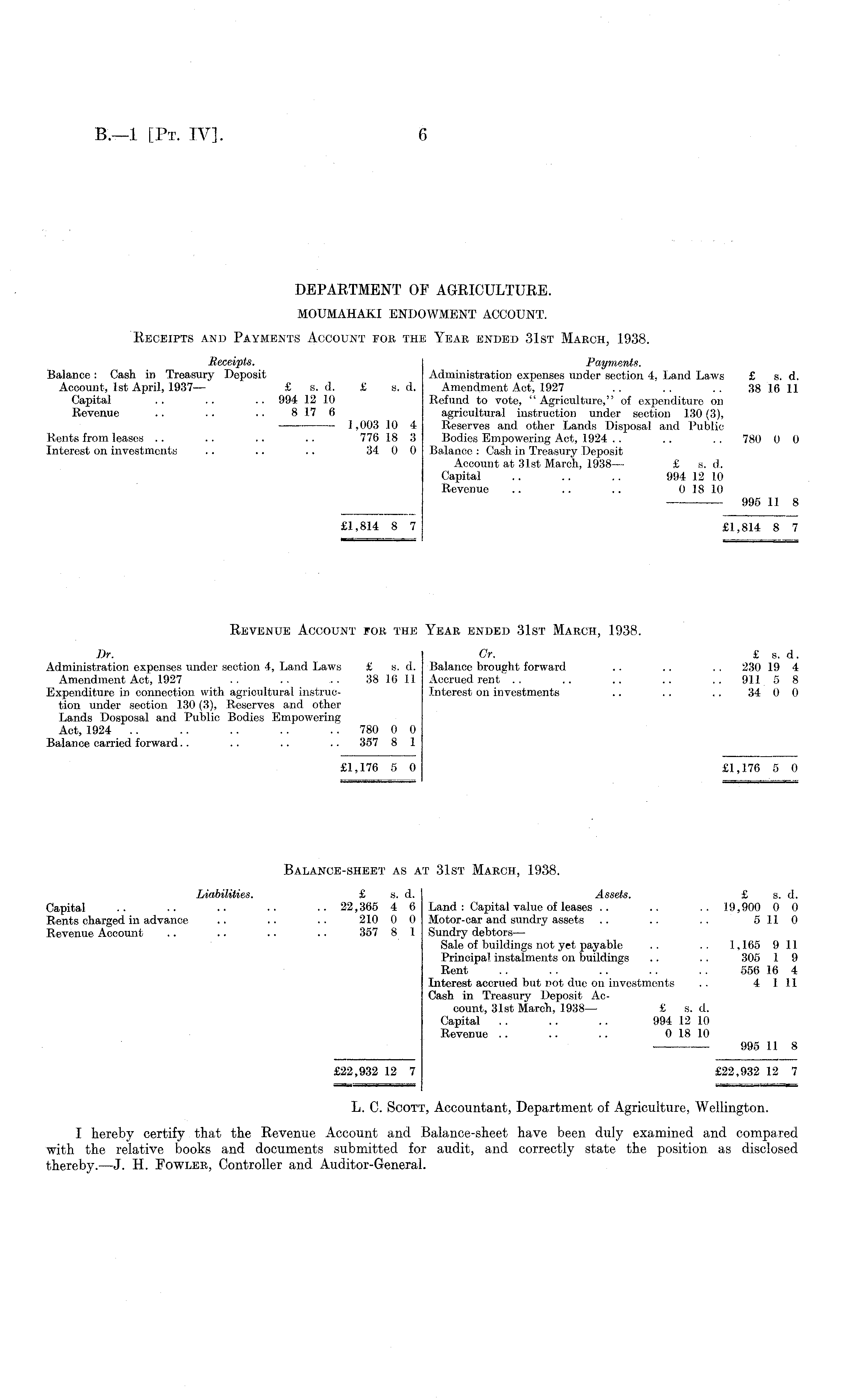 DEPARTMENT OF AGRICULTURE. MOUMAHAKI ENDOWMENT ACCOUNT. Receipts and Payments Account for the Year ended 31st March, 1938. Receipts. Payments. Balance: Cash in Treasury Deposit Administration expenses under section 4, Land Laws £ s. d. Account, Ist April, 1937 — £ s. d. £ s. d. Amendment Act, 1927 .. .. .. 38 16 11 Capital .. .. .. 994 12 10 Refund to vote, "Agriculture," of expenditure on Revenue .. .. .. 8 17 6 agricultural instruction under section 130 (3), 1,003 10 4 Reserves and other Lands Disposal and Public Rents from leases .. .. .. .. 776 18 3 Bodies Empowering Act, 1924 . . .. . . 780 0 0 Interest on investments .. .. .. 34 0 0 Balance : Cash in Treasury Deposit Account at 31st March, 1938— £ s. d. Capital .. .. .. 994 12 10 Revenue .. .. .. 0 18 10 995 11 8 £1,814 8 7 £1,814 8 7 Revenue Account for the Year ended 31st March, 1938. Dr. Cr. £ s. d. Administration expenses under section 4, Land Laws £ s. d. Balance brought forward .. .. .. 230 19 4 Amendment Act, 1927 .. .. .. 38 16 11 Accrued rent .. .. .. .. .. 911 5 8 Expenditure in connection with agricultural instruc- Interest on investments .. .. .. 34 0 0 tion under section 130 (3), Reserves and other Lands Dosposal and Public Bodies Empowering Act, 1924 .. .. .. .. .. 780 0 0 Balance carried forward.. .. .. .. 337 8 1 £1,176 5 0 £1,176 5 0 Balance-sheet as at 31st March, 1938. Liabilities. £ s. d. ,4ssefe. £ s. d. Capital .. .. .. .. .. 22,365 4 6 Land: Capital value of leases .. .. .. 19,900 0 0 Rents charged in advance .. .. .. 210 0 0 Motor-car and sundry assets .. .. .. 511 0 Revenue Account .. .. .. .. 357 8 1 Sundry debtors—• Sale of buildings not yet payable .. .. 1,165 911 Principal instalments on buildings .. .. 305 1 9 Rent .. .. .. .. .. 556 16 4 Interest accrued but not due on investments .. 4 1 11 Cash in Treasury Deposit Account, 31st March, 1938— £ s. d. Capital . . .. .. 994 12 10 Revenue .. .. .. 0 18 10 995 11 8 £22,932 12 7 £22,932 12 7 L. C. Scott, Accountant, Department of Agriculture, Wellington. I hereby certify that the Revenue Account and Balance-sheet have been duly examined and compared with the relative books and documents submitted for audit, and correctly state the position as disclosed thereby. —J. H. Fowler, Controller and Auditor-General.