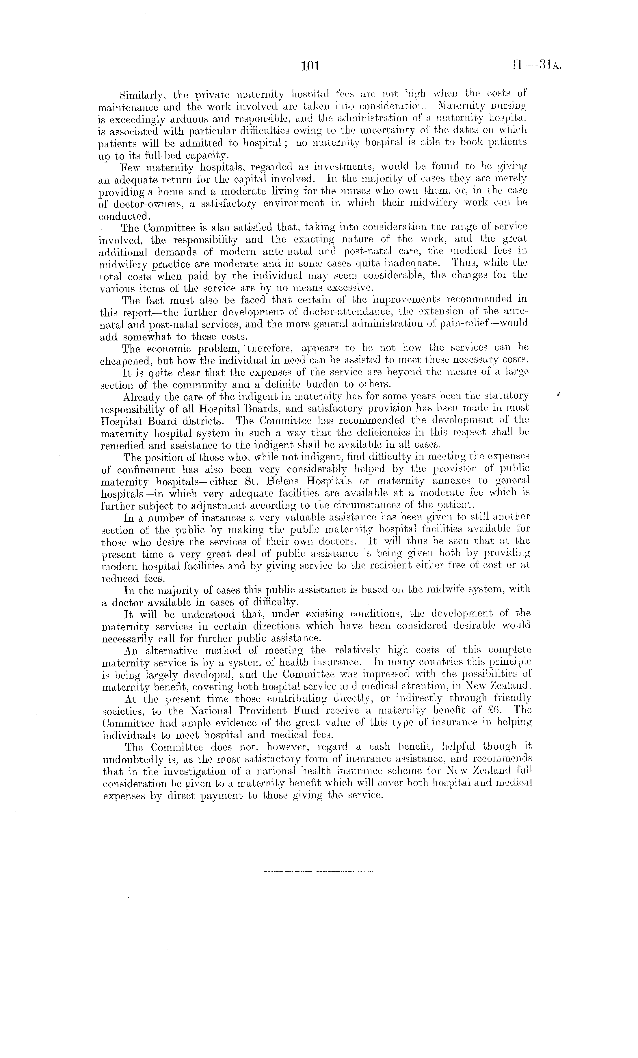 Similarly, the private maternity hospital fees are not high when the costs of maintenance and the work involved are taken into consideration. Maternity nursing is exceedingly arduous and responsible, and the administration of a maternity hospital is associated with particular difficulties owing to the uncertainty of the dates on which patients will be admitted to hospital; no maternity hospital is able to book patients up to its full-bed capacity. Pew maternity hospitals, regarded as investments, would be found to be giving an adequate return for the capital involved. In the majority of cases they are merely providing a home and a moderate living for the nurses who own them, or, in the case of doctor-owners, a satisfactory environment in which their midwifery work can be conducted. The Committee is also satisfied that, taking into consideration the range of service involved, the responsibility and the exacting nature of the work, and the great additional demands of modern ante-natal and post-natal care, the medical fees in midwifery practice are moderate and in some cases quite inadequate. Thus, while the total costs when paid by the individual may seem considerable, the charges for the various items of the service are by no means excessive. The fact must also be faced that certain of the improvements recommended in this report —the further development of doctor-attendance, the extension of the antenatal and post-natal services, and the more general administration of pain-relief —would add somewhat to these costs. The economic problem, therefore, appears to be not how the services can be cheapened, but how the individual in need can be assisted to meet these necessary costs. It is quite clear that the expenses of the service are beyond the means of a large section of the community and a definite burden to others. Already the care of the indigent in maternity has for some years been the statutory responsibility of all Hospital Boards, and satisfactory provision has been made in most Hospital Board districts. The Committee has recommended the development of the maternity hospital system in such a way that the deficiencies in this respect shall be remedied and assistance to the indigent shall be available in all cases. The position of those who, while not indigent, find difficulty in meeting the expenses of confinement has also been very considerably helped by the provision of public maternity hospitals —either St. Helens Hospitals or maternity annexes to general hospitals —in which very adequate facilities are available at a moderate fee which is further subject to adjustment according to the circumstances of the patient. In a number of instances a very valuable assistance has been given to still another section of the public by making the public maternity hospital facilities available for those who desire the services of their own doctors. It will thus be seen that at the present time a very great deal of public assistance is being given both by providing modern hospital facilities and by giving service to the recipient either free of cost or at reduced fees. In the majority of cases this public assistance is based on the midwife system, with a doctor available in cases of difficulty. It will be understood that, under existing conditions, the development of the maternity services in certain directions which have been considered desirable would necessarily call for further public assistance. An alternative method of meeting the relatively high costs of this complete maternity service is by a system of health insurance. In many countries this principle is being largely developed, and the Committee was impressed with the possibilities of maternity benefit, covering both hospital service and medical attention, in New Zealand. At the present time those contributing directly, or indirectly through friendly societies, to the National Provident Pund receive a maternity benefit of £6. The Committee had ample evidence of the great value of this type of insurance in helping individuals to meet hospital and medical fees. The Committee does not, however, regard a cash benefit, helpful though it undoubtedly is, as the most satisfactory form of insurance assistance, and recommends that in the investigation of a national health insurance scheme for New Zealand full consideration be given to a maternity benefit which will cover both hospital and medical expenses by direct payment to those giving the service.