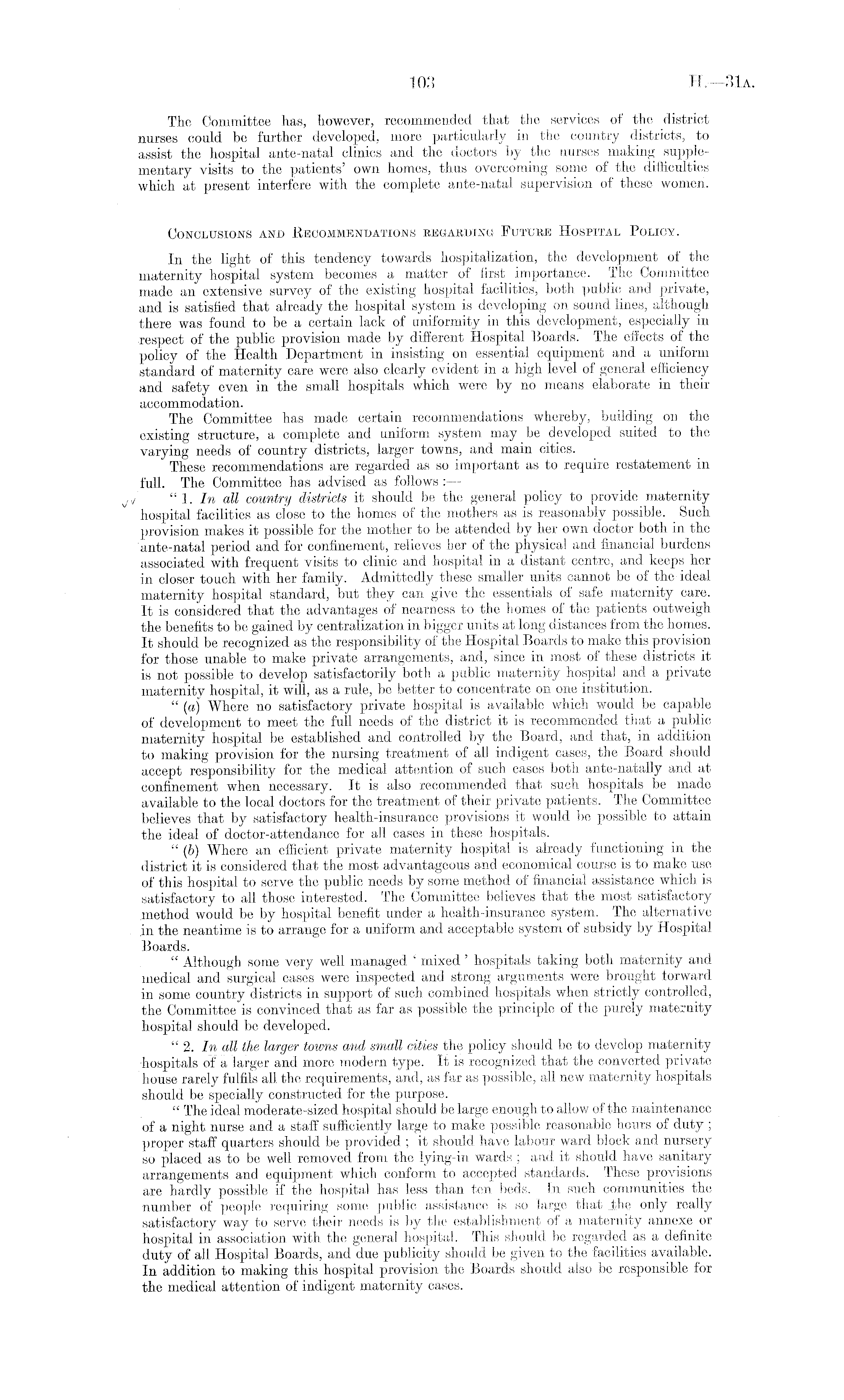 The Committee has, however, recommended that the services of the district nurses could be further developed, more particularly in the country districts, to assist the hospital ante-natal clinics and the doctors by the nurses making, supplementary visits to the patients' own homes, thus overcoming some of the difficulties which at present interfere with the complete ante-natal supervision of these women. Conclusions and Recommendations regarding Future Hospital Policy. In the light of this tendency towards hospitalization, the development of the maternity hospital system becomes a master of first importance. The Committee made an extensive survey of the existing hospital facilities, both public and private, and is satisfied that already the hospital system is developing on sound lines, although there was found to be a certain lack of uniformity in this development, especially in respect of the public provision made by different Hospital Boards. The effects of the policy of the Health Department in insisting on essential equipment and a uniform standard of maternity care were also clearly evident in a high level of general efficiency and safety even in the small hospitals which were by no means elaborate in their accommodation. The Committee has made certain recommendations whereby, building on the existing structure, a complete and uniform system may be developed suited to the varying needs of country districts, larger towns, and main cities. These recommendations are regarded as so important as to require restatement in full. The Committee has advised as follows :— // "1. In all country districts it should be the general policy to provide maternity hospital facilities as close to the homes of the mothers as is reasonably possible. Such provision makes it possible for the mother to be attended by her own doctor both in the ante-natal period and for confinement, relieves her of the physical and financial burdens associated with frequent visits to clinic and hospital in a distant centre, and keeps her in closer touch with her family. Admittedly these smaller units cannot be of the ideal maternity hospital standard, but they can give the essentials of safe maternity care. It is considered that the advantages of nearness to the homes of the patients outweigh the benefits to be gained by centralization in bigger units at long distances from the homes. It should be recognized as the responsibility of the Hospital Boards to make this provision for those unable to make private arrangements, and, since in most of these districts it is not possible to develop satisfactorily both a public maternity hospital and a private maternity hospital, it will, as a rule, be better to concentrate on one institution. " (a) Where no satisfactory private hospital is available which would be capable of development to meet the full needs of the district it is recommended, that a public maternity hospital be established and controlled by the Board, and that, in addition to making provision for the nursing treatment of all indigent cases, the Board should accept responsibility for the medical attention of such cases both ante-natally and at confinement when necessary. It is also recommended that such hospitals be made available to the local doctors for the treatment of their private patients. The Committee believes that by satisfactory health-insurance provisions it would be possible to attain the ideal of doctor-attendance for all cases in these hospitals. " (b) Where an efficient private maternity hospital is already functioning in the district it is considered that the most advantageous a,nd economical course is to make use of this hospital to serve the public needs by some method of financial assistance which is satisfactory to all those interested. The Committee believes that the most satisfactory method would be by hospital benefit under a health-insurance system. The alternative ,in the neantime is to arrange for a uniform and acceptable system of subsidy by Hospital Boards. " Although some very well managed ' mixed' hospitals taking both maternity and medical and surgical cases were inspected and strong arguments were brought forward in some country districts in support of such combined hospitals when strictly controlled, the Committee is convinced that as far as possible the principle of the purely maternity hospital should be developed. " 2. In all the larger towns and small cities the policy should be to develop maternity hospitals of a larger and more modern type. It is recognized that the converted private house rarely fulfils all the requirements, and, as far as possible, all new maternity hospitals should be specially constructed for the purpose. " The ideal moderate-sized hospital should be large enough to allow of the maintenance of a night, nurse and a staff sufficiently large to make possible reasonable hours of duty ; proper staff quarters should be provided ; it should have labour ward block and nursery so placed as to be well removed from the lying-in wards ; and it should have sanitary arrangements and equipment which conform to accepted standards. These provisions are hardly possible if the hospital has less than ten beds. In such communities the number of people requiring some public assistance is so large that the onlyL xefllly. satisfactory way to serve their needs is by the establishment of a maternity annexe or hospital in association with the general hospital. This should be regarded as a definite duty of all Hospital. Boards, and due publicity should be given to the facilities available. In addition to making this hospital provision the Boards should also be responsible for the medical attention of indigent maternity cases.