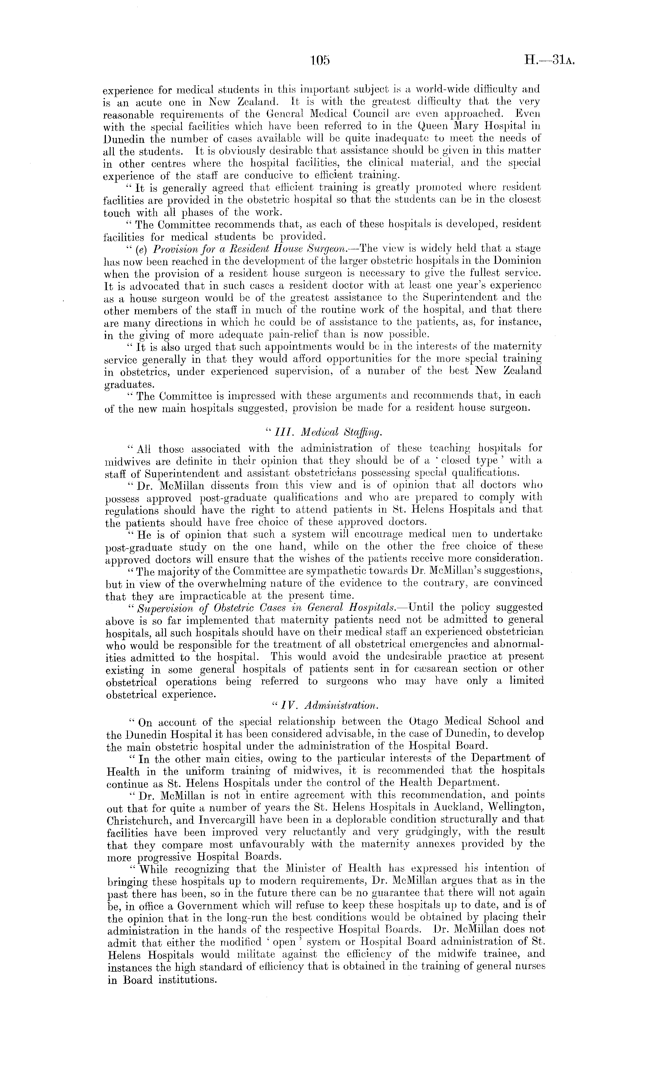 experience for medical students in this important subject is a world-wide difficulty and is an acute one in New Zealand. It is with the greatest difficulty that the very reasonable requirements of the General Medical Council are even approached. Even with the special facilities which have been referred to in the Queen Mary Hospital in Dunedin the number of cases available will be quite inadequate to meet the needs of all the students. It is obviously desirable that assistance should be given in this matter in other centres where the hospital facilities, the clinical material, and the special experience of the staff are conducive to efficient training. "It is generally agreed that efficient training is greatly promoted where resident facilities are provided in the obstetric hospital so that the students can be in the closest touch with all phases of the work. " The Committee recommends that, as each of these hospitals is developed, resident facilities for medical students be provided. " (e) Provision for a Resident House Surgeon.—The view is widely held that a stage has now been reached in the development of the larger obstetric hospitals in the Dominion when the provision of a resident house surgeon is necessary to give the fullest service. It is advocated that in such cases a resident doctor with at least one year's experience as a house surgeon would be of the greatest assistance to the Superintendent and the other members of the staff in much of the routine work of the hospital, and that there are many directions in which he could be of assistance to the patients, as, for instance, in the giving of more adequate pain-relief than is now possible. "It is also urged that such appointments would be in the interests of the maternity service generally in that they would afford opportunities for the more special training in obstetrics, under experienced supervision, of a number of the best New Zealand graduates. " The Committee is impressed with these arguments and recommends that, in each of the new main hospitals suggested, provision be made for a resident house surgeon. " 111. Medical Staffing. " All those associated with the administration of these teaching hospitals for midwives are definite in their opinion that they should be of a ' closed type ' with a staff of Superintendent and assistant obstetricians possessing special qualifications. " Dr. McMillan dissents from this view and is of opinion that all doctors who possess approved post-graduate qualifications and who are prepared to comply with regulations should have the right to attend patients in St. Helens Hospitals and that the patients should have free choice of these approved doctors. " He is of opinion that such a system will encourage medical men to undertake post-graduate study on the one hand, while on the other the free choice of these approved doctors will ensure that the wishes of the patients receive more consideration. " The majority of the Committee are sympathetic towards Dr. McMillan's suggestions, but in view of the overwhelming nature of the evidence to the contrary, are convinced that they are impracticable at the present time. " Supervision of Obstetric Cases in General Hospitals.—Until the policy suggested above is so far implemented that maternity patients need not be admitted to general hospitals, all such hospitals should have on their medical staff an experienced obstetrician who would be responsible for the treatment of all obstetrical emergencies and abnormalities admitted to the hospital. This would avoid the undesirable practice at present existing in some general hospitals of patients sent in for csesarean section or other obstetrical operations being referred to surgeons who may have only a limited obstetrical experience. " IV. Administration. " On account of the special relationship between the Otago Medical School and the Dunedin Hospital it has been considered advisable, in the case of Dunedin, to develop the main obstetric hospital under the administration of the Hospital Board. " In the other main cities, owing to the particular interests of the Department of Health in the uniform training of midwives, it is recommended that the hospitals continue as St. Helens Hospitals under the control of the Health Department. " Dr. McMillan is not in entire agreement with this recommendation, and points out that for quite a number of years the St. Helens Hospitals in Auckland, Wellington, Christchurch, and Invercargill have been in a deplorable condition structurally and that facilities have been improved very reluctantly and very grudgingly, with the result that they compare most unfavourably with the maternity annexes provided by the more progressive Hospital Boards. " While recognizing that the Minister of Health has expressed his intention of bringing these hospitals up to modern requirements, Dr. McMillan argues that as in the past there has been, so in the future there can be no guarantee that there will not again be, in office a Government which will refuse to keep these hospitals up to date, and is of the opinion that in the long-run the best conditions would be obtained by placing their administration in the hands of the respective Hospital Boards. Dr. McMillan does not admit that either the modified ' open ' system or Hospital Board administration of St. Helens Hospitals would militate against the efficiency of the midwife trainee, and instances the high standard of efficiency that is obtained in the training of general nurses in Board institutions.