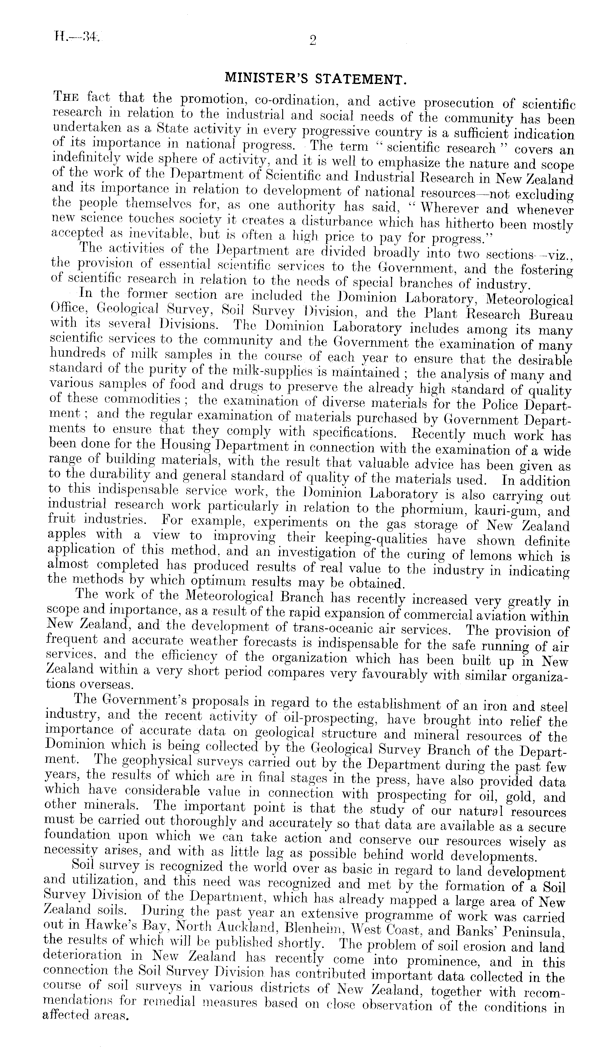 MINISTER'S STATEMENT. The fact that the promotion, co-ordination, and active prosecution of scientific lesearch m relation to the industrial and social needs of the community has been undertaken as a State activity in every progressive country is a sufficient indication of its importance m national progress. The term " scientific research " covers an indefinitely wide sphere of activity, and it is well to emphasize the nature and scope ot the work of the Department of Scientific and Industrial Research in New Zealand and its importance in relation to development of national resources—not excluding the people themselves for, as one authority has said, " Wherever and whenever new science touches society it creates a disturbance which has hitherto been mostlv accepted as inevitable, but is often a high price to pay for progress." The activities of the Department are divided broadly into two sections--viz. the provision of essential scientific services to the Government, and the fostering ot scientific research m relation to the needs of special branches of industry. rkffi / l6 1 form fr section are included the Dominion Laboratory, Meteorological Office, Geological Survey, Soil Survey Division, and the Plant Research Bureau with its several Divisions. The Dominion Laboratory includes among its manv scientific services to the community and the Government the examination of manv hundreds of milk samples m the course of each year to ensure that the desirable standard of the purity of the milk-supplies is maintained ; the analysis of many and various samples of food and drugs to preserve the already high standard of quality of these commodities ; the examination of diverse materials for the Police Department ; and the regular examination of materials purchased by Government Departments to ensure that they comply with specifications. Recently much work has been done for the Housing Department in connection with the examination of a wide range of building materials, with the result that valuable advice has been given as to the durability and general standard of quality of the materials used. In addition o is indispensable service work, the Dominion Laboratory is also carrying out industrial research work particularly in relation to the phormium, kauri-gum, and it industries. For example, experiments on the gas storage of New Zealand app es with a view to improving their keeping-qualities have shown definite application of this method, and an investigation of the curing of lemons which is almost completed has produced results of real value to the industry in indicating the methods by which optimum results may be obtained. Ihe work of the Meteorological Branch has recently increased very greatly in scope and importance, as a result of the rapid expansion of commercial aviation within ; ew Zealand, and the development of trans-oceanic air services. The provision of trequent and accurate weather forecasts is indispensable for the safe running of air services, and the efficiency of the organization which has been built up in New Zealand within a very short period compares very favourably with similar organizations overseas. 8 The Government's proposals in regard to the establishment of an iron and steel industry, and the recent activity of oil-prospecting, have brought into relief the importance of accurate data on geological structure and mineral resources of the Dominion which is being collected by the Geological Survey Branch of the Department. The geophysical surveys carried out by the Department during the past few years, the results of which are in final stages in the press, have also provided data which have considerable value in connection with prospecting for oil gold and other minerals The important point is that the study of our natural resources must be carried out thoroughly and accurately so that data are available as a secure oundation upon which we can take action and conserve our resources wisely as necessity arises, and with as little lag as possible behind world developments boil survey is recognized the world over as basic in regard to land development and utilization, and this need was recognized and met by the formation of a Soil Survey Division of the Department, which has already mapped a large area of New Zealand soils. During the past year an extensive programme of work was carried out m Hawke s Bay, North Auckland, Blenheim, West Coast, and Banks' Peninsula the results of which will be published shortly. The problem of soil erosion and land deterioration m New Zealand has recently come into prominence, and in this connection the Soil Survey Division has contributed important data collected in the course of soil surveys m various districts of New Zealand, together with recommendations for remedial measures based on close observation of the conditions in affected areas.