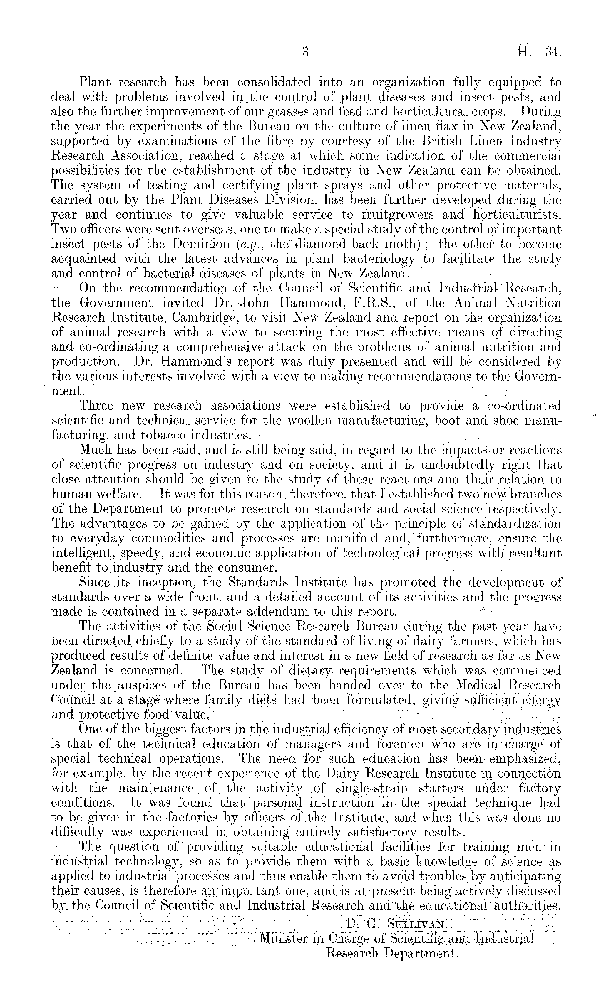 Plant research has been consolidated into an organization fully equipped to deal with problems involved in .the control of plant diseases and insect pests, and also the further improvement of our grasses and feed and horticultural crops. During the year the experiments of the Bureau on the culture of linen flax in New Zealand, supported by examinations of the fibre by courtesy of the British Linen Industry Research Association, reached a stage at which some indication of the commercial possibilities for the establishment of the industry in New Zealand can be obtained. The system, of testing and certifying plant sprays and other protective materials, carried out by the Plant Diseases Division, has been further developed during the year and continues to give valuable service to fruitgrowers and horticulturists. Two officers were sent overseas, one to make a special study of the control of important insect pests of the Dominion (e.g., the. diamond-back moth) ; the other to become acquainted with the latest advances in plant bacteriology to facilitate the study and control of bacterial diseases of plants in New Zealand. On the recommendation of the Council of Scientific and industrial Research, the Government invited Dr. John Hammond, F.R.S., of the Animal Nutrition Research Institute, Cambridge, to visit New Zealand and report on the organization of animal. research with a view to securing the most effective means of directing and co-ordinating a comprehensive attack on the problems. of animal nutrition and production. Dr. Hammond's report was duly presented and will be considered by the various interests involved with a view to making recommendations to the Government. Three new research associations were established to provide a co-ordinated scientific and technical service for the woollen manufacturing, boot and shoe manufacturing, and tobacco industries. Much has been said, and is still being said, in regard to the impacts or reactions of scientific progress on industry and on society, and it is undoubtedly right that close attention should be given to the study of these reactions and their relation to human welfare. It was for this reason, therefore, that I established two new branches of the Department to promote research on standards and social science respectively. The advantages to be gained by the application of the principle of standardization to everyday commodities and processes are manifold and, furthermore, ensure the intelligent, speedy, and economic application of technological progress with .resultant benefit to industry and the consumer. Since .its., inception, the Standards Institute has promoted the development of standards, over a wide front, and a detailed account of its activities and the progress made is contained in a separate addendum to this report. The activities of the Social Science Research Bureau during the past year have been directed chiefly to a study of the standard of living of dairy-farmers, which has produced results of definite value and interest in a new field of research as far as New Zealand is concerned. The study of dietary- requirements which was commenced under the auspices of the Bureau has been handed over to the Medical Research Council at a stage .where family diets had been formulated, giving sufficient energy and protective food"value,, : . One of the biggest factors in the industrial efficiency of most secondary industries is that of the ..technical education of managers and foremen who are in charge'of special technical operations. The need for such education has been emphasized, for example, by the recent experience of the Dairy Research Institute in connection with the maintenance ..of the . activity .of...single-strain starters under, factory conditions. It . was found that personal instruction in the special technique had to be given in the factories by officers of the Institute, and when this was done no difficulty was experienced in obtaining entirely satisfactory results. The question of providing...suitable educational facilities for training men in industrial technology, so as to provide them with a. basic knowledge of science as applied to industrial "processes and thus enable them to avoid troubles by anticipating their; causes, is therefore an important one, and is at present being actively discussed by. the Council of Scientific.and Industrial Research and the educational authorities. v ' ' D-.*G. SuiiivAN.' "' -. --XV/Y" ■ Minister in Charge, of ScieAtifig.a.ns.lpd*ustrjal - Research Department.