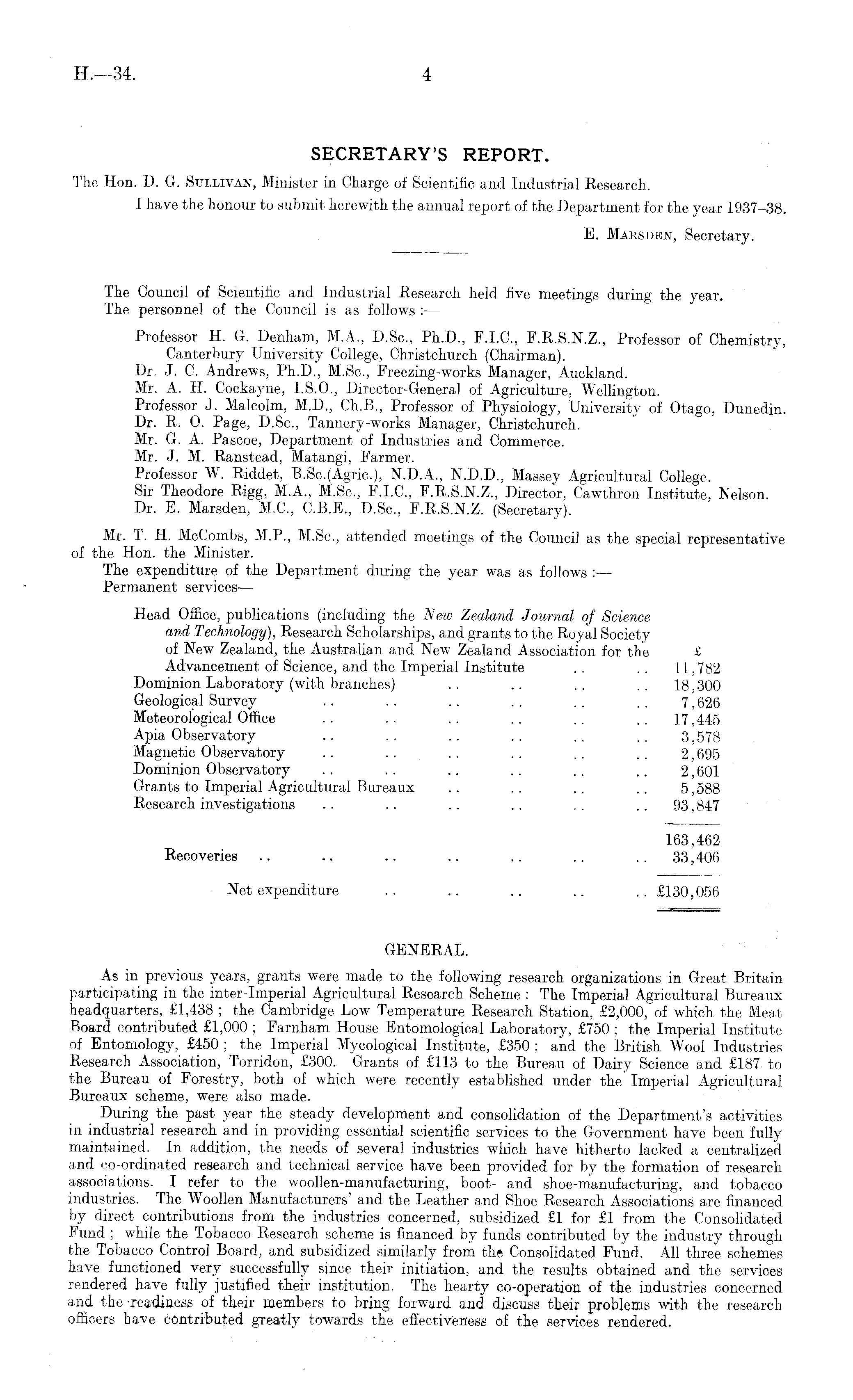 SECRETARY'S REPORT. The Hon. D. G. Sullivan, Minister in Charge of Scientific and Industrial Research. I have the honour to submit herewith the annual report of the Department for the year 1937-38. E. Marsden, Secretary.