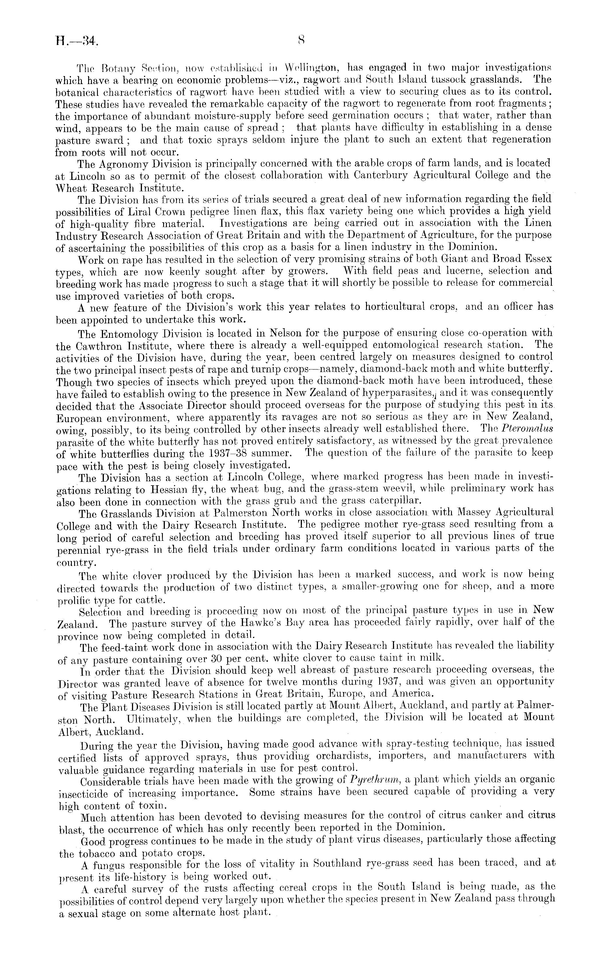 The Botany Section, now established in Wellington, has engaged in two major investigations which have a bearing on economic problems—viz., ragwort and South Island tussock grasslands. The botanical characteristics of ragwort have been studied with a view to securing clues as to its control. These studies have revealed the remarkable capacity of the ragwort to regenerate from root fragments; the importance of abundant moisture-supply before seed germination occurs ; that water, rather than wind, appears to be the main cause of spread ; that plants have difficulty in establishing in a dense pasture sward ; and that toxic sprays seldom injure the plant to such an extent that regeneration from roots will not occur. The Agronomy Division is principally concerned with the arable crops of farm lands, and is located at Lincoln so as to permit of the closest collaboration with Canterbury Agricultural College and the Wheat Research Institute. The Division has from its series of trials secured a great deal of new information regarding the field possibilities of Liral Crown pedigree linen flax, this flax variety being one which provides a high yield of high-quality fibre material. Investigations are being carried out in association with the Linen Industry Research Association of Great Britain and with the Department of Agriculture, for the purpose of ascertaining the possibilities of this crop as a basis for a linen industry in the Dominion. Work on rape has resulted in the selection of very promising strains of both Giant and Broad Essex types, which are now keenly sought after by growers. With field peas and lucerne, selection and breeding work has made progress to such a stage that it will shortly be possible to release for commercial use improved varieties of both crops. A new feature of the Division's work this year relates to horticultural crops, and an officer has been appointed to undertake this work. The Entomology Division is located in Nelson for the purpose of ensuring close co-operation with the Cawthron Institute, where there is already a well-equipped entomological research station. The activities of the Division have, during the year, been centred largely on measures designed to control the two principal insect pests of rape and turnip crops —namely, diamond-back moth and white butterfly. Though two species of insects which preyed upon the diamond-back moth have been introduced, these have failed to establish owing to the presence in New Zealand of hyperparasites,j and it was consequently decided that the Associate Director should proceed overseas for the purpose of studying this pest in its. European environment, where apparently its ravages are not so serious as they are in New Zealand, owing, possibly, to its being, controlled by other insects already well established there. The Pteromalus parasite of the white butterfly has not proved entirely satisfactory, as witnessed by the great, prevalence of white butterflies during the 1937-38 summer. The question of the failure of the parasite to keep pace with the pest is being closely investigated. The Division has a, section at Lincoln College, where marked progress has been made in investigations relating to Hessian fly, the wheat bug, and the grass-stem weevil, while preliminary work has also been done in connection with the grass, grub and the grass caterpillar. The Grasslands Division at Palmerston North works in close association, with Massey Agricultural College and with the Dairy Research Institute. The pedigree mother rye-grass seed resulting from a long period of careful selection and breeding has proved itself superior to all previous lines of true perennial rye-grass in the field trials under ordinary farm conditions located in various parts of the country. The white clover produced by the Division has been a marked success, and work is now being directed towards the production of two distinct types, a smaller-growing one for sheep, and a more prolific tvpe for cattle. Selection and breeding is proceeding now on most of the principal pasture types in use in New Zealand. The pasture survey of the Hawke's Bay area has proceeded fairly rapidly, over half of the province now being completed in detail. The feed-taint work done in association with the Dairy Research Institute has revealed the liability of any pasture containing over 30 per cent, white clover to cause taint in milk. In order that the Division should keep well abreast of pasture research proceeding overseas, the Director was granted leave of absence for twelve months during 1937, and was given an opportunity of visiting Pasture Research Stations in Great Britain, Europe, and America. The Plant Diseases Division is still located partly at Mount Albert, Auckland, and partly at Palmerston North. Ultimately, when the buildings are completed, the Division will be located at Mount Albert, Auckland. During the year the Division, having made good advance with spray-testing technique, has issued certified lists of approved sprays, thus providing orchardists, importers, and manufacturers with valuable guidance regarding materials in use for pest control. Considerable trials have been made with the growing of Pyrethrum, a plant which yields an organic insecticide of increasing importance. Some strains have been secured capable of providing a very high content of toxin. Much attention has been devoted to devising measures for the control of citrus canker and citrus blast, the occurrence of which has only recently been reported in the Dominion. Good progress continues to be made in the study of plant virus diseases, particularly those affecting the tobacco and potato crops. A fungus responsible for the loss of vitality in Southland rye-grass seed has been traced, and at present its life-history is being worked out, A careful survey of the rusts affecting cereal crops in the South Island is being made, as the possibilities of control depend very largely upon whether the speci