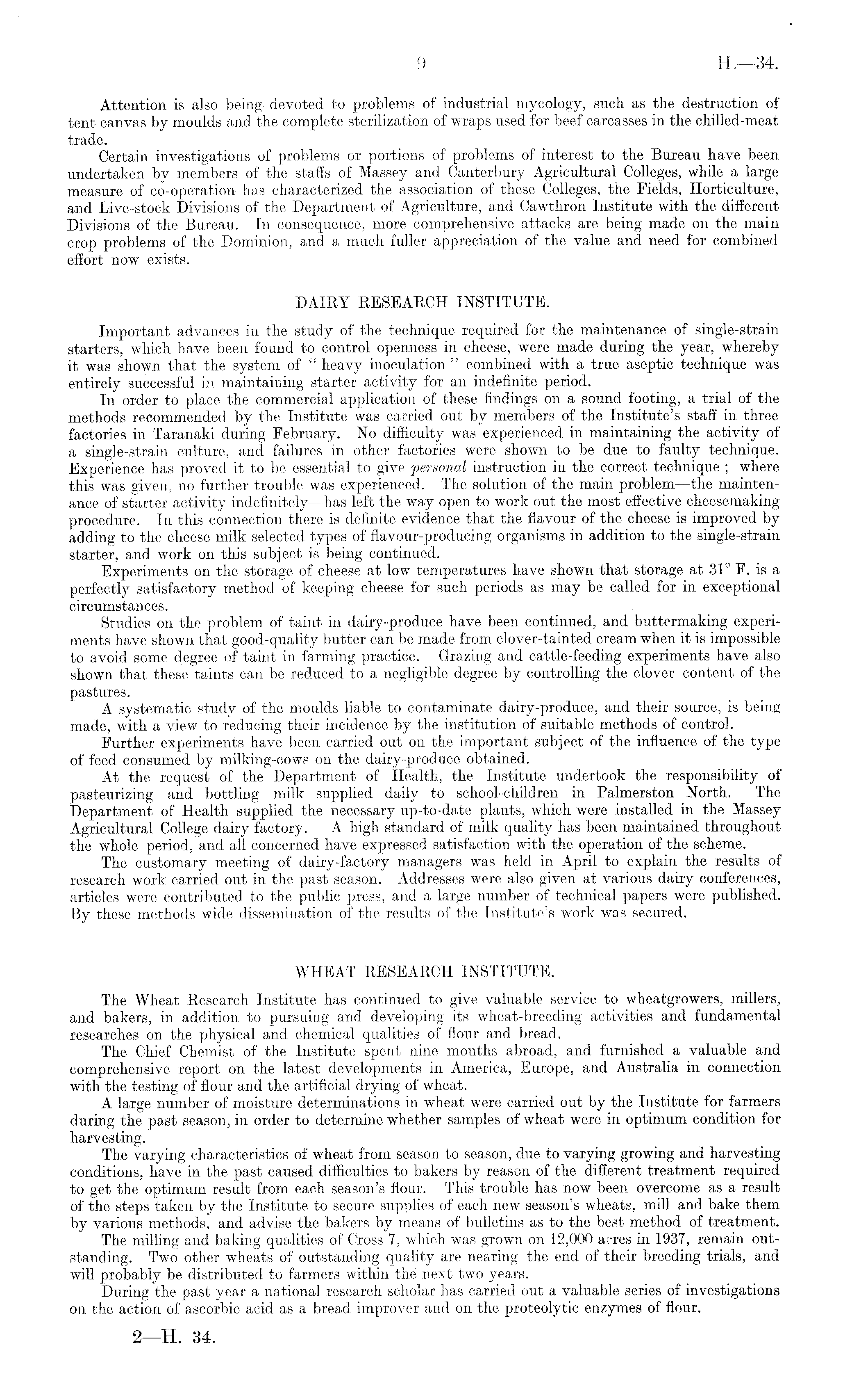 Attention is also being devoted to problems of industrial mycology, such as the destruction of tent canvas by moulds and the complete sterilization of wraps used for beef carcasses in the chilled-meat trade. Certain investigations of problems or portions of problems of interest to the Bureau have been undertaken by members of the staffs of Massey and Canterbury Agricultural Colleges, while a large measure of co-operation has characterized the association of these Colleges, the Fields, Horticulture, and Live-stock Divisions of the Department of Agriculture, and Cawthron Institute with the different Divisions of the Bureau. In consequence, more comprehensive attacks are being made on the main crop problems of the Dominion, and a much fuller appreciation of the value and need for combined effort now exists. DAIRY RESEARCH INSTITUTE. Important advances in the study of the technique required for the maintenance of single-strain starters, which have been found to control openness in cheese, were made during the year, whereby it was shown that the system of " heavy inoculation " combined with a true aseptic technique was entirely successful in maintaining starter activity for an indefinite period. In order to place the commercial application of these findings on a sound footing, a trial of the methods recommended by the Institute was carried out by members of the Institute's staff in three factories in Taranaki during February. No difficulty was experienced in maintaining the activity of a single-strain culture, and failures in other factories were shown to be due to faulty technique. Experience has proved it to be essential to give personal instruction in the correct technique ; where this was given, no further trouble was experienced. The solution of the main problem —the maintenance of starter activity indefinitely—has left the way open to work out the most effective cheesemaking procedure. In this connection there is definite evidence that the flavour of the cheese is improved by adding to the cheese milk selected types of flavour-producing organisms in addition to the single-strain starter, and work on this subject is being continued. Experiments on the storage of cheese at low temperatures have shown that storage at 31° F. is a perfectly satisfactory method of keeping cheese for such periods as may be called for in exceptional circumstances. Studies on the problem of taint in dairy-produce have been continued, and buttermaking experiments have shown that good-quality butter can be made from clover-tainted cream when it is impossible to avoid some degree of taint in farming practice. Grazing and cattle-feeding experiments have also shown that these taints can be reduced to a negligible degree by controlling the clover content of the pastures. A systematic study of the moulds liable to contaminate dairy-produce, and their source, is beinsj made, with a view to reducing their incidence by the institution of suitable methods of control. Further experiments have been carried out on the important subject of the influence of the type of feed consumed by milking-cows on the dairy-produce obtained. At the request of the Department of Health, the Institute undertook the responsibility of pasteurizing and bottling milk supplied daily to school-children in Palmerston North. The Department of Health supplied the necessary up-to-date plants, which were installed in the Massey Agricultural College dairy factory. A high standard of milk quality has been maintained throughout the whole period, and all concerned have expressed satisfaction with the operation of the scheme. The customary meeting of dairy-factory managers was held in April to explain the results of research work carried out in the past season. Addresses were also given at various dairy conferences, articles were contributed to the public press, and a large number of technical papers were published. By these methods wide dissemination of the results of the Institute's work was secured. WHEAT RESEARCH INSTITUTE. The Wheat Research Institute has continued to give valuable service to wheatgrowers, millers, and bakers, in addition to pursuing and developing its wheat-breeding activities and fundamental researches on the physical and chemical qualities of flour and bread. The Chief Chemist of the Institute spent nine months abroad, and furnished a valuable and comprehensive report on the latest developments in America, Europe, and Australia in connection with the testing of flour and the artificial drying of wheat. A large number of moisture determinations in wheat were carried out by the Institute for farmers during the past season, in order to determine whether samples of wheat were in optimum condition for harvesting. The varying characteristics of wheat from season to season, due to varying growing and harvesting conditions, have in the past caused difficulties to bakers by reason of the different treatment required to get the optimum result from each season's flour. This trouble has now been overcome as a result of the steps taken by the Institute to secure supplies of each new season's wheats, mill and bake them by various methods, and advise the bakers by means of bulletins as to the best method of treatment. The milling and baking qualities of Cross 7, which was grown on 12,000 acres in 1937, remain outstanding. Two other wheats of outstanding quality are nearing the end of their breeding trials, and will probably be distributed to farmers within the next two years. During the past year a national research scholar has carried out a valuable series of investigations on the action of ascorbic acid as a bread improver and on the proteolytic enzymes of flour.