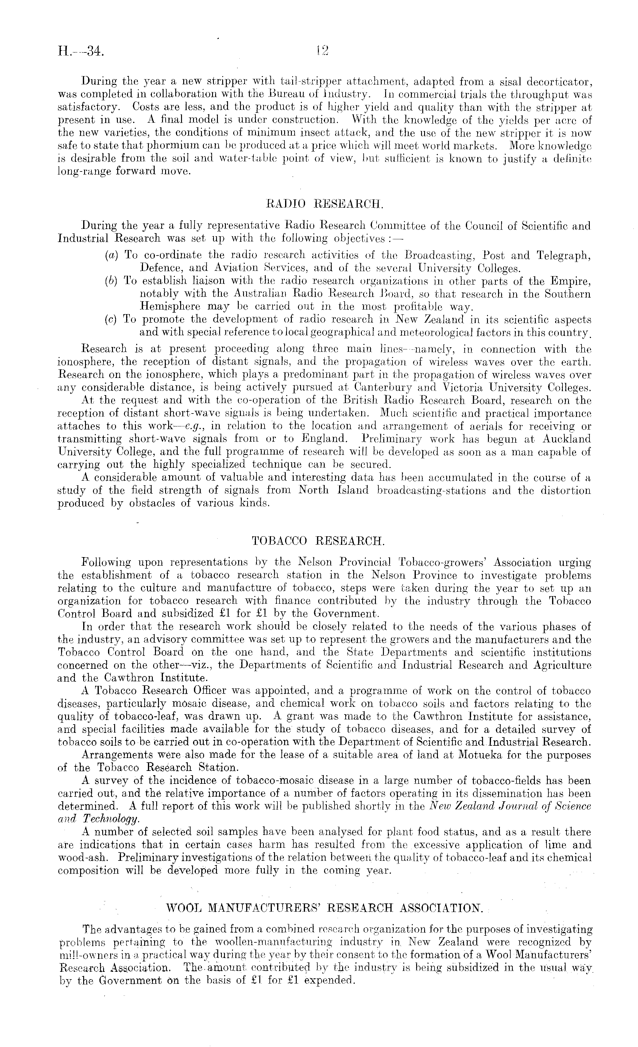 During the year a new stripper with tail-stripper attachment, adapted from a sisal decorticator, was completed in collaboration with the Bureau of Industry. In commercial trials the throughput was satisfactory. Costs are less, and the product is of higher yield and quality than with the stripper at present in use. A final model is under construction. With the knowledge of the yields per acre of the new varieties, the conditions of minimum insect attack, and the use of the new stripper it is now safe to state that phormium can be produced at a price which will meet world markets. More knowledge is desirable from the soil and water-table point of view, but sufficient is known to justify a definite long-range forward move. RADIO RESEARCH. During the year a fully representative Radio Research Committee of the Council of Scientific and Industrial Research was set up with the following objectives : — (a) To co-ordinate the radio research activities of the Broadcasting, Post and Telegraph, Defence, and Aviation Services, and of the several University Colleges. (b) To establish liaison with the radio research organizations in other parts of the Empire, notably with the Australian Radio Research Board, so that research in the Southern Hemisphere may be carried out in the most profitable way. (c) To promote the development of radio research in New Zealand in its scientific aspects and with special reference to local geographical and meteorological factors in this country. Research is at present proceeding along three main lines —namely, in connection with the ionosphere, the reception of distant signals, and the propagation of wireless waves over the earth. Research on the ionosphere, which plays a predominant part in the propagation of wireless waves over any considerable distance, is being actively pursued at Canterbury and Victoria University Colleges. At the request and with the co-operation of the British Radio Research Board, research on the reception of distant short-wave signals is being undertaken. Much scientific and practical importance attaches to this work-—e.g., in relation to the location and arrangement of aerials for receiving or transmitting short-wave signals from or to England. Preliminary work has begun at Auckland University College, and the full programme of research will be developed as soon as a man capable of carrying out the highly specialized technique can be secured. A considerable amount of valuable and interesting data has been accumulated in the course of a study of the field strength of signals from North Island broadcasting-stations and the distortion produced by obstacles of various kinds. TOBACCO RESEARCH. Following upon representations by the Nelson Provincial Tobacco-growers' Association urging the establishment of a tobacco research station in the Nelson Province to investigate problems relating to the culture and manufacture of tobacco, steps were taken during the year to set up an organization for tobacco research with finance contributed by the industry through the Tobacco Control Board and subsidized £1 for £1 by the Government. In order that the research work should be closely related to the needs of the various phases of the industry, an advisory committee was set up to represent the growers and the manufacturers and the Tobacco Control Board on the one hand, and the State Departments and scientific institutions concerned on the other—viz., the Departments of Scientific and Industrial Research and Agriculture and the Cawthron Institute. A Tobacco Research Officer was appointed, and a programme of work on the control of tobacco diseases, particularly m6saic disease, and chemical work on tobacco soils and factors relating to the quality of tobacco-leaf, was drawn up. A grant was made to the Cawthron Institute for assistance, and special facilities made available for the study of tobacco diseases, and for a detailed survey of tobacco soils to be Carried out in co-operation with the Department of Scientific and Industrial Research. Arrangements were also made for the lease of a suitable area of land at Motueka for the purposes of the Tobacco Research Station. A survey of the incidence of tobacco-mosaic disease in a large number of tobacco-fields has been carried out, and the relative importance of a number of factors operating in its dissemination has been determined. A full report of this work will be published shortly in the New Zealand Journal of Science and Technology. A number of selected soil samples have been analysed for plant food status, and as a result there are indications that in certain cases harm has resulted from the. excessive application of lime and wood-ash. Preliminary investigations of the relation between the quality of tobacco-leaf , and its chemical composition will be developed more fully in the coming year. WOOL MANUFACTURERS' RESEARCH ASSOCIATION. The advantages to be gained from a combined research organization for the purposes of investigating problems pertaining to the woollen-manufacturing industry in. New Zealand were recognized by mill-owners in a practical way during the year by their consent to the formation of a Wool Manufacturers' Research Association. The. amount, contribute*} by the industry is being subsidized in the usual way by the Government £>n the basis of £1 for £1 expended.