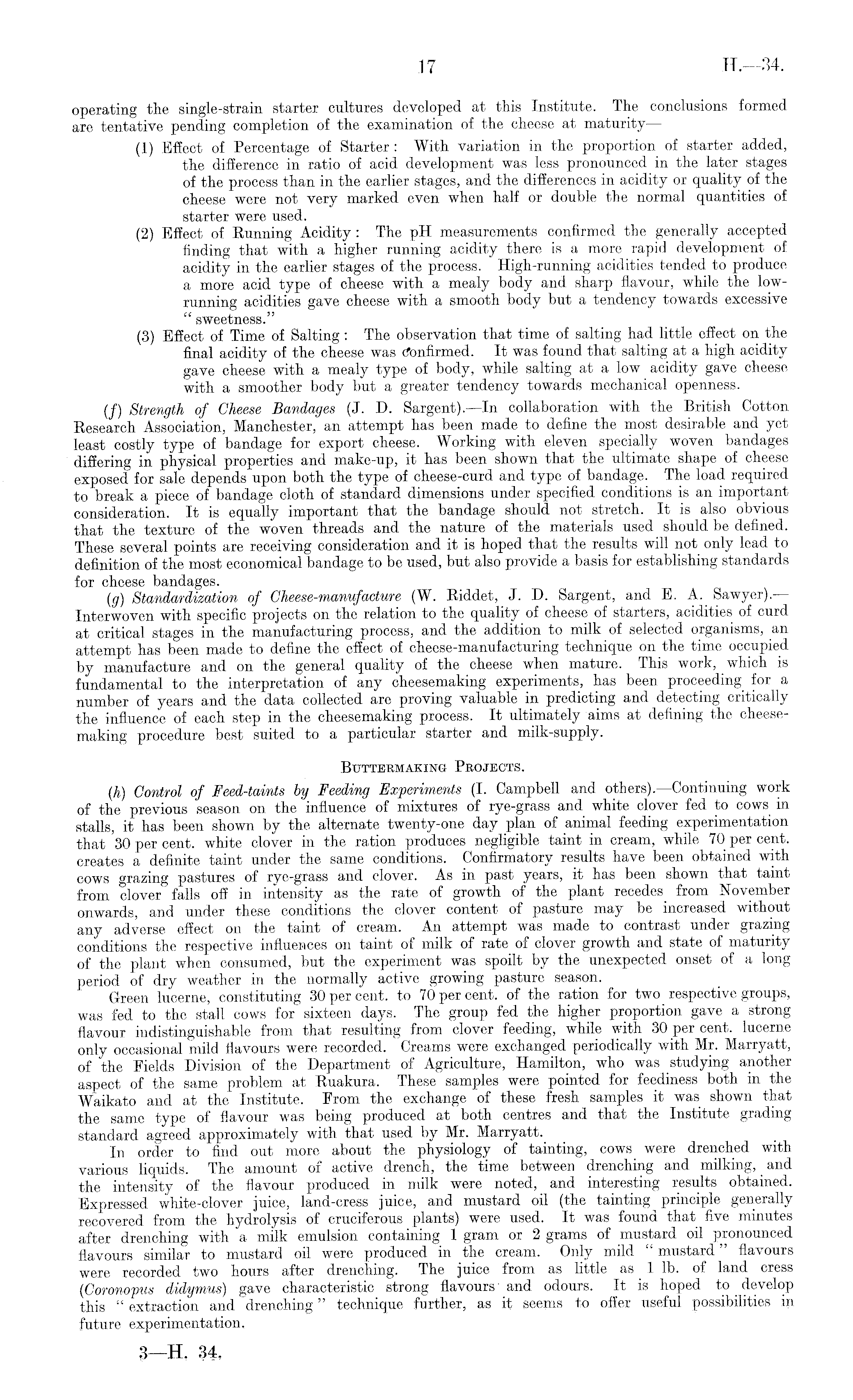 operating the single-strain starter cultures developed at this Institute. The conclusions formed are tentative pending completion of the examination of the cheese at maturity — (1) Effect of Percentage of Starter : With variation in the proportion of starter added, the difference in ratio of acid development was less pronounced in the later stages of the process than in the earlier stages, and the differences in acidity or quality of the cheese were not very marked even when half or double the normal quantities of starter were used. (2) Effect of Running Acidity: The pH measurements confirmed the generally accepted finding that with a higher running acidity there is a more rapid development of acidity in the earlier stages of the process. High-running acidities tended to produce a more acid type of cheese with a mealy body and sharp flavour, while the lowrunning acidities gave cheese with a smooth body but a tendency towards excessive " sweetness." (3) Effect of Time of Salting : The observation that time of salting had little effect on the final acidity of the cheese was Confirmed. It was found that salting at a high acidity gave cheese with a mealy type of body, while salting at a low acidity gave cheese with a smoother body but a greater tendency towards mechanical openness. (/) Strength of Cheese Bandages (J. D. Sargent). —In collaboration with the British Cotton Research Association, Manchester, an attempt has been made to define the most desirable and yet least costly type of bandage for export cheese. Working with eleven specially woven bandages differing in physical properties and make-up, it has been shown that the ultimate shape of cheese exposed for sale depends upon both the type of cheese-curd and type of bandage. The load required to break a piece of bandage cloth of standard dimensions under specified conditions is an important consideration. It is equally important that the bandage should not stretch. It is also obvious that the texture of the woven threads and the nature of the materials used should be defined. These several points are receiving consideration and it is hoped that the results will not only lead to definition of the most economical bandage to be used, but also provide a basis for establishing standards for cheese bandages. (g) Standardization of Cheese-manufacture (W. Riddet, J. D. Sargent, and E. A. Sawyer). Interwoven with specific projects on the relation to the quality of cheese of starters, acidities of curd at critical stages in the manufacturing process, and the addition to milk of selected organisms, an attempt has been made to define the effect of cheese-manufacturing technique on the time occupied by manufacture and on the general quality of the cheese when mature. This work, which is fundamental to the interpretation of any cheesemaking experiments, has been proceeding for a number of years and the data collected are proving valuable in predicting and detecting critically the influence of each step in the cheesemaking process. It ultimately aims at defining the cheesemaking procedure best suited to a particular starter and milk-supply. Buttermaking Projects. (h) Control of Feed-taints by Feeding Experiments (I. Campbell and others).— Continuing work of the previous season on the influence of mixtures of rye-grass and white clover fed to cows in stalls, it has been shown by the alternate twenty-one day plan of animal feeding experimentation that 30 per cent, white clover in the ration produces negligible taint in cream, while 70 per cent, creates a definite taint under the same conditions. Confirmatory results have been obtained with cows crazing pastures of rye-grass and clover. As in past years, it has been shown that taint from clover 'falls off in intensity as the rate of growth of the plant recedes_ from November onwards, and under these conditions the clover content of pasture may be increased without any adverse effect on the taint of cream. An attempt was made to contrast under grazing conditions the respective influences on taint of milk of rate of clover growth and state of maturity of the plant when consumed, but the experiment was spoilt by the unexpected onset of a long period of dry weather in the normally active growing pasture season. Green lucerne, constituting 30 per cent, to 70 per cent, of the ration for two respective groups, was fed to the stall cows for sixteen days. The group fed the higher proportion gave a strong flavour indistinguishable from that resulting from clover feeding, while with 30 per cent, lucerne only occasional mild flavours were recorded. Creams were exchanged periodically with Mr. Marryatt, of the Fields Division of the Department of Agriculture, Hamilton, who was studying another aspect of the same problem at Ruakura. These samples were pointed for feediness both in the Waikato and at the Institute. From the exchange of these fresh samples it was shown that the same type of flavour was being produced at both centres and that the Institute grading standard agreed approximately with that used by Mr. Marryatt. In order to find out more about the physiology of tainting, cows were drenched with various liquids. The amount of active drench, the time between drenching and milking,and the intensity of the flavour produced in milk were noted, and interesting results obtained. Expressed white-clover juice, land-cress juice, and mustard oil (the principle generally recovered from the hydrolysis of cruciferous plants) were used. It was found that five minutes after drenching with a milk emulsion containing 1 gram or 2 grams of mustard oil pronounced flavours similar to mustard oil were produced in the cream. Only mild " mustard" flavours were recorded two hours after drenching. The juice from as little as 1 lb. of land cress (Coronopus didymus) gave characteristic strong flavours' and odours. It is hoped to develop this " extraction and drenching" technique further, as it seems to offer useful possibilities i
