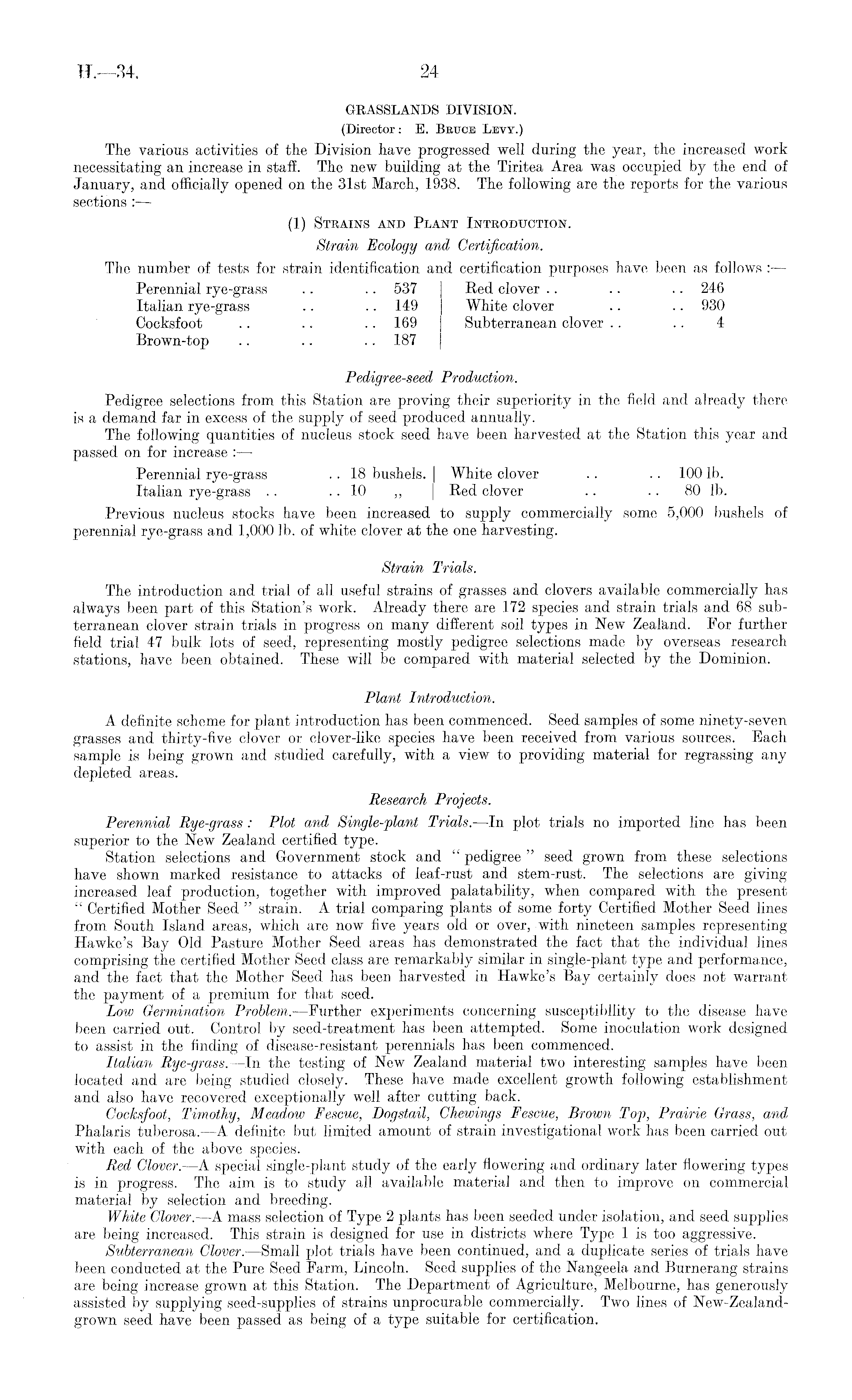 GRASSLANDS DIVISION. (Director : E. Bktjce Levy.) The various activities of the Division have progressed well during the year, the increased work necessitating an increase in staff. The new building at the Tiritea Area was occupied by the end of January, and officially opened on the 31st March, 1938. The following are the reports for the various sections :— (1) Strains and Plant Introduction. Strain Ecology and Certification. The number of tests for strain identification and certification purposes have been as follows : — Perennial rye-grass .. .. 537 Red clover .. .. .. 246 Italian rye-grass .. .. 149 White clover .. .. 930 Cocksfoot .. .. .. 169 Subterranean clover .. .. 4 Brown-top .. .. .. 187 Pedigree-seed Production. Pedigree selections from this Station are proving their superiority in the field and already there is a demand far in excess of the supply of seed produced annually. The following quantities of nucleus stock seed have been harvested at the Station this year and passed on for increase : — Perennial rye-grass .. 18 bushels, j White clover . . .. 100 lb. Italian rye-grass .. .. 10 „ | Red clover .. .. 80 lb. Previous -nucleus stocks have been increased to supply commercially some 5,000 bushels of perennial rye-grass and 1,000 lb. of white clover at the one harvesting. Strain Trials. The introduction and trial of all useful strains of grasses and clovers available commercially has always been part of this Station's work. Already there are 172 species and strain trials and 68 subterranean clover strain trials in progress on many different soil types in New Zealand. For further field trial 47 bulk lots of seed, representing mostly pedigree selections made by overseas research stations, have been obtained. These will be compared with material selected by the Dominion. Plant Introduction. A definite scheme for plant introduction has been commenced. Seed samples of some ninety-seven grasses and thirty-five clover or clover-like species have been received from various sources. Each sample is being grown and studied carefully, with a view to providing material for regrassing any depleted areas. Research Projects. Perennial Rye-grass : Plot and Single-plant Trials.—ln plot trials no imported line has been superior to the New Zealand certified type. Station selections and Government stock and " pedigree " seed grown from these selections have shown marked resistance to attacks of leaf-rust and stem-rust. The selections are giving increased leaf production, together with improved palatability, when compared with the present " Certified Mother Seed " strain. A trial comparing plants of some forty Certified Mother Seed lines from South Island areas, which are now five years old or over, with nineteen samples representing Hawke's Bay Old Pasture Mother Seed areas has demonstrated the fact that the individual lines comprising the certified Mother Seed class are remarkably similar in single-plant type and performance, and the fact that the Mother Seed has been harvested in Hawke's Bay certainly does not warrant the payment of a premium for that seed. Low Germination Problem. —Further experiments concerning susceptibility to the disease have been carried out. Control by seed-treatment lias been attempted. Some inoculation work designed to assist in the finding of disease-resistant perennials has been commenced. Italian Rye-grass. —In the testing of New Zealand material two interesting samples have been located and are being studied closely. These have made excellent growth following establishment and also have recovered exceptionally well after cutting back. Cocksfoot, Timothy, Meadow Fescue, Dogstail, Chewings Fescue, Brown Top, Prairie Grass, and Phalaris tuberosa. —A definite but limited amount of strain investigational work has been carried out with each of the above species. Red Clover.—A special single-plant study of the early flowering and ordinary later flowering types is in progress. The aim is to study all available material and then to improve on commercial material by selection and breeding. White Clover. —A mass selection of Type 2 plants has been seeded under isolation, and seed supplies are being increased. This strain is designed for use in districts where Type lis too aggressive. Subterranean Clover.—Small plot trials have been continued, and a duplicate series of trials have been conducted at the Pure Seed Farm, Lincoln. Seed supplies of the Nangeela and Burnerang strains are being increase grown at this Station. The Department of Agriculture, Melbourne, has generously assisted by supplying seed-supplies of strains unprocurable commercially. Two lines of New-Zealand-grown seed have been passed as being of a type suitable for certification.