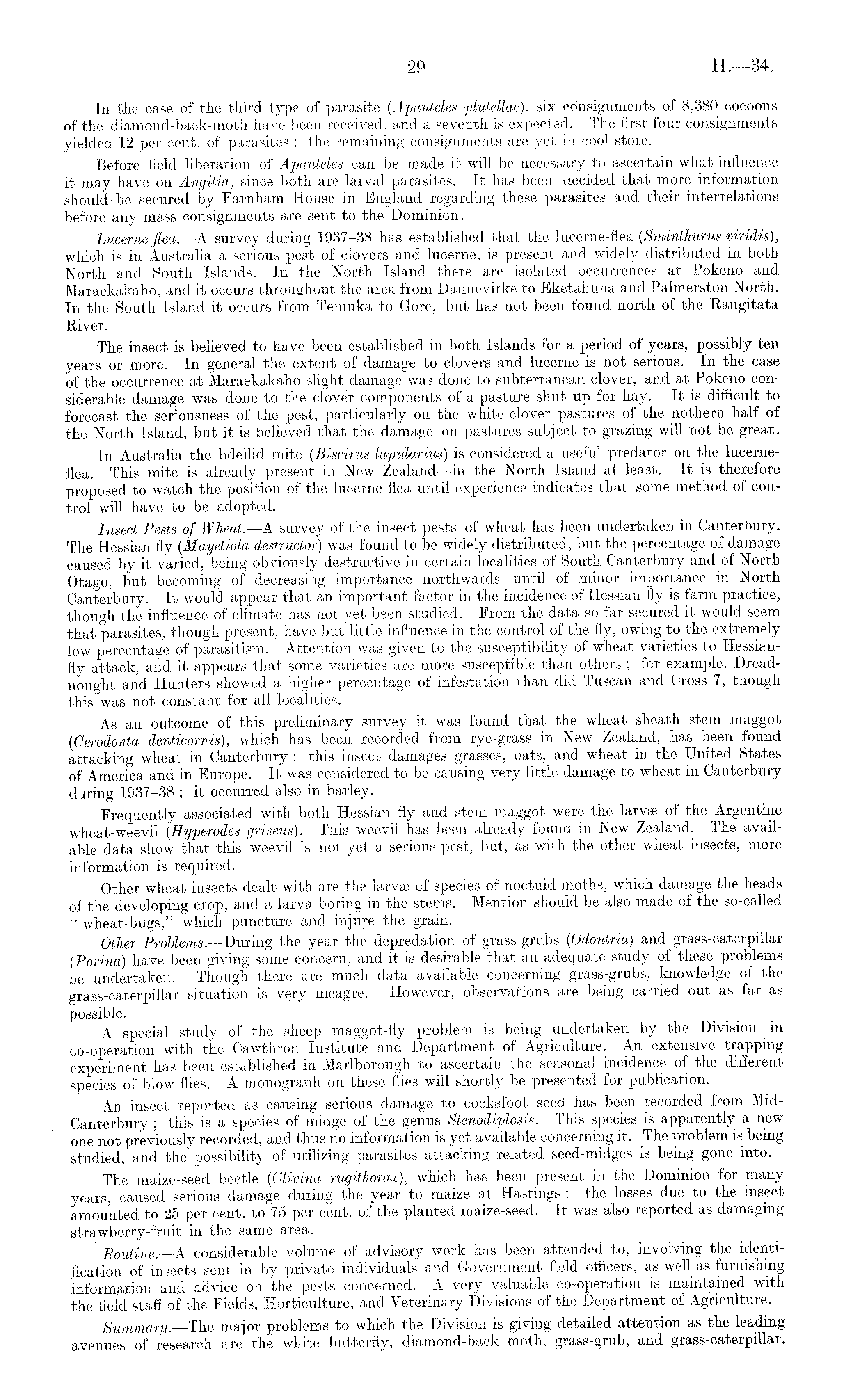In the case of the third type of parasite (Apanteles plutellae), six consignments of 8,380 cocoons of the diamond-back-moth have been received, and a seventh is expected. The first four consignments yielded 12 per cent, of parasites ; the remaining consignments are yet in cool store. Before field liberation of Apanteles can be made it will be necessary to ascertain what influence, it may have oil Angitia, since both are larval parasites. It has been decided that more information should be secured by Farnham House in England regarding these parasites and their interrelations before any mass consignments are sent to the Dominion. Lucerne-flea. : —A survey during 1937-38 has established that the lucerne-flea (Sminthurus viridis), which is in Australia a serious pest of clovers and lucerne, is present and widely distributed in both North and South Islands. In the North Island there are isolated occurrences at Pokeno and Maraekakaho, and it occurs throughout the area from Dannevirke to Eketahuna and Palmerston North. In the South Island it occurs from Temuka to Gore, but has not been found north of the Rangitata River. The insect is believed to have been established in both Islands for a period of years, possibly ten vears or more. In general the extent of damage to clovers and lucerne is not serious. In the case of the occurrence at Maraekakaho slight damage was done to subterranean clover, and at Pokeno considerable damage was done to the clover components of a pasture shut up for hay. It is difficult to forecast the seriousness of the pest, particularly on the white-clover pastures of the nothern half of the North Island, but it is believed that the damage on pastures subject to grazing will not be great. In Australia the bdellid mite (Biscirus lapidarius) is considered a useful predator on the lucerneflea. This mite is already present in New Zealand—in the North Island at least. It is therefore proposed to watch the position of the lucerne-flea until experience indicates that some method of control will have to be adopted. Insect Pests of Wheat. —A survey of the insect pests of wheat has been undertaken in Canterbury. The Hessian fly (.Mayetiola destructor) was found to be widely distributed, but the percentage of damage caused by it varied, being obviously destructive in certain localities of South Canterbury and of North Otago, but becoming of decreasing importance northwards until of minor importance in North Canterbury. It would appear that an important factor in the incidence of Hessian fly is farm practice, though the influence of climate has not yet been studied. From the data so far secured it would seem that, parasites, though present, have but little influence in the control of the fly, owing to the extremely low percentage of parasitism. Attention was given to the susceptibility of wheat varieties to Hessianfly attack, and it appears that some varieties are more susceptible than others ; for example, Dreadnought and Hunters showed a higher percentage of infestation than did Tuscan and Cross 7, though this was not constant for all localities. As an outcome of this preliminary survey it was found that the wheat sheath stem maggot (<Cerodonta denticornis), which has been recorded from rye-grass in New Zealand, has been found attacking wheat in Canterbury ; this insect damages grasses, oats, and wheat in the United States of America and in Europe. It was considered to be causing very little damage to wheat in Canterbury during 1937-38 ; it occurred also in barley. Frequently associated with both Hessian fly and stem maggot were the larvfe of the Argentine wheat-weevil (Hyperodes griseus). This weevil has been already found in New Zealand. The available data show that this weevil is not yet a serious pest, but, as with the other wheat insects, more information is required. Other wheat insects dealt with are the larvse of species of noctuid moths, which damage the heads of the developing crop, and a larva boring in the stems. Mention should be also made of the so-called " wheat-bugs," which puncture and injure the grain. Other Problems. —During the year the depredation of grass-grubs (Odontria) and grass-caterpillar (Porina) have been giving some concern, and it is desirable that an adequate study of these problems be undertaken. Though there are much data available concerning grass-grubs, knowledge of the grass-caterpillar situation is very meagre. However, observations are being carried out as far as possible. A special study of the sheep maggot-fly problem is being undertaken by the Division in co-operation with the Cawthron Institute and Department of Agriculture. An extensive trapping experiment has been established in Marlborough to ascertain the seasonal incidence of the different species of blow-flies. A monograph on these flies will shortly be presented for publication. An insect reported as causing serious damage to cocksfoot seed has been recorded from MidCanterbury ; this is a species of midge of the genus Stenodiplosis. This species is apparently a new one not previously recorded, and thus no information is yet available concerning it. The problem is being studied, and the possibility of utilizing parasites attacking related seed-midges is being gone into. The maize-seed beetle (Clivina rugithorax), which has been present in the Dominion for many years, caused serious damage during the year to maize at Hastings; the losses due to the insect amounted to 25 per cent, to 75 per cent, of the planted maize-seed. It was also reported as damaging strawberry-fruit in the same area. Routine. —A considerable volume of advisory work has been attended to, involving the identification of insects sent in by private individuals and Government field officers, as well as furnishing information and advice on the pests concerned. A very valuable co-operation is maintained with the field staff of the Fields, Horticulture, and Veterinary Divisions of the Department of Agriculture. 