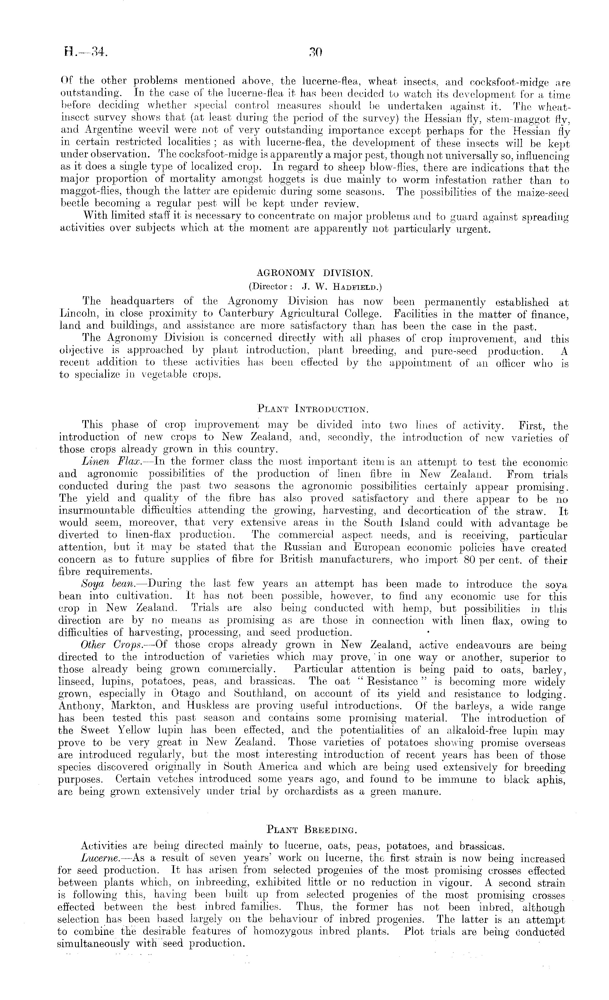 Of the other problems mentioned above, the lucerne-flea, wheat insects, and cocksfoot-midge are outstanding. In the case of the lucerne-flea it has been decided to watch its development for a time before deciding whether special control measures should be undertaken against it. The wheatinsect survey shows that (at least during the period of the survey) the Hessian fly, stem-maggot fly, and Argentine weevil were not of very outstanding importance except perhaps for the Hessian fly in certain restricted localities ; as with lucerne-flea, the development of these insects will be kept under observation. The cocksfoot-midge is apparently a maj or pest, though not universally so, influencing as it does a single type of localized crop. In regard to sheep blow-flies, there are indications that the major proportion of mortality amongst hoggets is due mainly to worm infestation rather than to maggot-flies, though the latter are epidemic during some seasons. The possibilities of the maize-seed beetle becoming a regular pest will be kept under review. With limited staff it is necessary to concentrate on major problems and to guard against spreading activities over subjects which at the moment are apparently not particularly urgent. AGRONOMY DIVISION. (Director : J. W. Hadfield.) The headquarters of the Agronomy Division has now been permanently established at Lincoln, in close proximity to Canterbury Agricultural College. Facilities in the matter of finance, land and buildings, and assistance are more satisfactory than has been the case in the past. The Agronomy Division is concerned directly with all phases of crop improvement, and this objective is approached by plant introduction, plant breeding, and pure-seed production. A recent addition to these activities has been effected by the appointment of an officer who is to specialize in vegetable crops. Plant Introduction. This phase of crop improvement may be divided into two lines of activity. First, the introduction of new crops to New Zealand, and, secondly, the introduction of new varieties of those crops already grown in this country. Linen Flax. —In the former class the most important item is an attempt to test the economic and agronomic possibilities of the production of linen fibre in New Zealand. From trials conducted during the past two seasons the agronomic possibilities certainly appear promising. The yield and quality of the fibre has also proved satisfactory and there appear to be no insurmountable difficulties attending the growing, harvesting, and decortication of the straw. It would seem, moreover, that very extensive areas in the South Island could with advantage be diverted to linen-flax production. The commercial aspect needs, and is receiving, particular attention, but it may be stated that the Russian and European economic policies have created concern as to future supplies of fibre for British manufacturers, who import 80 per cent, of their fibre requirements. Soya bean. —During the last few years an attempt has been made to introduce the soya bean into cultivation. It has not been possible, however, to find any economic use for this crop in New Zealand. Trials are also being conducted with hemp, but possibilities in this direction are by no means as promising as are those in connection with linen flax, owing to difficulties of harvesting, processing, and seed production. Other Crops. —Of those crops already grown in New Zealand, active endeavours are being directed to the introduction of varieties which may prove, 'in one way or another, superior to those already being grown commercially. Particular attention is being paid to oats, barley, linseed, lupins, potatoes, peas, and brassicas. The oat " Resistance" is becoming more widely grown, especially in Otago and Southland, on account of its yield and resistance to lodging. Anthony, Markton, and Huskless are proving useful introductions. Of the barleys, a wide range has been tested this past season and contains some promising material. The introduction of the Sweet Yellow lupin has been effected, and the potentialities of an alkaloid-free lupin may prove to be very great in New Zealand. Those varieties of potatoes showing promise overseas are introduced regularly, but the most interesting introduction of recent years has been of those species discovered originally in South America and which are being used extensively for breeding purposes. Certain vetches introduced some years ago, and found to be immune to black aphis, are being grown extensively under trial by orchardists as a green manure. Plant Breeding. Activities are being directed mainly to lucerne, oats, peas, potatoes, and brassicas. Lucerne. —.As a result of seven years' work on lucerne, the first strain is now being increased for seed production. It has arisen from selected progenies of the most promising crosses effected between plants which, on inbreeding, exhibited little or no reduction in vigour. A second strain is following this, having been built up from selected progenies of the most promising crosses effected between the best inbred families. Thus, the former has not been inbred, although selection has been based largely on the behaviour of inbred progenies. The latter is an attempt to combine the desirable features of homozygous inbred plants. Plot trials are being Conducted simultaneously with seed production.