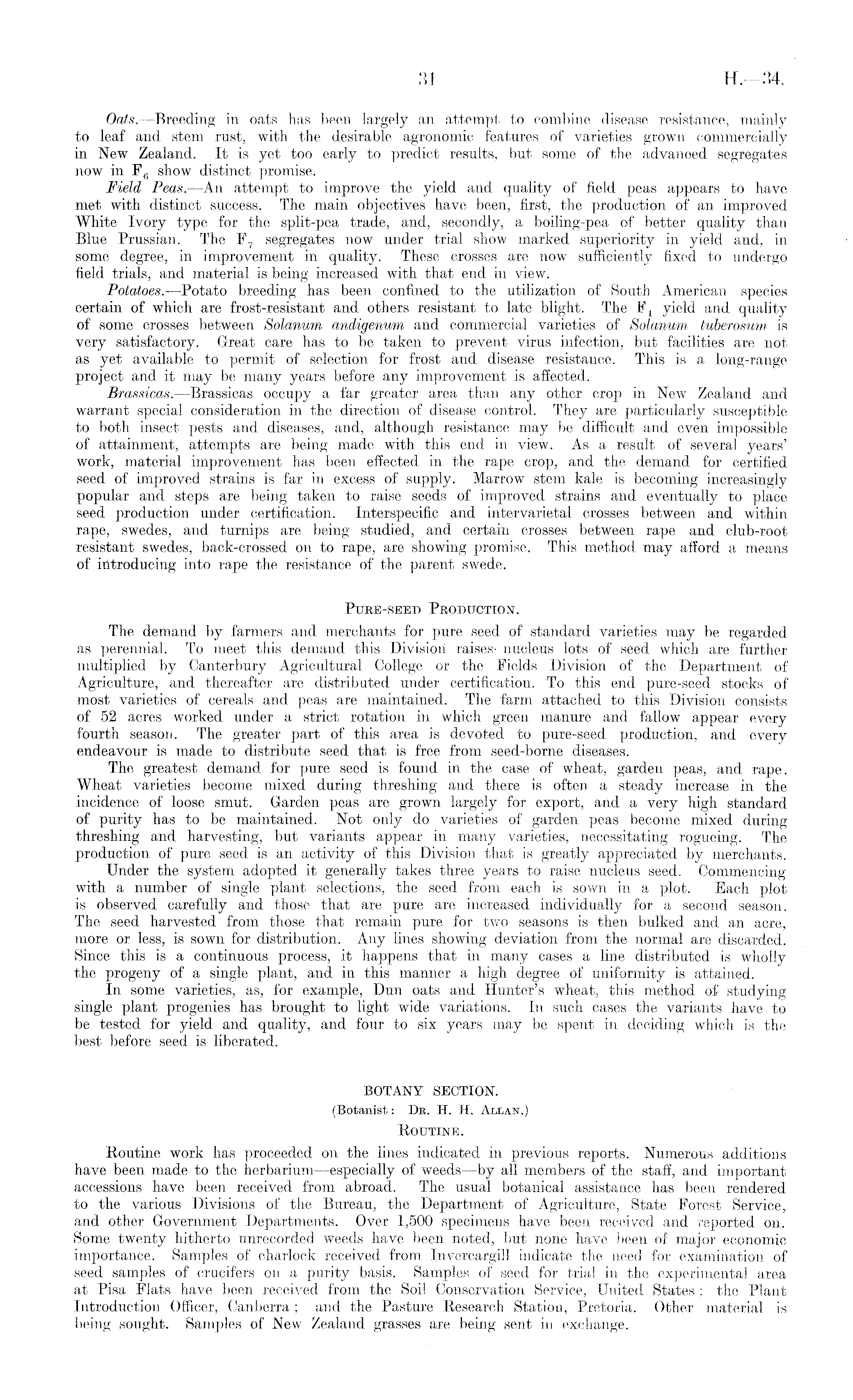 Oats. —Breeding in oats has been largely an attempt to combine disease resistance, mainly to leaf and stem rust, with the desirable agronomic features of varieties grown commercially in New Zealand. It is yet too early to predict results, but some of the advanoed segregates now in F s show distinct promise. Field Peas.—An attempt to improve the yield and quality of field peas appears to have met with distinct success. The main objectives have been, first, the production of an improved White Ivory type for the split-pea trade, and, secondly, a boiling-pea of better quality than Blue Prussian. The F 7 segregates now under trial show marked superiority in yield and, in some degree, in improvement in quality. These crosses are now sufficiently fixed to undergo field trials, and material is being increased with that end in view. Potatoes. —Potato breeding has been confined to the utilization of South American species certain of which are frost-resistant and others resistant to late blight. The Fj yield and quality of some crosses between Solanum andigenum and commercial varieties of Solanum. tuberosum, is very satisfactory. Great care has to be taken to prevent virus infection, but facilities are not as yet available to permit of selection for frost and disease resistance. This is a long-range project and it may be many years before any improvement is affected. Brassicas.— Brassicas occupy a far greater area than any other crop in New Zealand and warrant special consideration in the direction of disease control. They are particularly susceptible to both insect pests and diseases, and, although resistance may be difficult and even impossible of attainment, attempts are being made with this end in view. As a result of several years' work, material improvement has been effected in the rape crop, and the demand for certified seed of improved strains is far in excess of supply. Marrow stem kale is becoming increasingly popular and steps are being taken to raise seeds of improved strains and eventually to place seed production under certification. Interspecific and intervarietal crosses between and within rape, swedes, and turnips are being studied, and certain crosses between rape and club-root resistant swedes, back-crossed on to rape, are showing promise. This method may afford a means of introducing into rape the resistance of the parent swede. Pure-seed Production. The demand by farmers and merchants for pure seed of standard varieties may be regarded as perennial. To meet this demand this Division raises' nucleus lots of seed which are further multiplied by Canterbury Agricultural College or the Fields Division of the' Department of Agriculture, and thereafter are distributed under certification. To this end pure-seed stocks of most varieties of cereals and peas are maintained. The farm attached to this Division consists of 52 acres worked under a strict rotation in which green manure and fallow appear every fourth season. The greater part of this area is devoted to pure-seed production, and every endeavour is made to distribute seed that is free from seed-borne diseases. The greatest demand for pure seed is found in the case of wheat, garden peas, and rape. Wheat varieties become mixed during threshing and there is often a steady increase in the incidence of loose smut. Garden peas are grown largely for export, and a very high standard of purity has to be maintained. Not only do varieties of garden peas become mixed during threshing and harvesting, but variants appear in many varieties, necessitating rogueing. The production of pure seed is an activity of this Division that is greatly appreciated by merchants. Under the system adopted it generally takes three years to raise nucleus seed. Commencing with a number of single plant selections, the seed from each is sown in a plot. Each plot is observed carefully and those that are pure are increased individually for a second season. The seed harvested from those that remain pure for two seasons is then bulked and an acre, more or less, is sown for distribution. Any lines showing deviation from the normal are discarded. Since this is a continuous process, it happens that in many cases a line distributed is wholly the progeny of a single plant, and in this manner a high degree of uniformity is attained. In some varieties, as, for example, Dun oats and Hunter's wheat, this method of studying single plant progenies has brought to light wide variations. In such cases the variants have to be tested for yield and quality, and four to six years may be spent in deciding which is the best before seed is liberated. BOTANY SECTION. (Botanist: Db. H. H. Allan.) Routine. Routine work has proceeded on the lines indicated in previous reports. Numerous additions have been made to the herbarium —especially of weeds —by all members of the staff, and important accessions have been received from abroad. The usual botanical assistance has been rendered to the various Divisions of the Bureau, the Department of Agriculture, State Forest Service, and other Government Departments. Over 1,500 specimens have been received and reported on. Some twenty hitherto unrecorded weeds have been noted, but none have been of major economic importance. Samples of charlock received from Invercargill indicate the need for examination of seed samples of crucifers on a purity basis. Samples of seed for trial in the experimental area at Pisa Flats have been received from the Soil Conservation Service, United States ; the Plant Introduction Officer, Canberra ; and the Pasture Research Station, Pretoria. Other material is being sought. Samples of New Zealand grasses are being sent in exchange.
