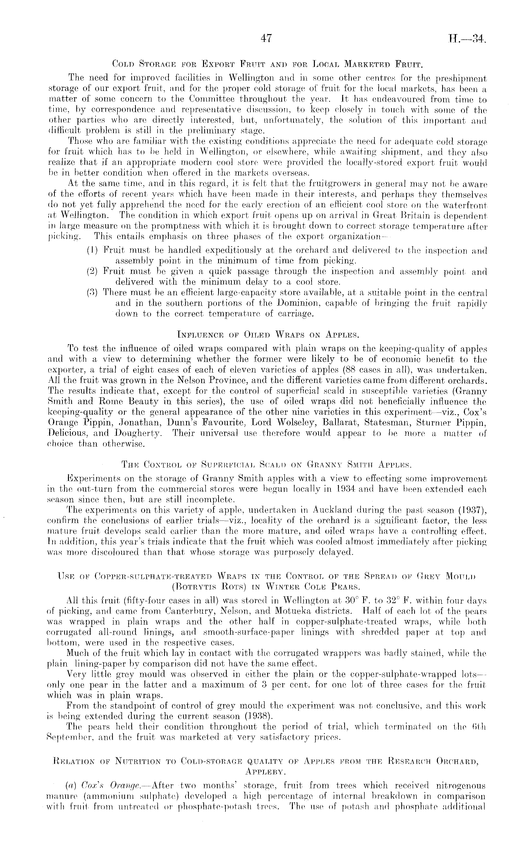 Cold Storage foe Export Fruit and for Local Marketed Fruit. The need for improved facilities in Wellington and in some other centres for the preshipment storage of our export fruit, and for the proper cold storage of fruit for the local markets, has been a matter of some concern to the Committee throughout the year. It has endeavoured from time to time, by correspondence and representative discussion, to keep closely in touch with some of the other parties who are directly interested, but, unfortunately, the solution of this important and difficult problem is still in the preliminary stage. Those who are familiar with the existing conditions appreciate the need for adequate cold storage for fruit which has to be held in Wellington, or elsewhere, while awaiting shipment, and they also realize that if an appropriate modern cool store were provided the locally-stored export fruit would be in better condition when offered in the markets overseas. At the same time, and in this regard, it is felt that the fruitgrowers in general may not be aware of the efforts of recent years which have been made in their interests, and perhaps they themselves do not yet fully apprehend the need for the early erection of an efficient cool store on the waterfront at Wellington. The condition in which export fruit opens up on arrival in Great Britain is dependent in large measure on the promptness with which it is brought down to correct storage temperature after picking. This entails emphasis on three phases of the export organization— (1) Fruit must be handled expeditiously at the orchard and delivered to the inspection and assembly point in the minimum of time from picking. (2) Fruit must be given a quick passage through the inspection and assembly point and delivered with the minimum delay to a cool store. (3) There must be an efficient large-capacity store available, at a suitable point in the central and in the southern portions of the Dominion, capable of bringing the fruit rapidly down to the correct temperature of carriage. Influence of Oiled Wraps on Apples. To test the influence of oiled wraps compared with plain wraps on the keeping-quality of apples and with a view to determining whether the former were likely to be of economic benefit to the exporter, a trial of eight cases of each of eleven varieties of apples (88 cases in all), was undertaken. All the fruit was grown in the Nelson Province, and the different varieties came from different orchards. The results indicate that, except for the control of superficial scald in susceptible varieties (Granny Smith and Rome Beauty in this series), the use of oiled wraps did not beneficially influence the keeping-quality or the general appearance of the other nine varieties in this experiment —viz., Cox's Orange Pippin, Jonathan, Dunn's Favourite, Lord Wolseley, Ballarat, Statesman, Sturmer Pippin, Delicious, and Dougherty. Their universal use therefore would appear to be more a matter of choice than otherwise. The Control of Superficial Scald on Granny Smith Apples. Experiments on the storage of Granny Smith apples with a view to effecting some improvement in the out-turn from the commercial stores were begun locally in 1934 and have been extended each season since then, but are still incomplete. The experiments on this variety of apple, undertaken in Auckland during the past season (1937), confirm the conclusions of earlier trials —viz., locality of the orchard is a significant factor, the less mature fruit develops scald earlier than the more mature, and oiled wraps have a controlling effect. In addition, this year's trials indicate that the fruit which was cooled almost immediately after picking was more discoloured than that whose storage was purposely delayed. Use. of Copper-sulphate-treated Wraps in the Control of the Spread of Grey Mould (Botrytis Rots) in Winter Cole Pears. All this fruit (fifty-four cases in all) was stored in Wellington at 30° F. to 32° F. within four days of picking, and came from Canterbury, Nelson, and Motueka districts. Half of each lot of the pears was wrapped in plain wraps and the other half in copper-sulphate-treated wraps, while both corrugated all-round linings, and smooth-surface-paper linings with shredded paper at top and bottom, were used in the respective cases. Much of the fruit which lay in contact with the corrugated wrappers was badly stained, while the plain lining-paper by comparison did not have the same effect. Very little grey mould was observed in either the plain or the copper-sulphate-wrapped lots — only one pear in the latter and a maximum of 3 per cent, for one lot of three cases for the fruit which was in plain wraps. From the standpoint of control of grey mould the experiment was not conclusive, and this work is being extended during the current season (1938). The pears held their condition throughout the period of trial, which terminated on the 6th September, and the fruit was marketed at very satisfactory prices. Relation of Nutrition to Cold-storage quality of Apples from the Research Orchard, Appleby. (a) Cox's Orange. —After two months' storage, fruit from trees which received nitrogenous manure (ammonium sulphate) developed a high percentage of internal breakdown in comparison with fruit from untreated or phosphate-potash trees. The use of potash and phosphate additional
