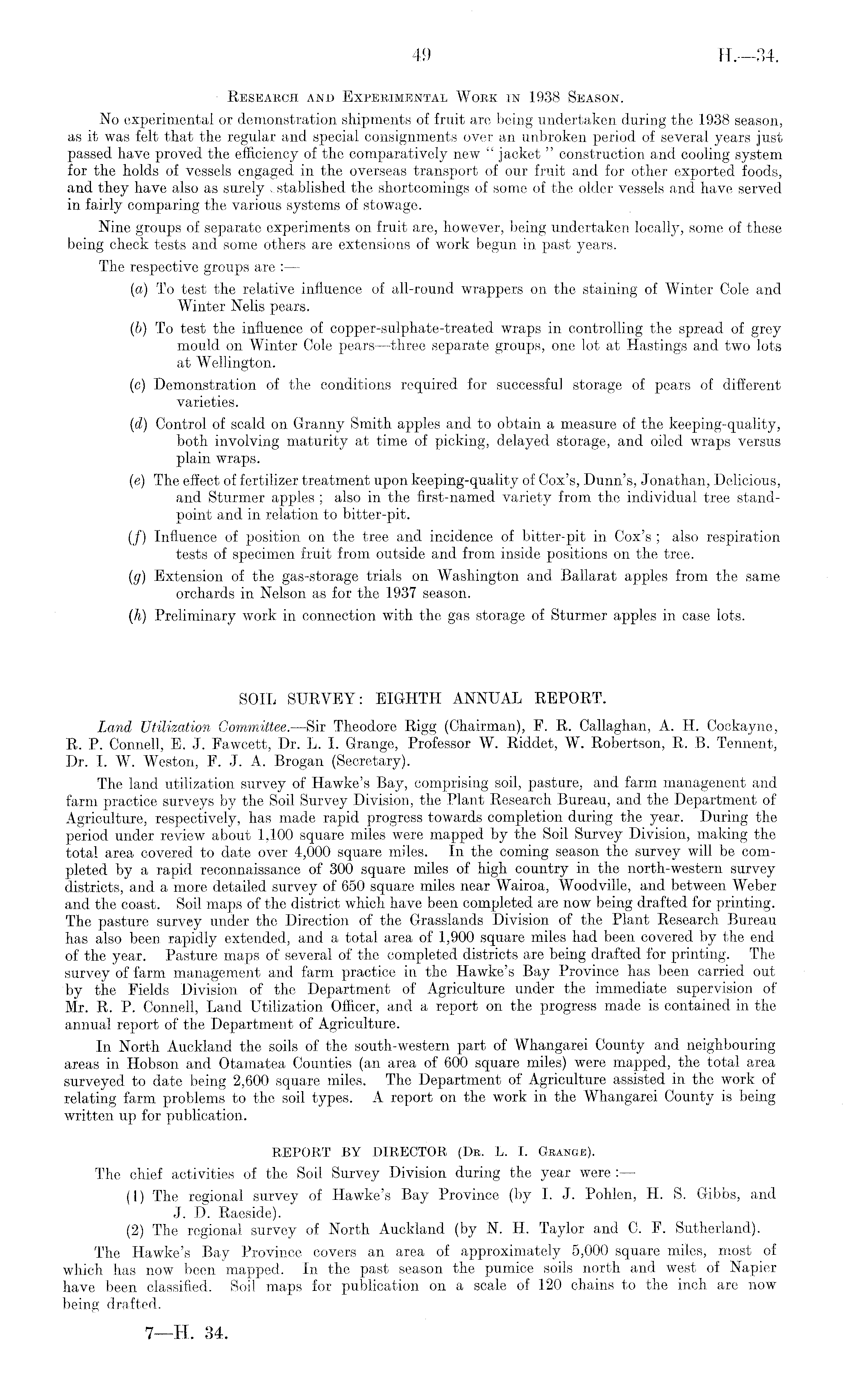 Research and Experimental Work in 1938 Season. No experimental or demonstration shipments of fruit are being undertaken during the 1938 season, as it was felt that the regular and special consignments over an unbroken period of several years just passed have proved the efficiency of the comparatively new " jacket " construction and cooling system for the holds of vessels engaged in the overseas transport of our fruit and for other exported foods, and they have also as surely established the shortcomings of some of the older vessels and have served in fairly comparing the various systems of stowage. Nine groups of separate experiments on fruit are, however, being undertaken locally, some of these being check tests and some others are extensions of work begun in past years. The respective groups are : — (a) To test the relative influence of all-round wrappers on the staining of Winter Cole and Winter Nelis pears. (b) To test the influence of copper-sulphate-treated wraps in controlling the spread of grey mould on Winter Cole pears —three separate groups, one lot at Hastings and two lots at Wellington. (c) Demonstration of the conditions required for successful storage of pears of different varieties. (d) Control of scald on Granny Smith apples and to obtain a measure of the keeping-quality, both involving maturity at time of picking, delayed storage, and oiled wraps versus plain wraps. (e) The effect of fertilizer treatment upon keeping-quality of Cox's, Dunn's, Jonathan, Delicious, and Sturmer apples ; also in the first-named variety from the individual tree standpoint and in relation to bitter-pit. (/) Influence of position on the tree and incidence of bitter-pit in Cox's ; also respiration tests of specimen fruit from outside and from inside positions on the tree. (g) Extension of the gas-storage trials on Washington and Ballarat apples from the same orchards in Nelson as for the 1937 season. (h) Preliminary work in connection with the gas storage of Sturmer apples in case lots. SOIL SURVEY: EIGHTH ANNUAL REPORT. Land Utilization Committee. —Sir Theodore Rigg (Chairman), E. R. Callaghan, A. H. Cockayne, R. P. Connell, E. J. Eawcett, Dr. L. I. Grange, Professor W. Riddet, W. Robertson, R. B. Tennent, Dr. I. W. Weston, E. J. A. Brogan (Secretary). The land utilization survey of Hawke's Bay, comprising soil, pasture, and farm managenent and farm practice surveys by the Soil Survey Division, the Plant Research Bureau, and the Department of Agriculture, respectively, has made rapid progress towards completion during the year. During the period under review about 1,100 square miles were mapped by the Soil Survey Division, making the total area covered to date over 4,000 square miles. In the coming season the survey will be completed by a rapid reconnaissance of 300 square miles of high country in the north-western survey districts, and a more detailed survey of 650 square miles near Wairoa, Woodville, and between Weber and the coast. Soil maps of the district which have been completed are now being drafted for printing. The pasture survey under the Direction of the Grasslands Division of the Plant Research Bureau has also been rapidly extended, and a total area of 1,900 square miles had been covered by the end of the year. Pasture maps of several of the completed districts are being drafted for printing. The survey of farm management and farm practice in the Hawke's Bay Province has been carried out by the Fields Division of the Department of Agriculture under the immediate supervision of Mr. R. P. Connell, Land Utilization Officer, and a report on the progress made is contained in the annual report of the Department of Agriculture. In North Auckland the soils of the south-western part of Whangarei County and neighbouring areas in Hobson and Otamatea Counties (an area of 600 square miles) were mapped, the total area surveyed to date being 2,600 square miles. The Department of Agriculture assisted in the work of relating farm problems to the soil types. A report on the work in the Whangarei County is being written up for publication. REPORT BY DIRECTOR (DR. L. I. Grange). The chief activities of the Soil Survey Division during the year were : — (1) The regional survey of Hawke's Bay Province (by I. J. Pohlen, H. S. Gibbs, and J. D. Raeside). (2) The regional survey of North Auckland (by N. H. Taylor and C. F. Sutherland). The Hawke's Bay Province covers an area of approximately 5,000 square miles, most of which has now been mapped. In the past season the pumice soils north and west of Napier have been classified. Soil maps for publication on a scale of 120 chains to the inch are now being drafted.