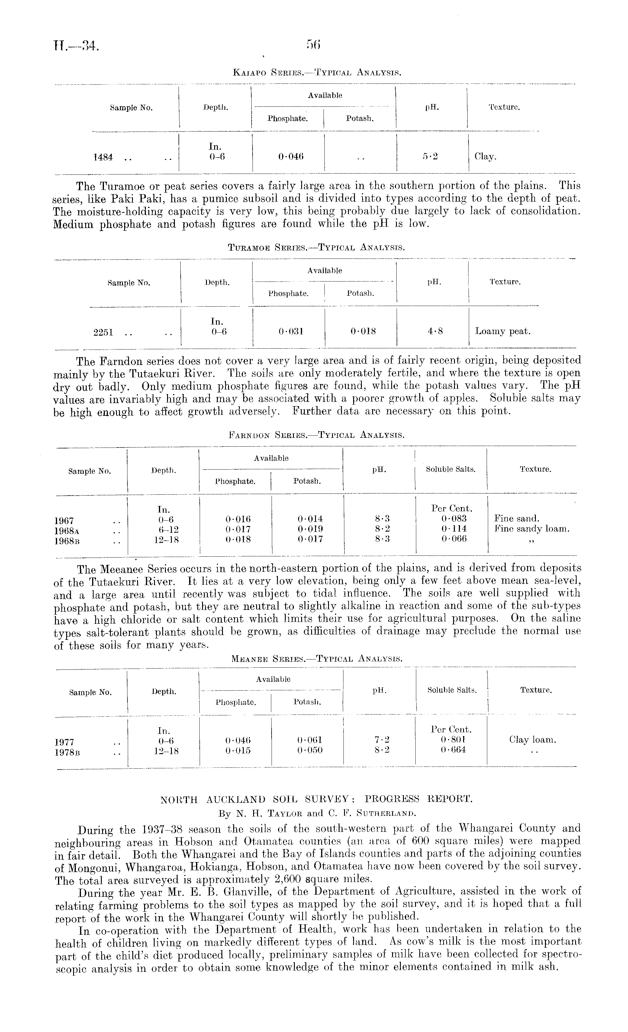 NORTH AUCKLAND SOIL SURVEY: PROGRESS REPORT. By N. H. Taylor and C. P. Sutherland. During the 1937-38 season the soils of the south-western part of the Whangarei County and neighbouring areas in Hobson and Otamatea counties (an area of 600 square miles) were mapped in fair detail. Both the Whangarei and the Bay of Islands counties and parts of the adjoining counties of Mongonui, Whangaroa, Hokianga, Hobson, and Otamatea have now been covered by the soil survey. The total area surveyed is approximately 2,600 square miles. During the year Mr. E. B. Glanville, of the Department of Agriculture, assisted in the work of relating farming problems to the soil types as mapped by the soil survey, and it is hoped that a full report of the work in the Whangarei County will shortly be published. In co-operation with the Department of Health, work has been undertaken in relation to the health of children living on markedly different types of land. As cow's milk is the most important part of the child's diet produced locally, preliminary samples of milk have been collected for spectroscopic analysis in order to obtain some knowledge of the minor elements contained in milk ash.